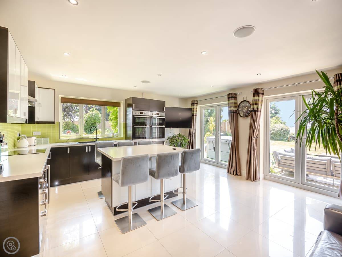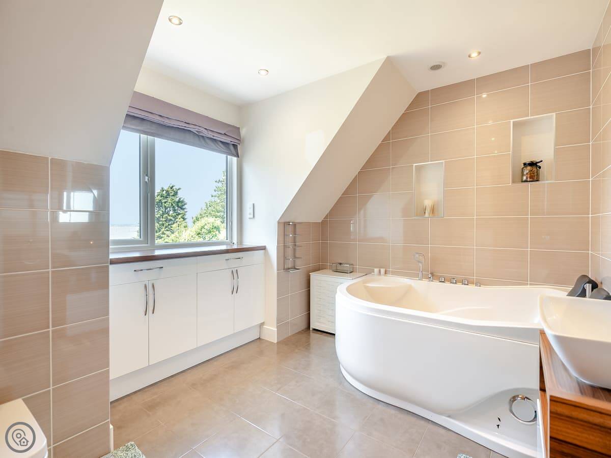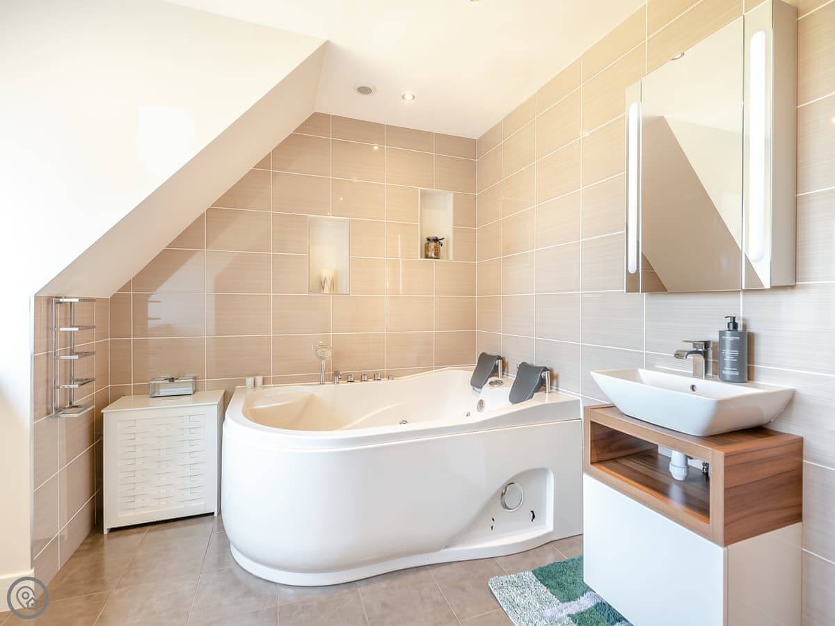 Outside, there's a large garden with lawn. It has a play area for kids, and a patio with a hot tub. The big thing is that the garden leads directly onto a quiet, sandy beach. You don't have to drive anywhere, you just walk down.