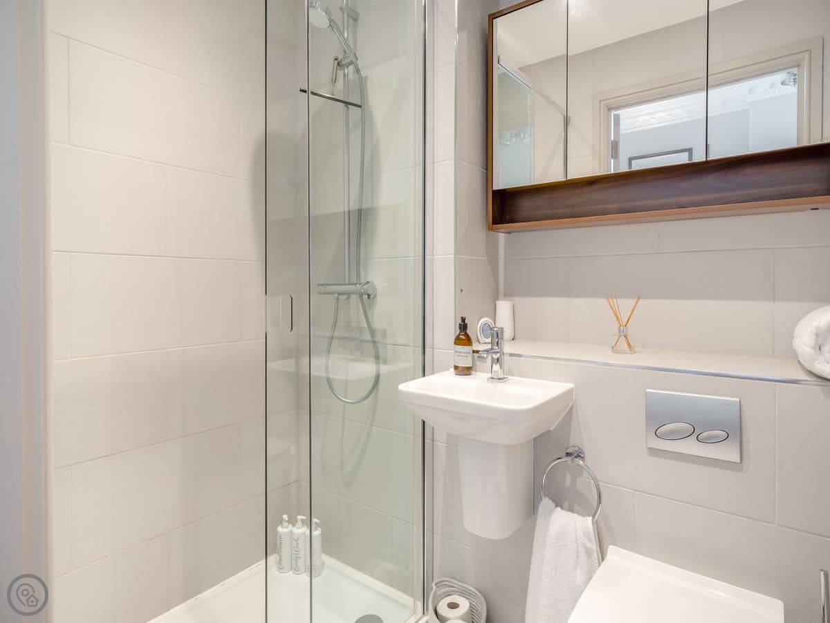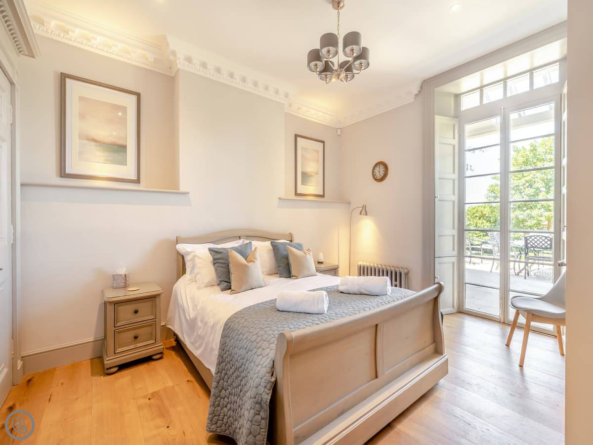 It sleeps four. There are two bedrooms and two bathrooms. One bedroom has an en-suite shower and its own door out to a big terrace. The other bedroom has a super king size bed that can be split into two singles if you need. The second bathroom has a proper bath with a shower over it.