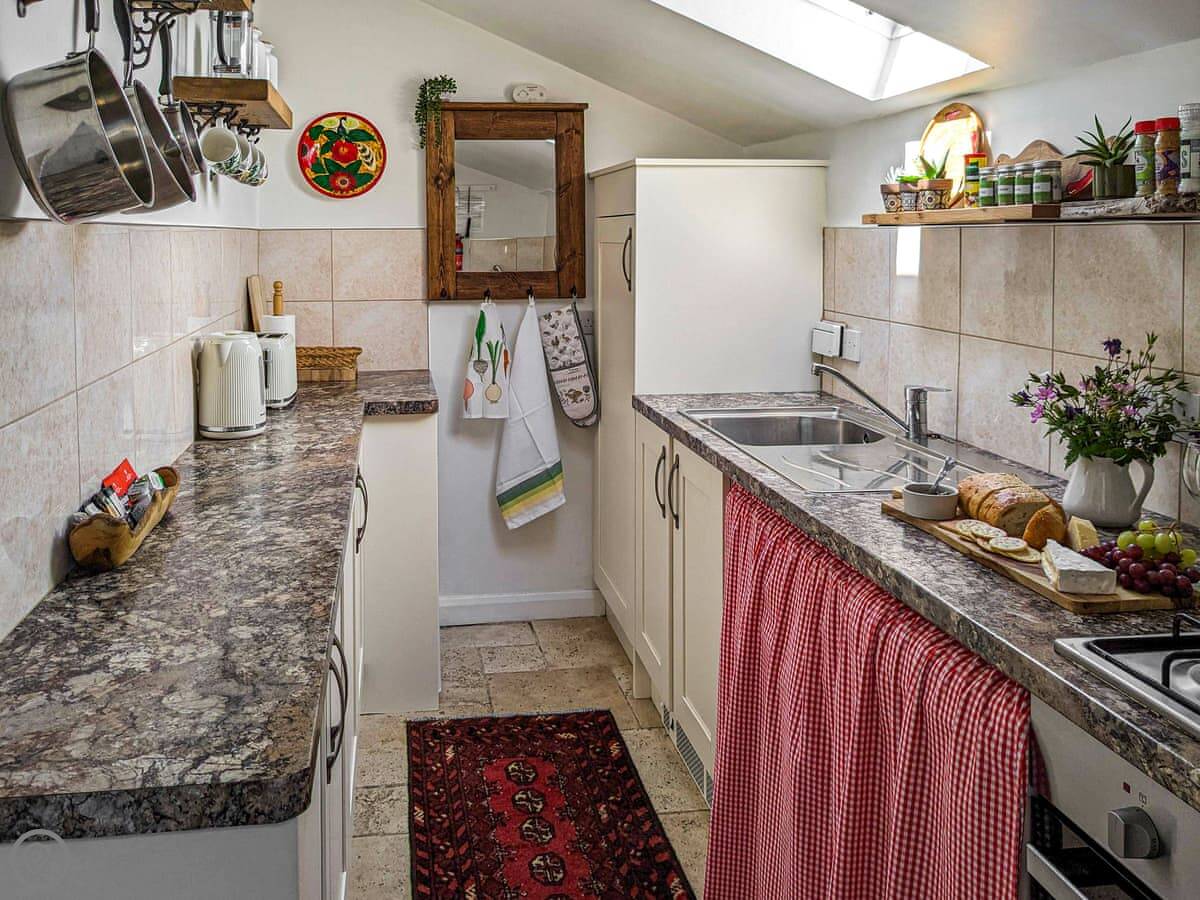 The stairs inside are steep and narrow, as you’d expect. There’s a wood burner in the main room, which is nice in the evening. The floor in there is stone, so it can feel cool. The kitchen is separate, down a couple of steps. It’s a galley kitchen, so it’s a bit narrow but it has what you need.