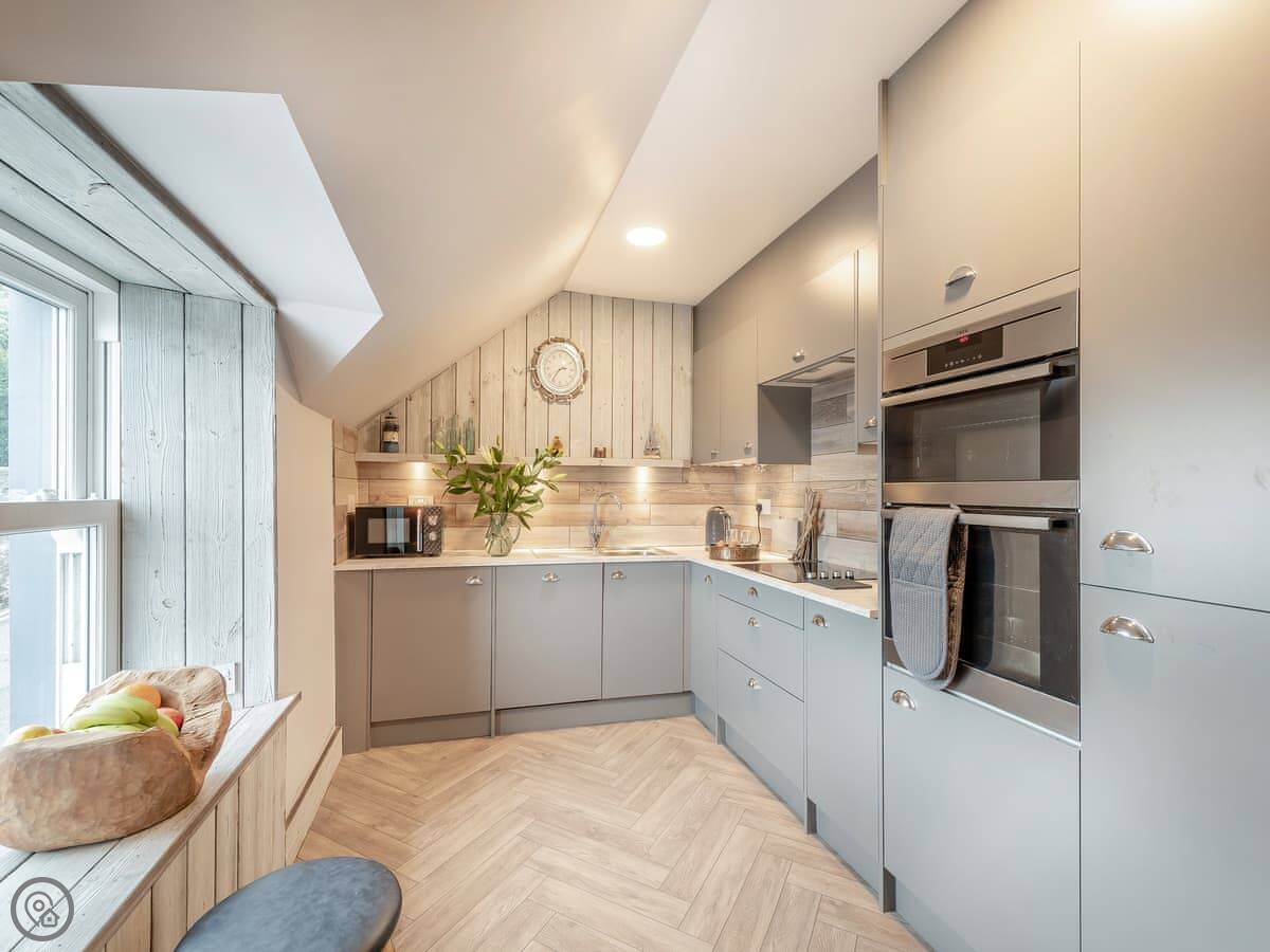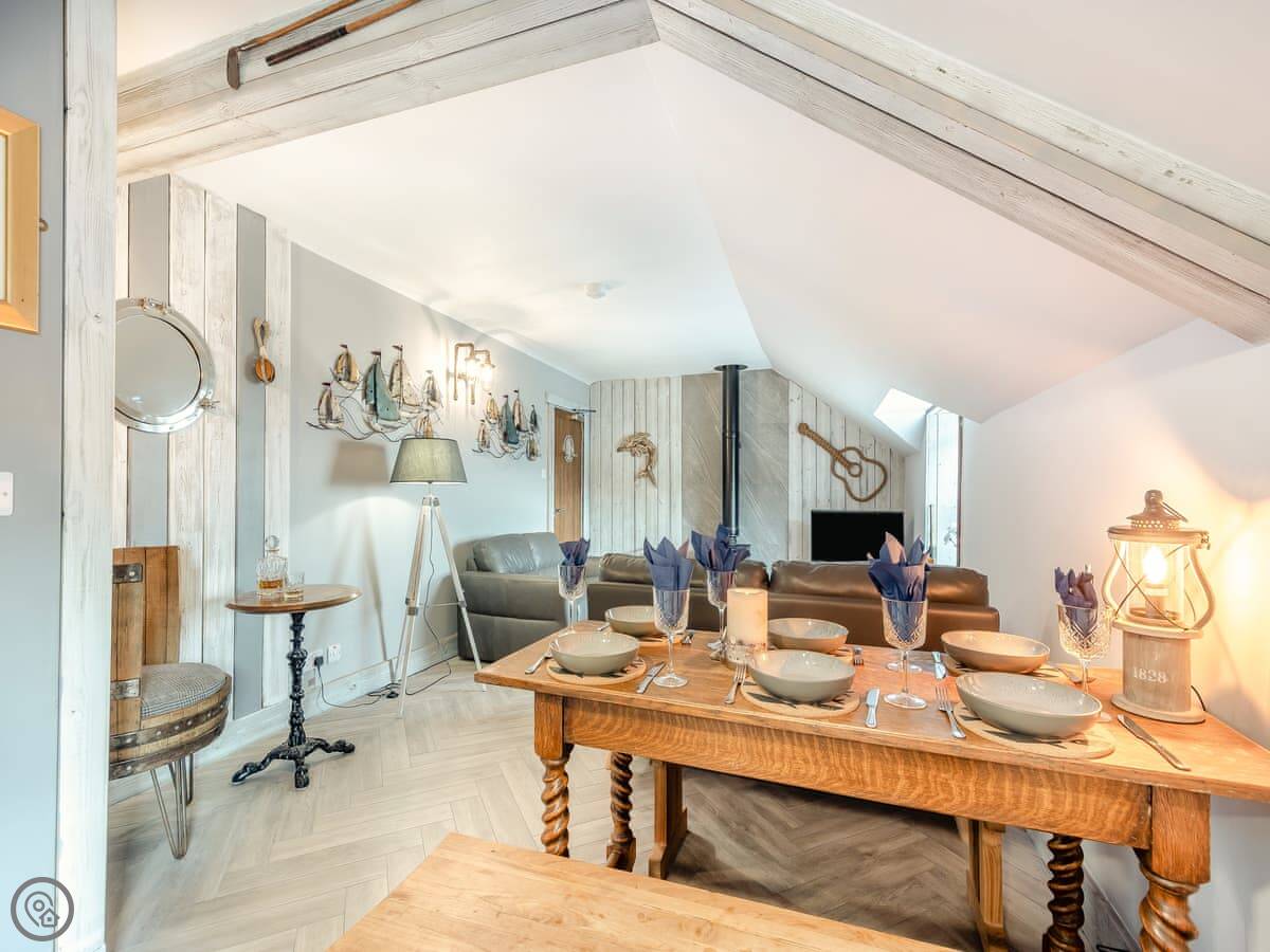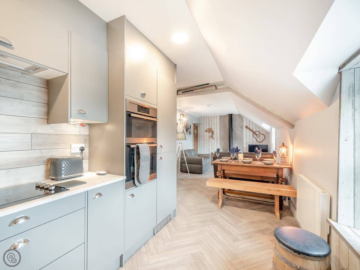 The living room has a wood burner. The kitchen has what you need. There's a dishwasher and a washing machine. Bedding and towels are included. You can bring one dog.