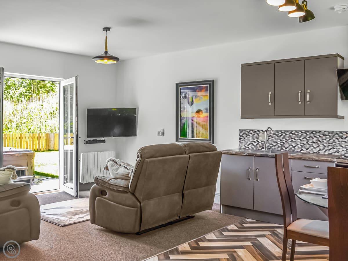 The main room is open plan. Kitchen at one end, dining table and sofas at the other. It’s a good space. Everything looks out at the water. It’s a four-star place, so it’s well equipped and comfortable. It has a hot tub.