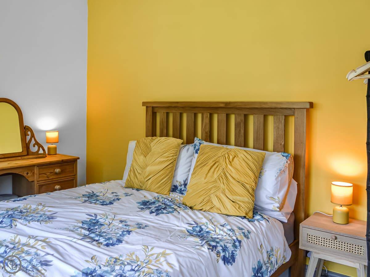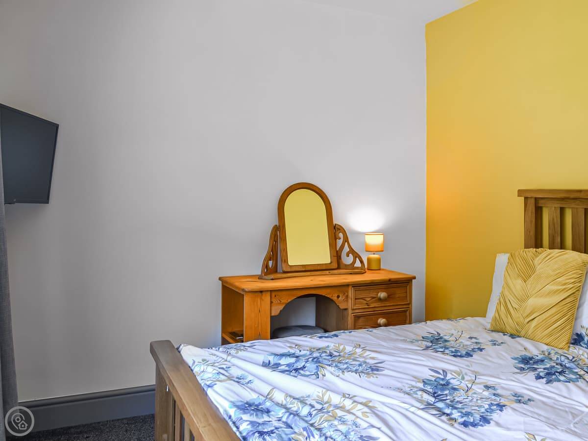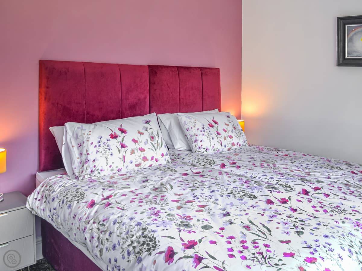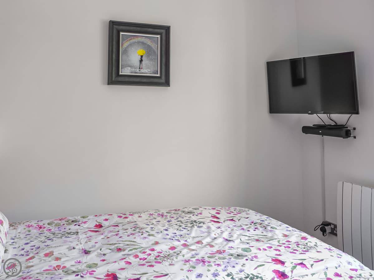 It sleeps four in two bedrooms. One is a proper double, the other is a super king that can be made into two singles if you prefer. Both have TVs. There's one bathroom with a walk-in shower, and the double bedroom also has its own bath.