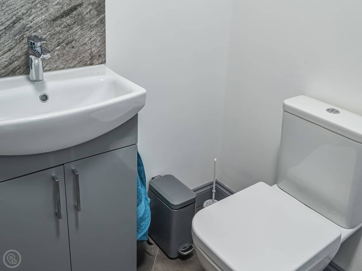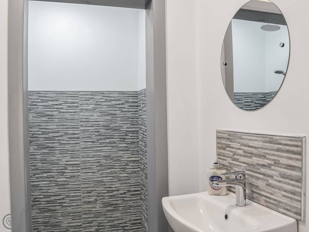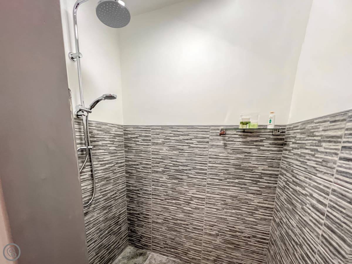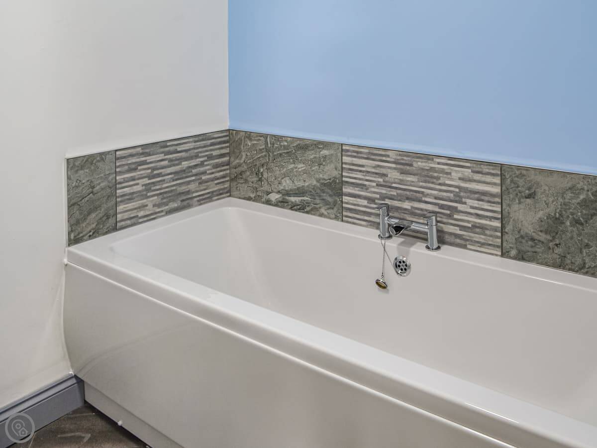 It sleeps four in two bedrooms. One is a proper double, the other is a super king that can be made into two singles if you prefer. Both have TVs. There's one bathroom with a walk-in shower, and the double bedroom also has its own bath.