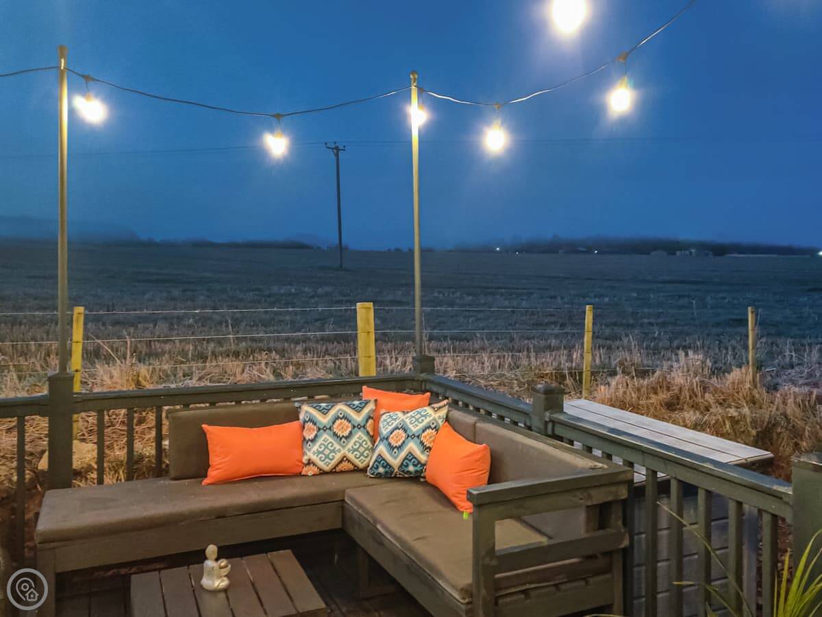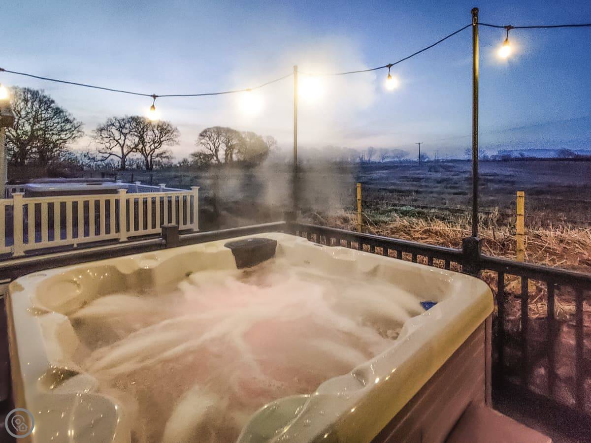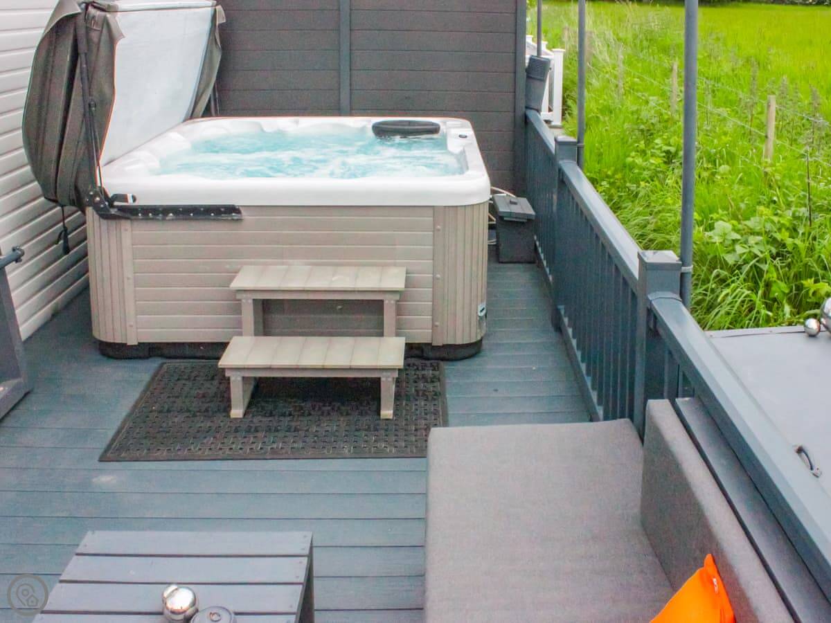 The main thing is the veranda. It's L-shaped with seating, and it looks out over the fields. That's where the hot tub is. It's ready for you when you arrive.