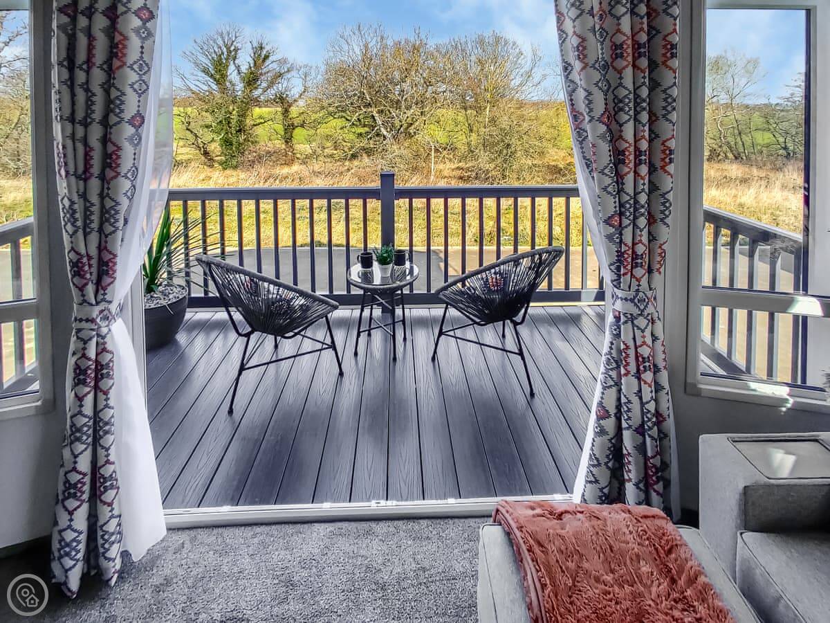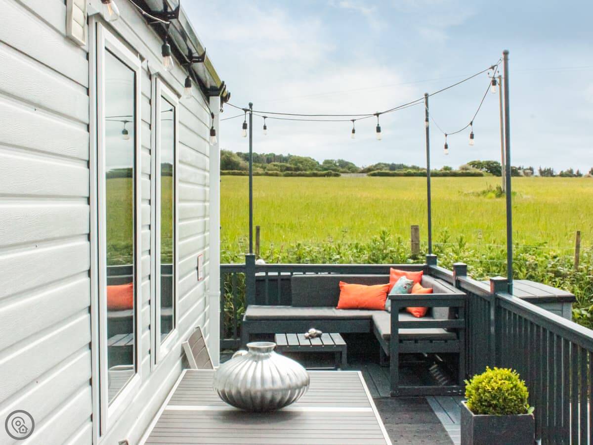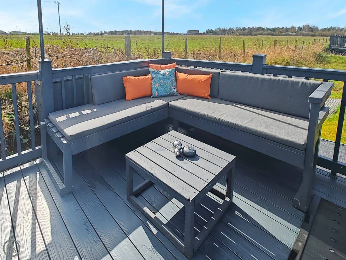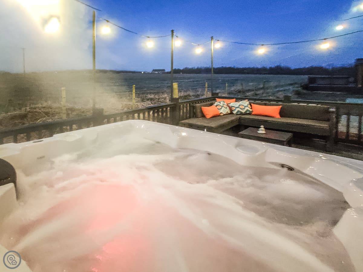 The main thing is the veranda. It's L-shaped with seating, and it looks out over the fields. That's where the hot tub is. It's ready for you when you arrive.