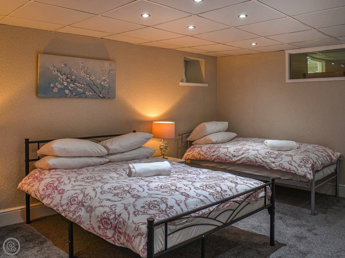 The main bedroom has a double bed and a single bed. The living area has another single bed, a single trundle bed underneath it, and two single sofa beds. The sofa beds are only suitable for children. The place has a 3 Star rating, so it's clean and functional.