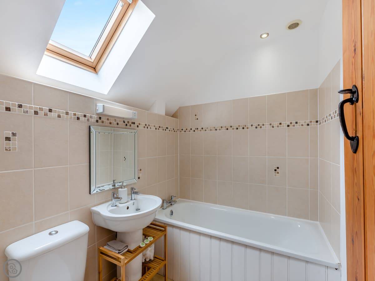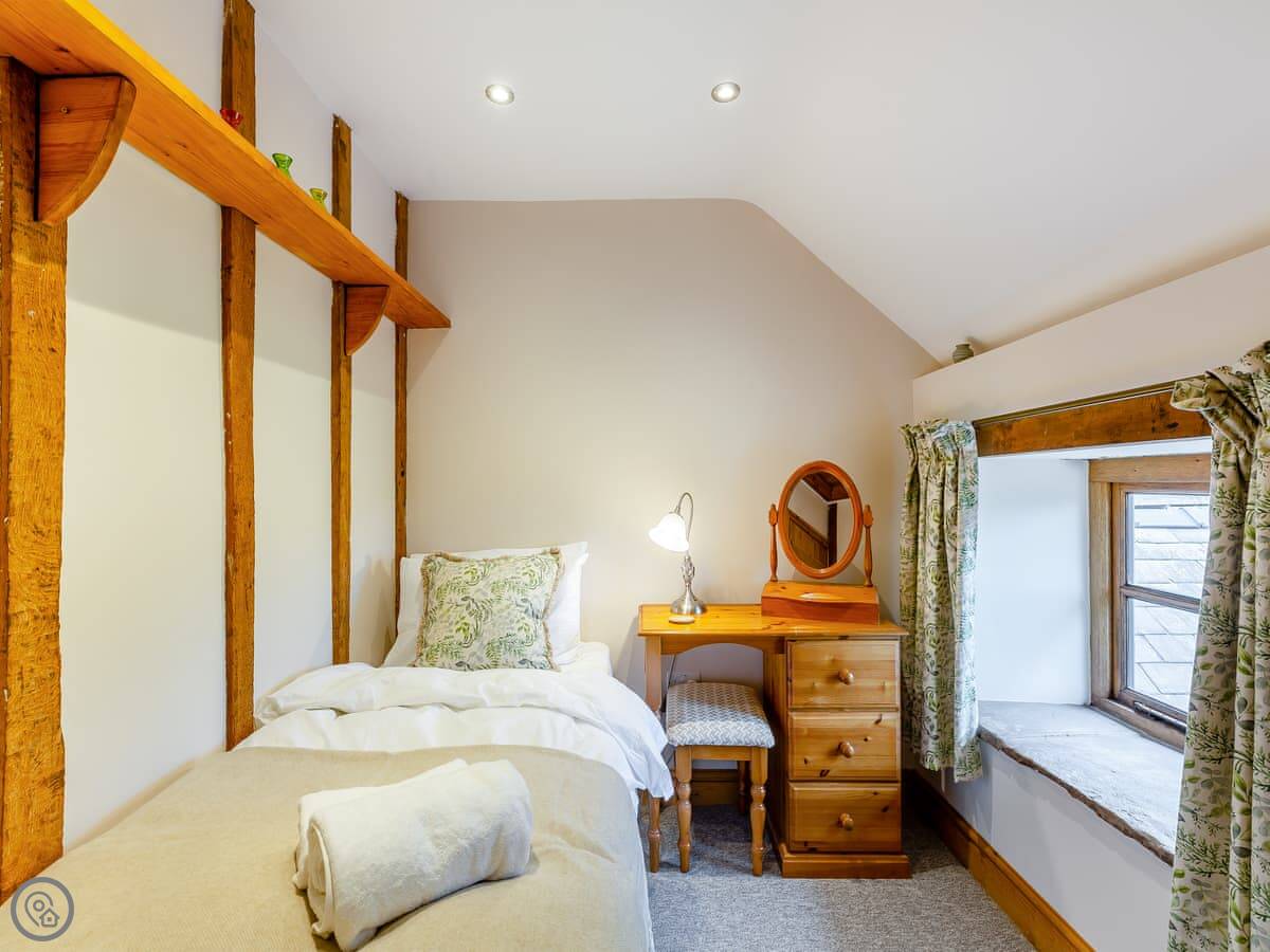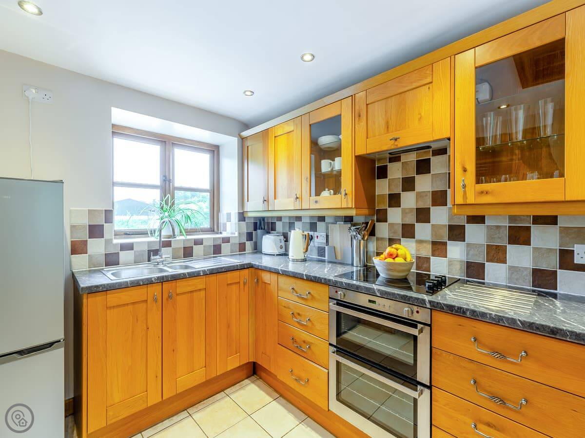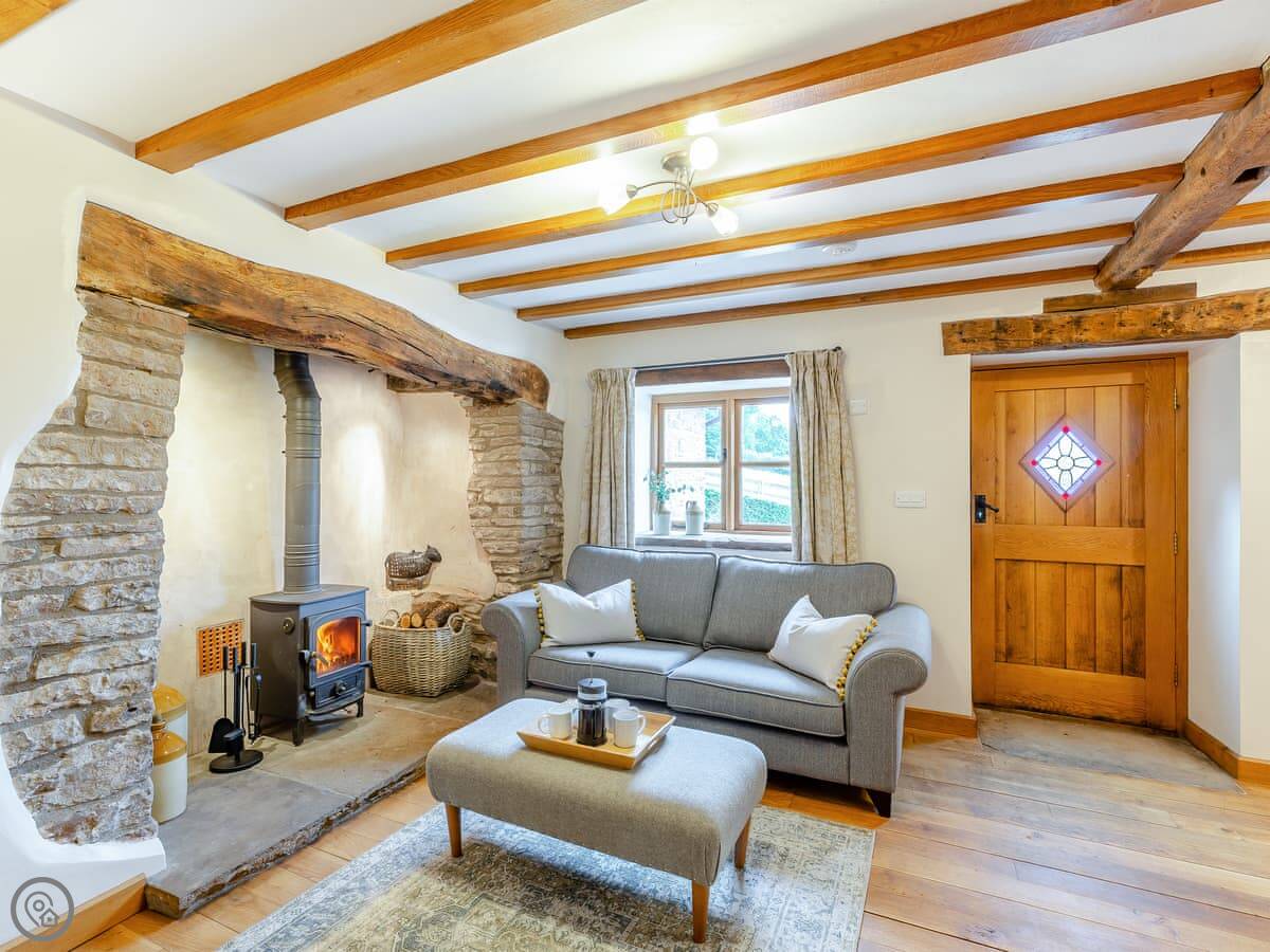 It sleeps three people. Two bedrooms, two bathrooms. The rating is 4 Star. It's comfortable, not modern. You come in through the kitchen, which has the old slab floor. The sitting room has the original bread oven in the wall and a wood burner. The stairs are old and a bit steep.