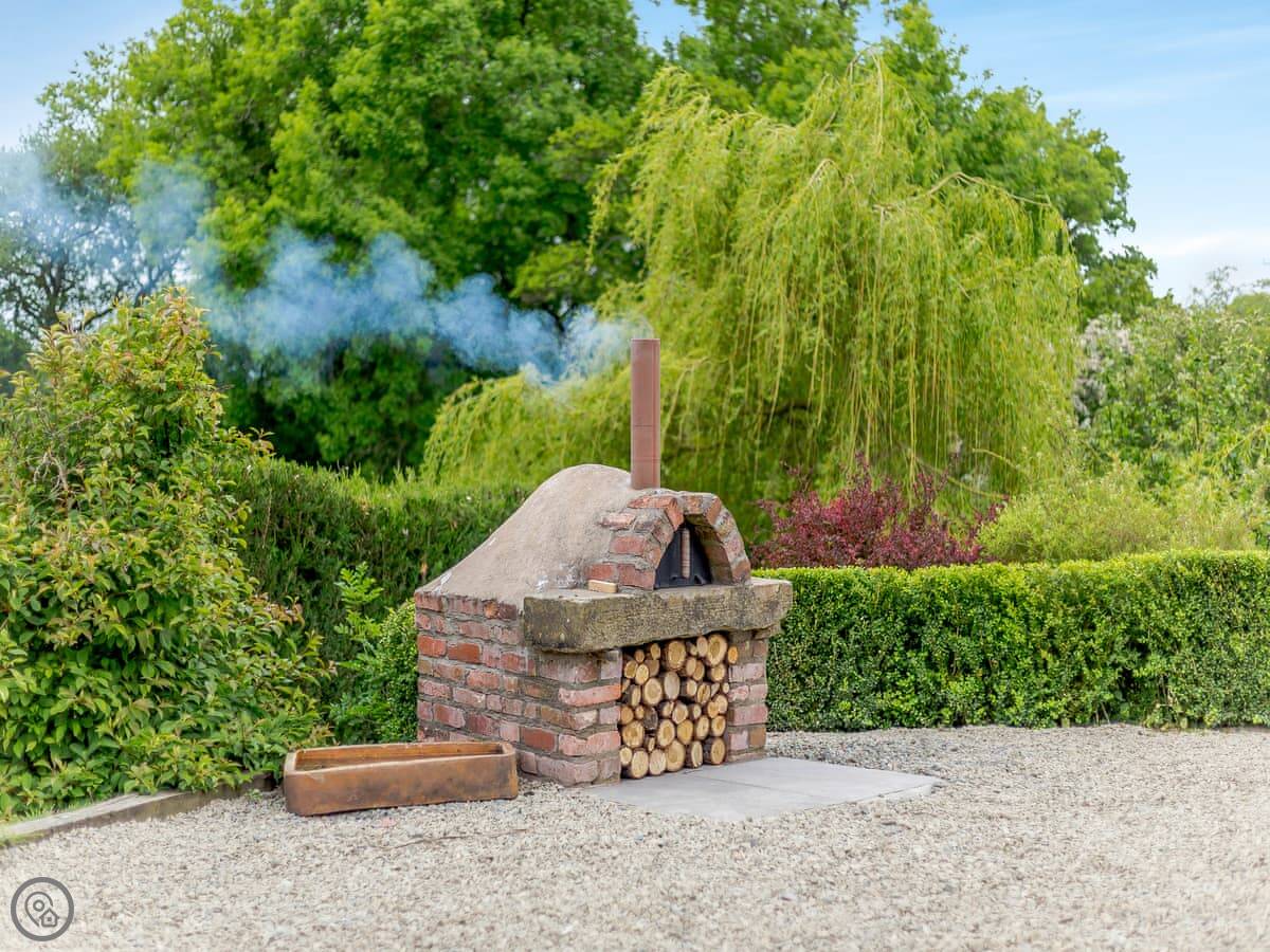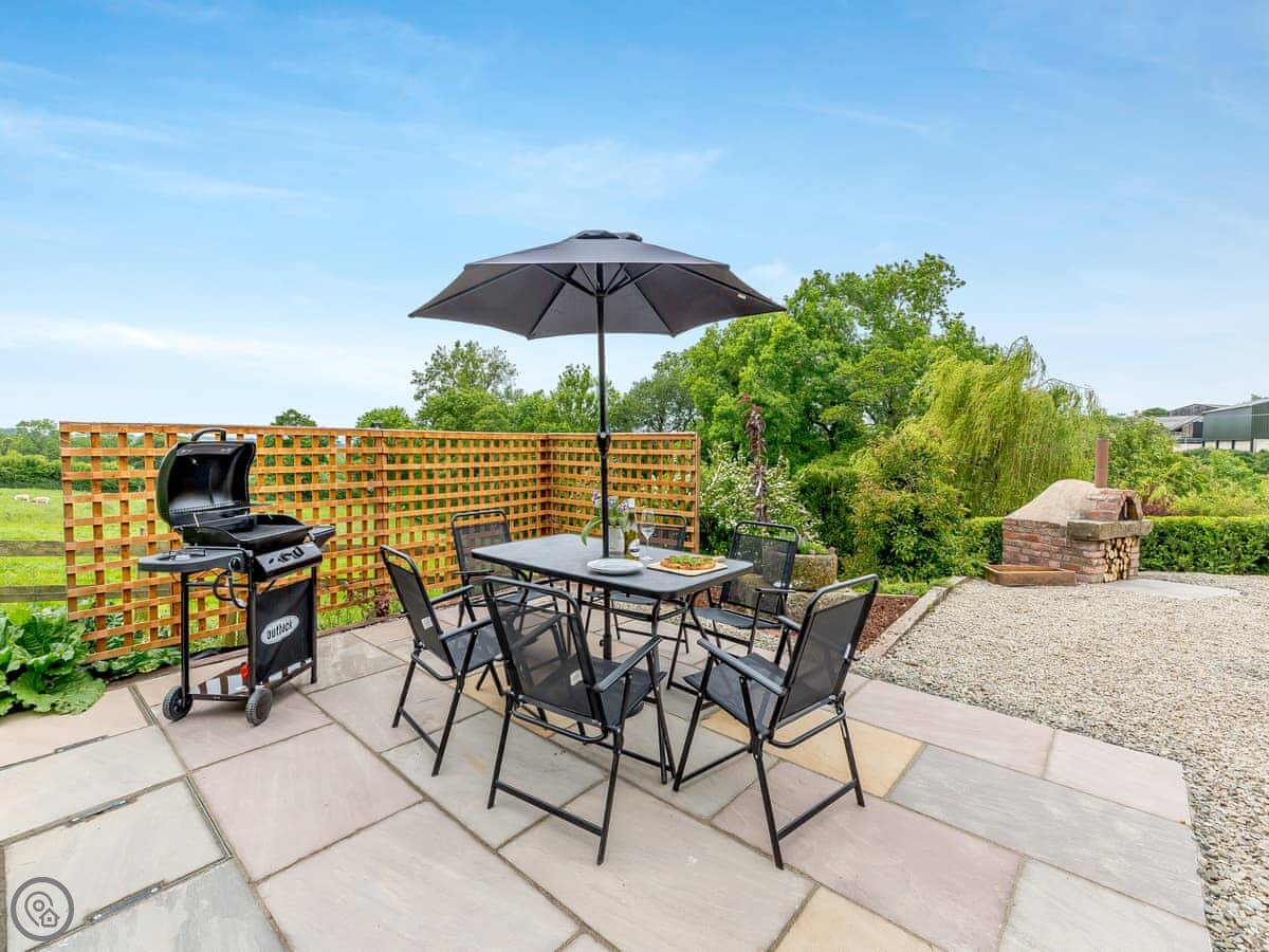 The garden is a good size and fully enclosed. There's a patio with a table and a BBQ. We've also put in an outdoor pizza oven. The garden has plum, apple, damson and pear trees. You're welcome to any fruit that's ripe.