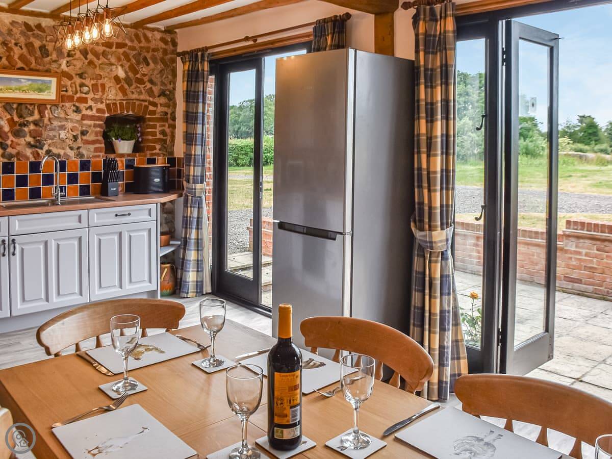 The main room is open plan. There's a kitchen area, a dining table, and sofas by a wood-burner style electric stove. You get the TV, WiFi, all the usual things. There are French doors out to the patio.