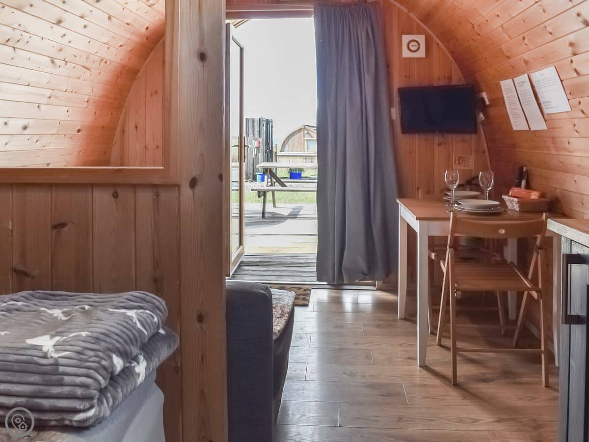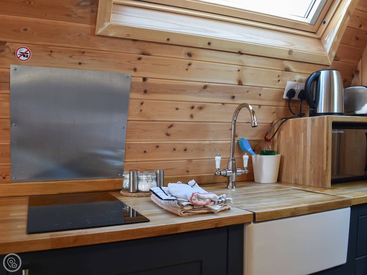 The pod has underfloor heating, which works well. There's a kitchenette with basic stuff to cook with: a Belfast sink, hob, microwave, fridge, and pots and pans. You can ask for a mini oven if you need it. You get bedding and towels.
