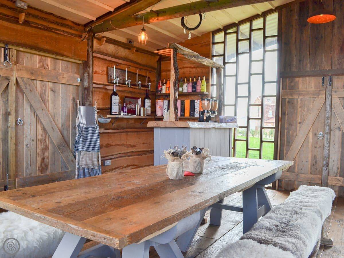 Outside, it's got its own little garden with a patio, a table and chairs, and a hot tub. The hot tub is private, just for you. You look out over our fields. It's a working farm, so you'll see sheep and sometimes hear tractors.