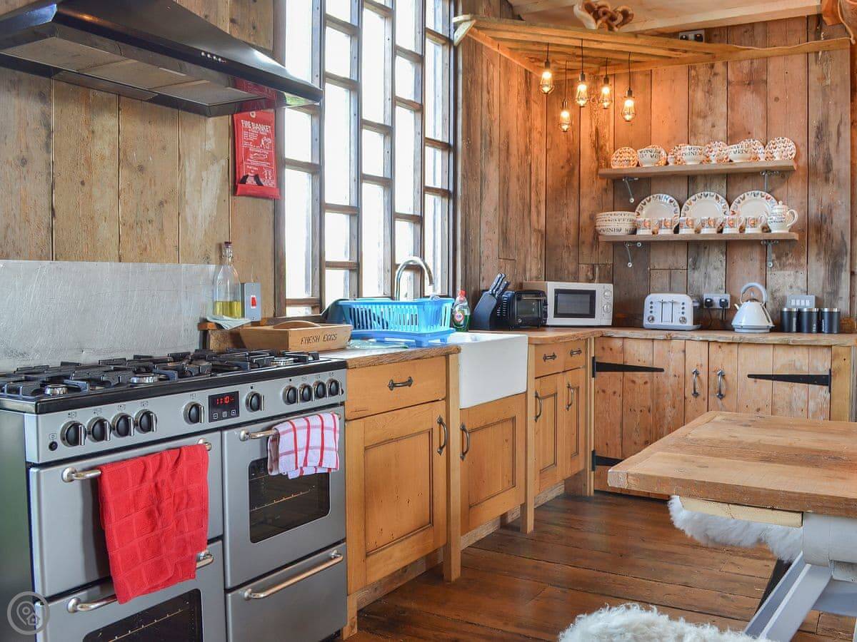 There's a separate building called the Lambing Shed about thirty steps away. That's where the main kitchen is, along with tables to eat at. It's shared with guests from our other two huts, but it's big and rarely busy. It's got a proper oven, a fridge, and a tumble dryer. There's also a small honesty shop there for basics like milk or bread.