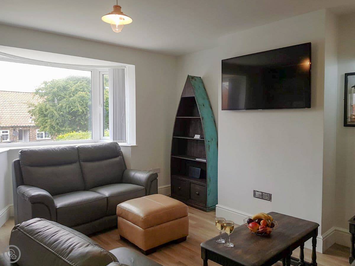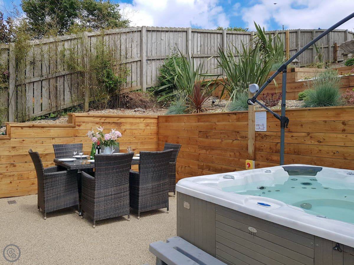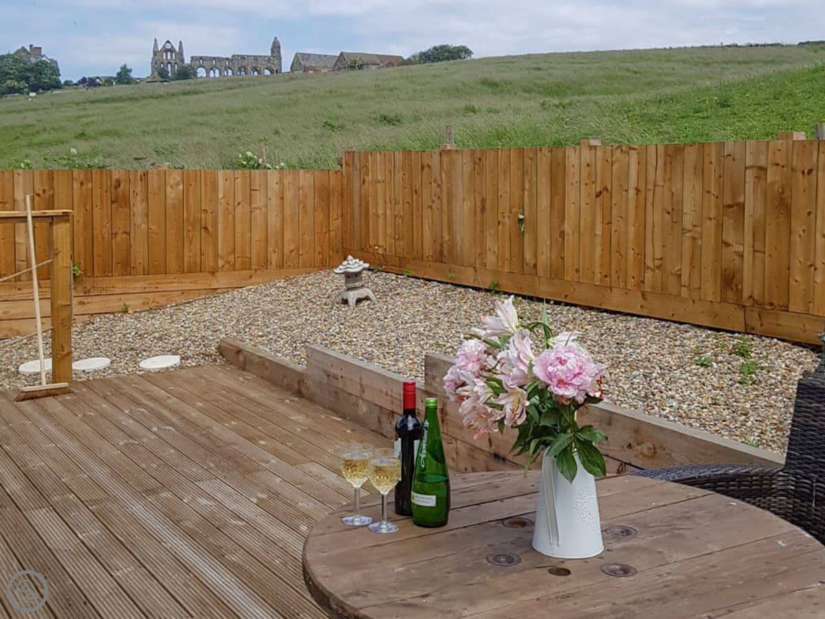 The garden is enclosed and private. It's got a hot tub, which people seem to like. The view from the raised terrace is decent, you can see across to Whitby.