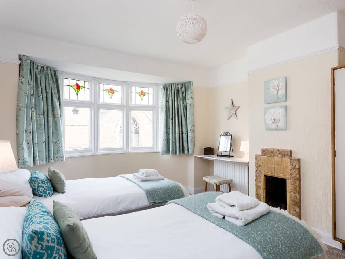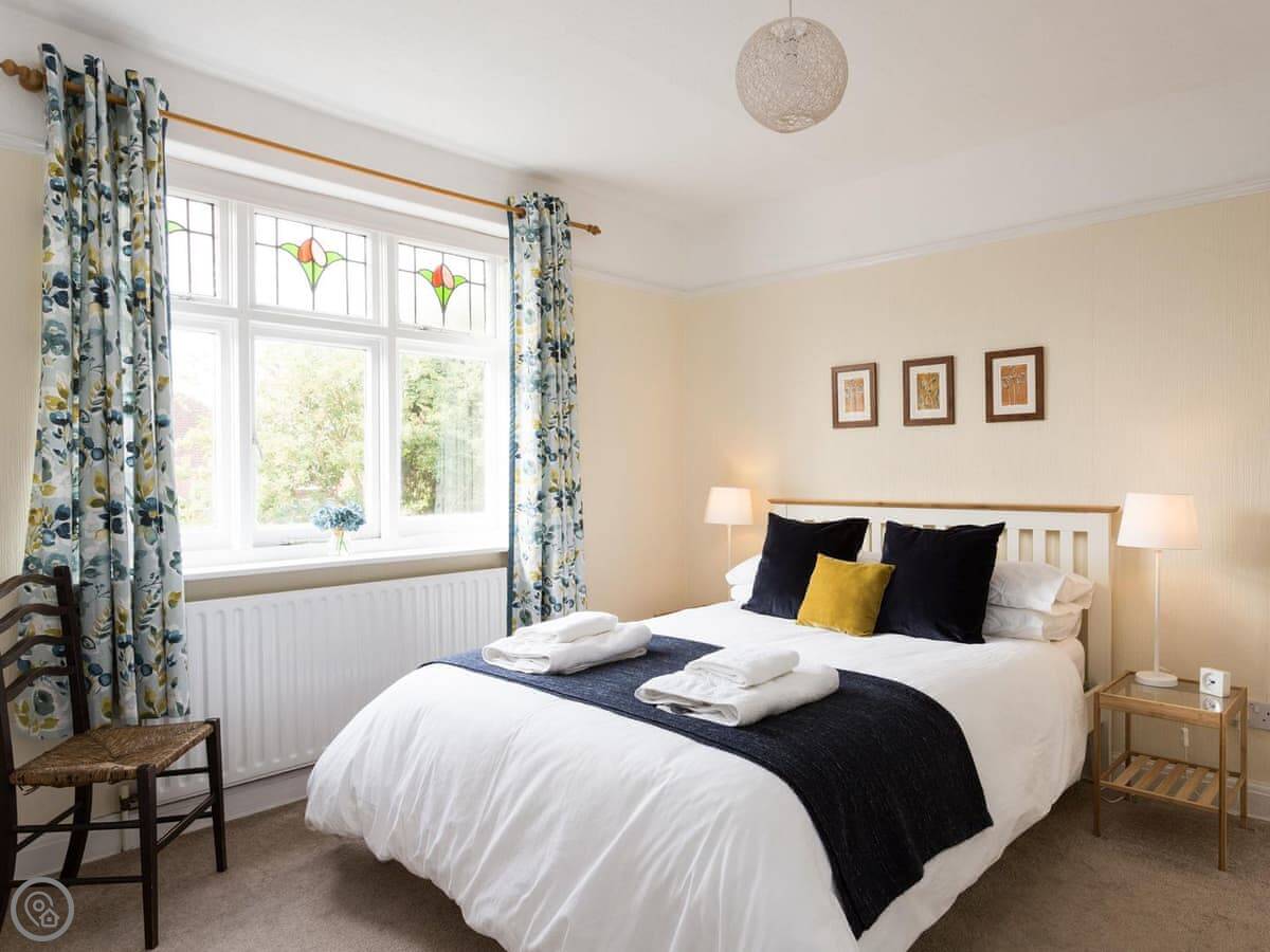It sleeps five people in three bedrooms. There's one bathroom with a bath and a shower over it. It's got a 4 Star rating. The interior is Arts and Crafts style, so there's original wood panelling in the hall and nice stained glass around the front door.
