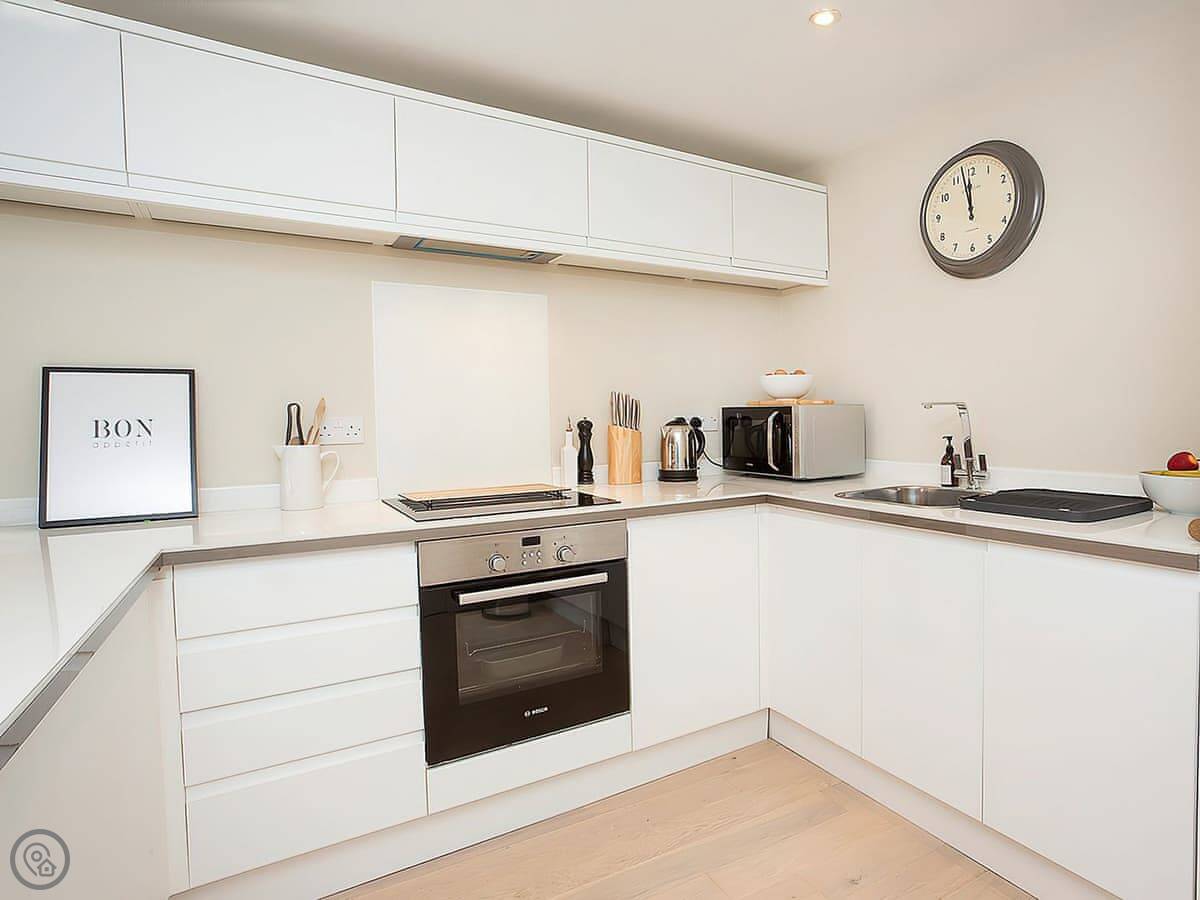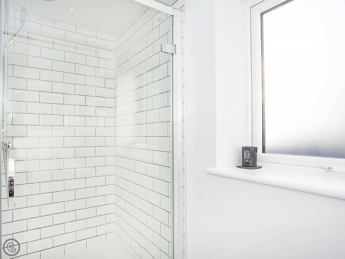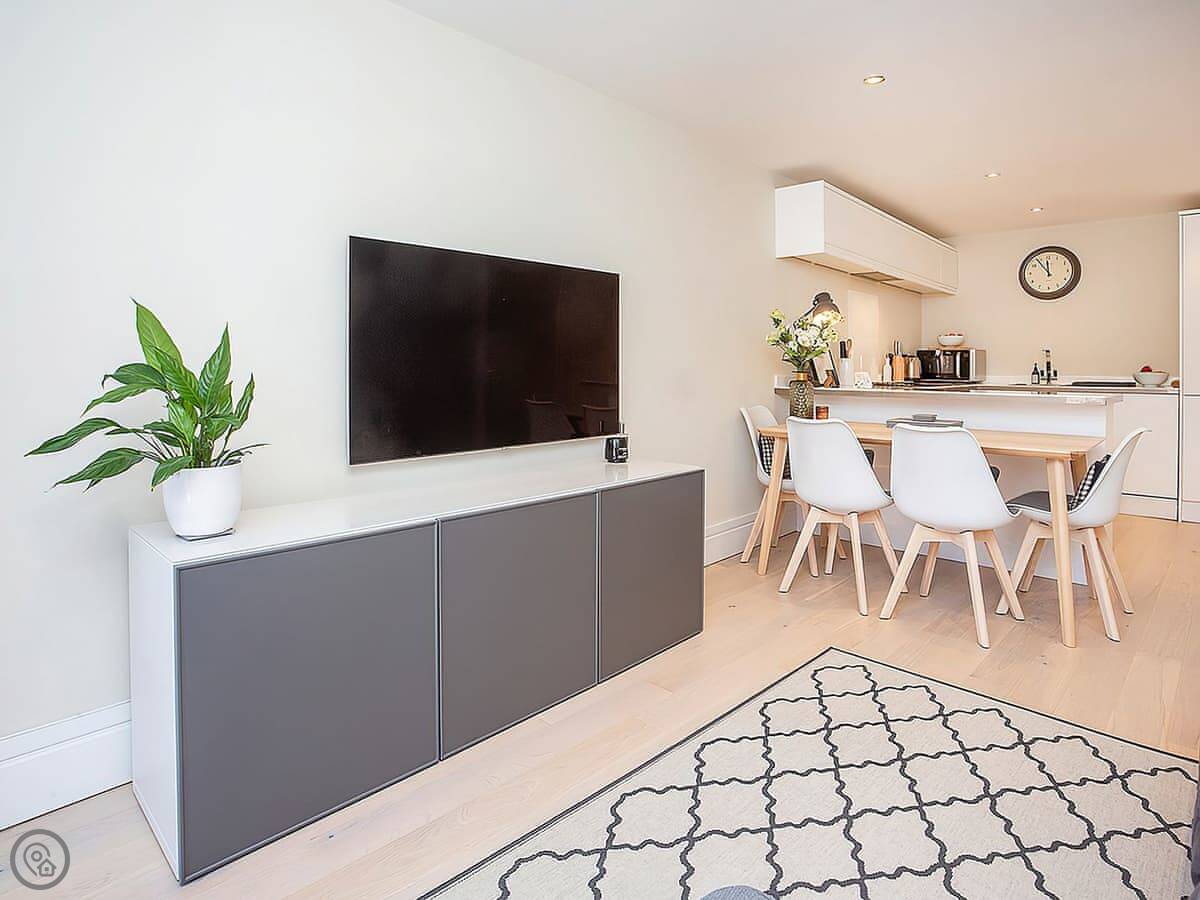 You go up a short flight of stairs to get in. It's open plan inside. The kitchen has everything you'll need, including a dishwasher and a washing machine. There's a Smart TV with Netflix, and the WiFi works fine.