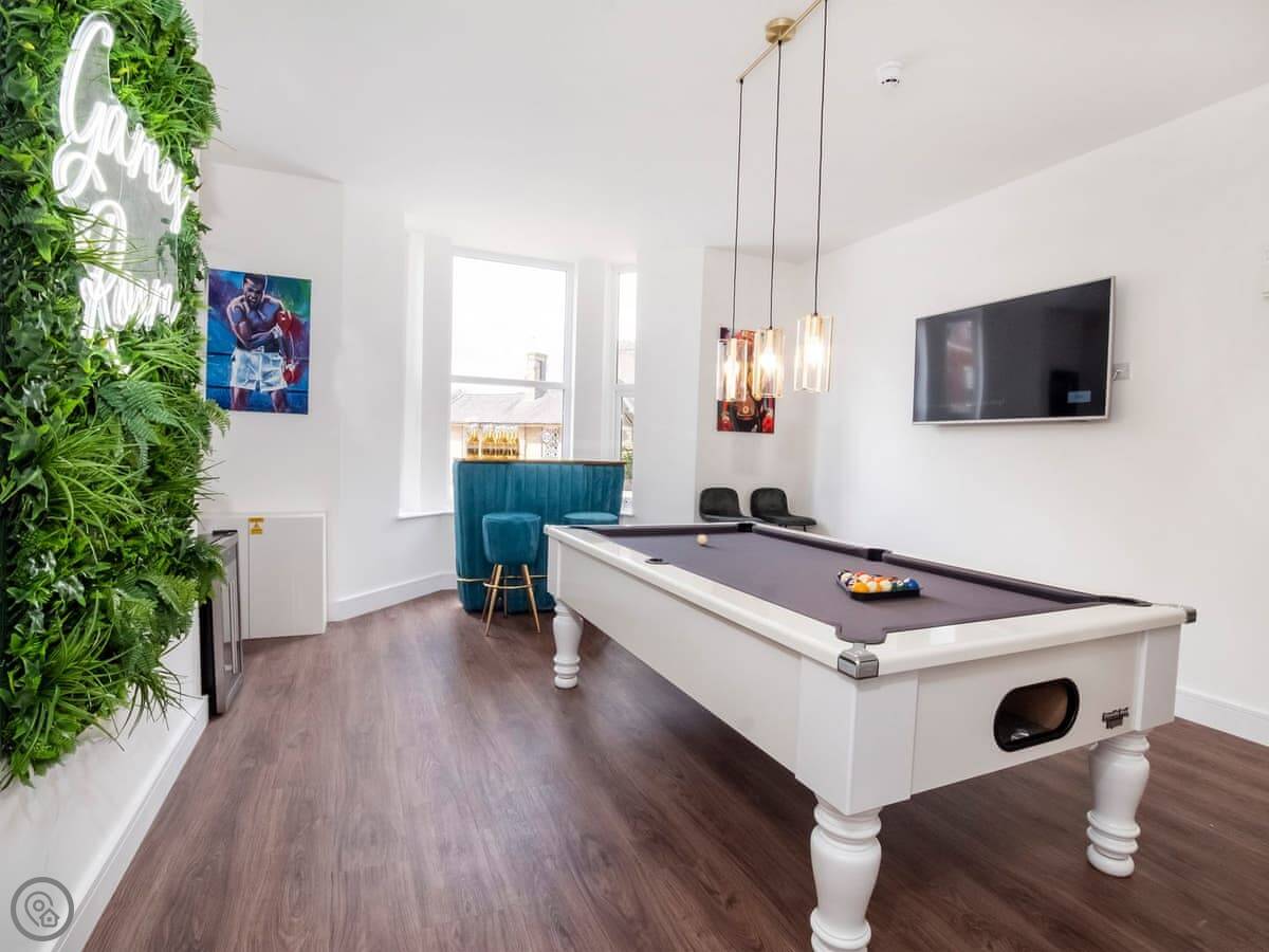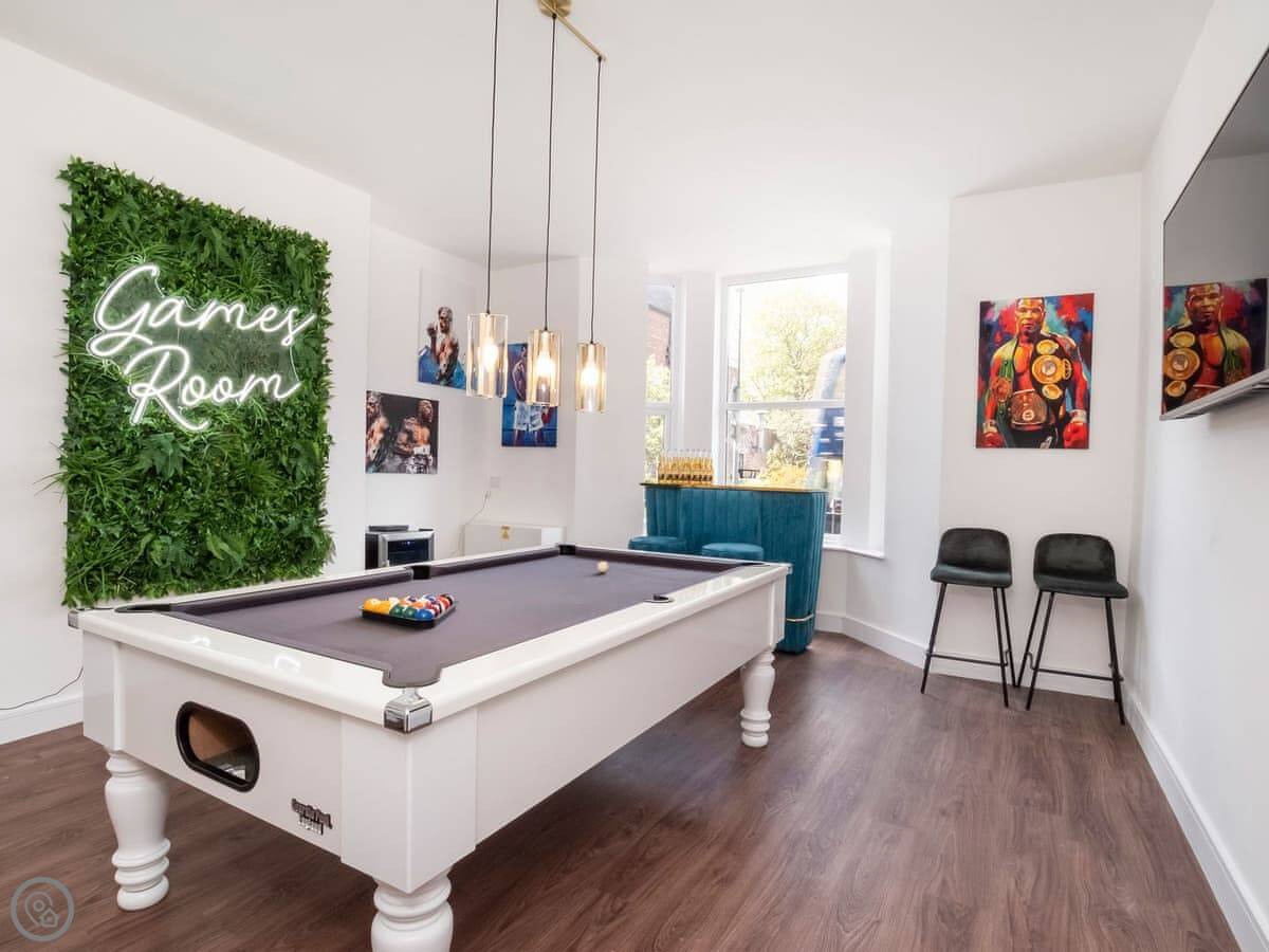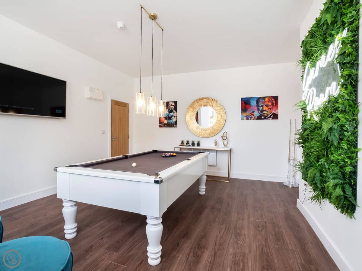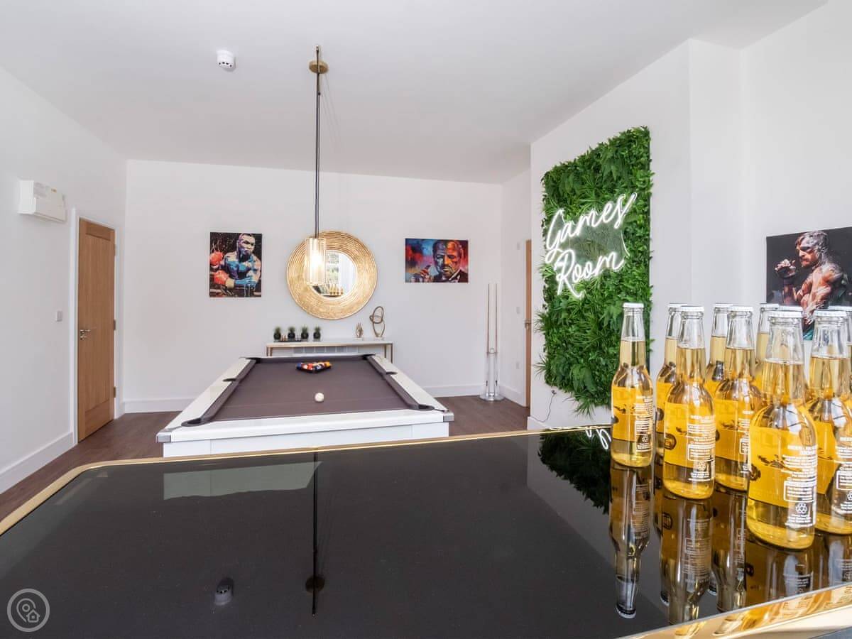 The living area is open plan. There's a very large dining table that seats everyone. The kitchen is fully equipped. There's a separate games room with a pool table, a bar, and a TV.