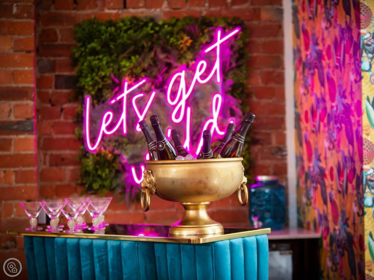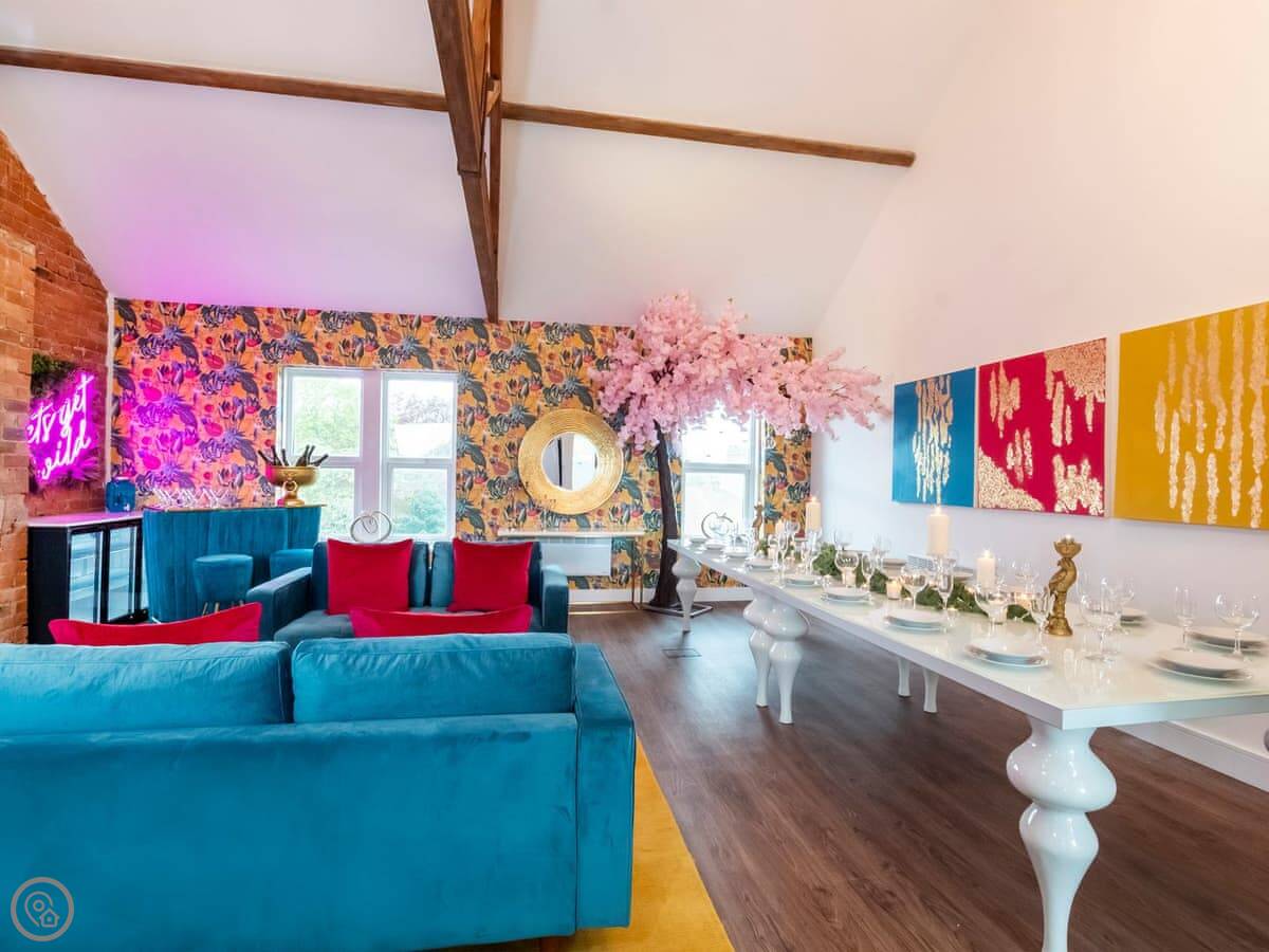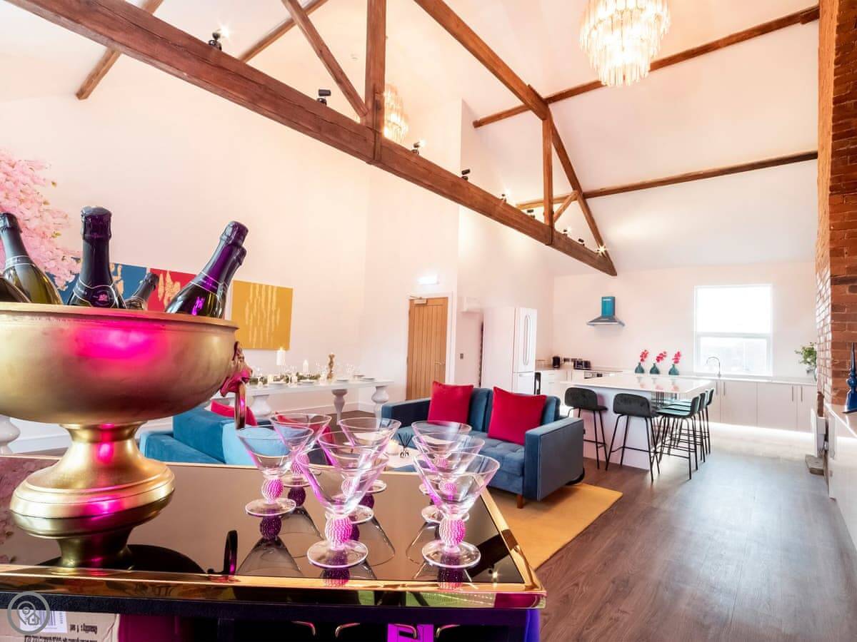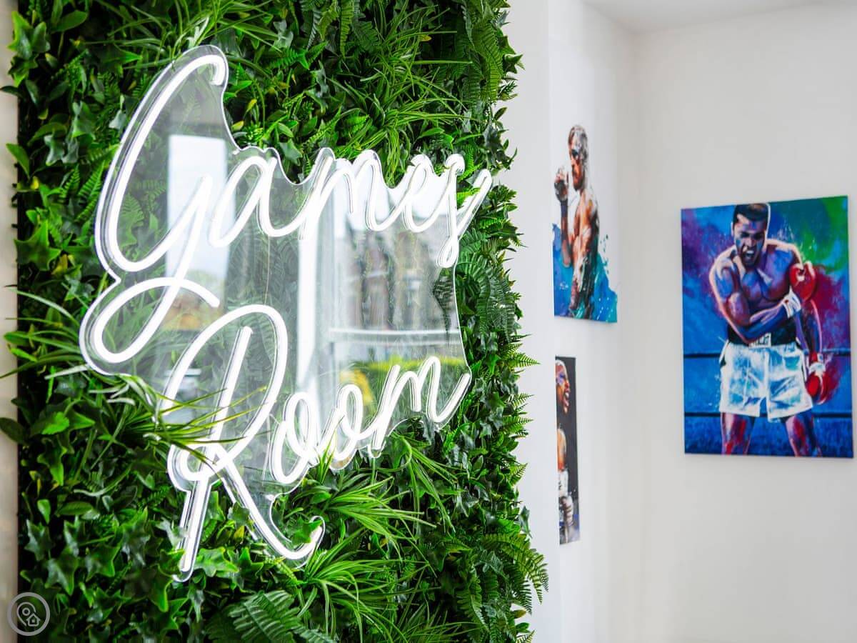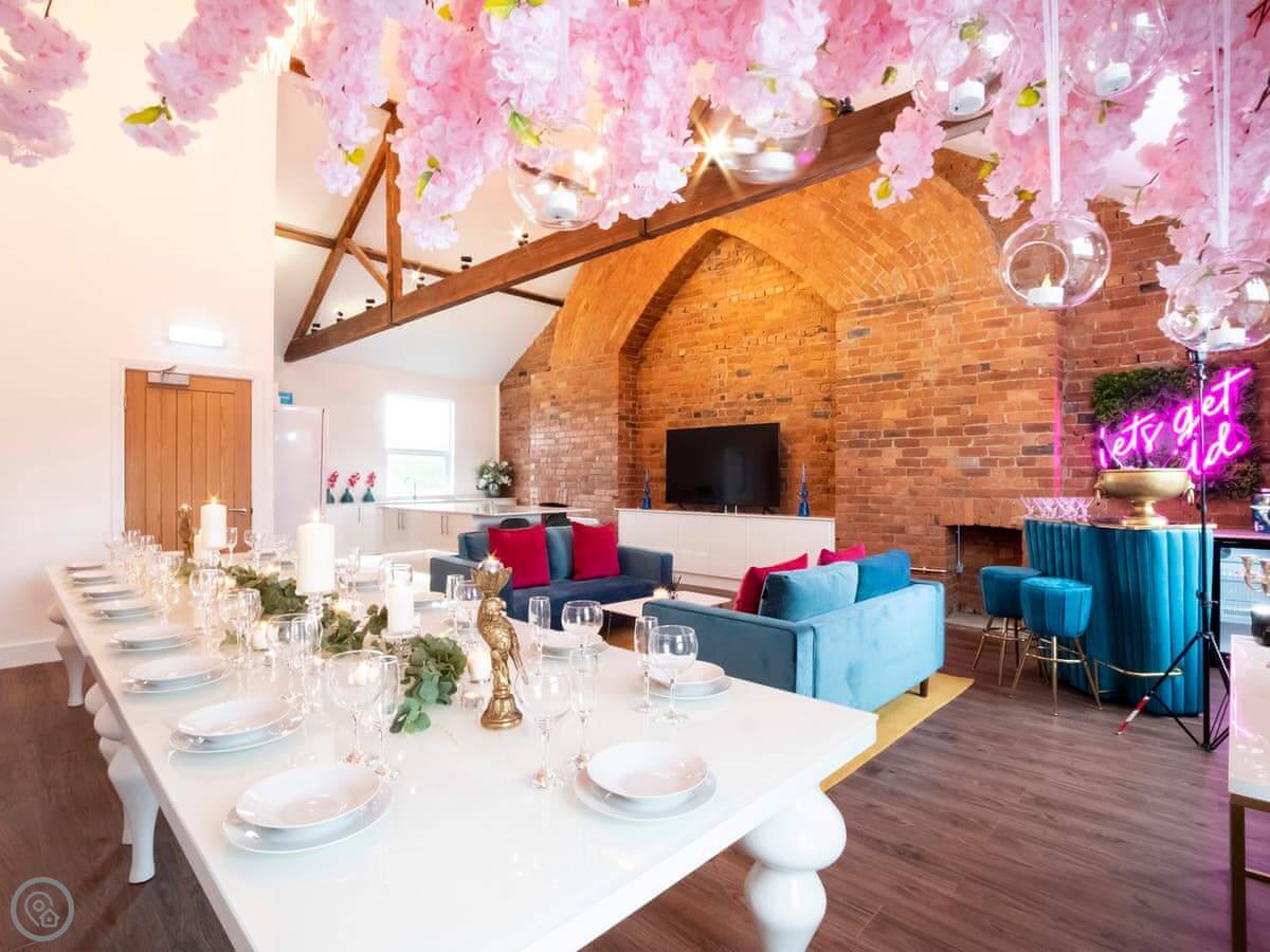 The living area is open plan. There's a very large dining table that seats everyone. The kitchen is fully equipped. There's a separate games room with a pool table, a bar, and a TV.