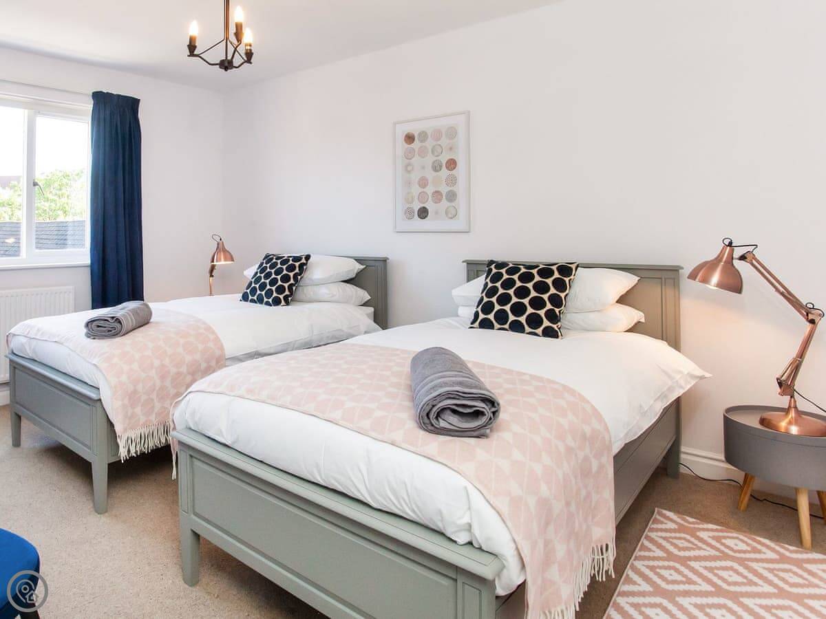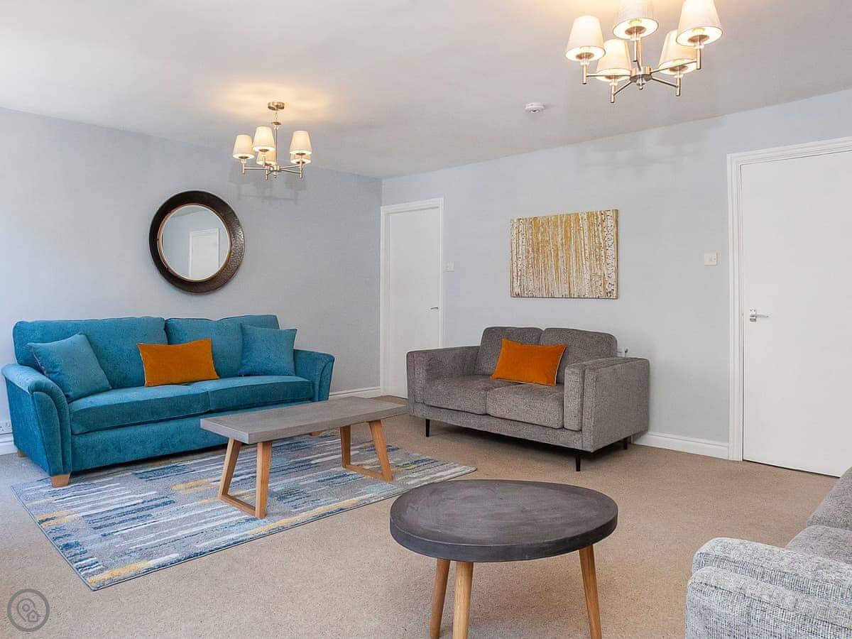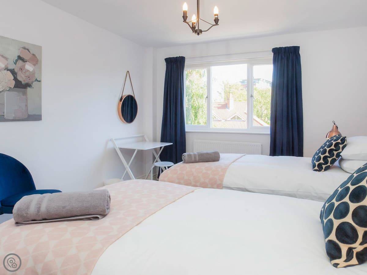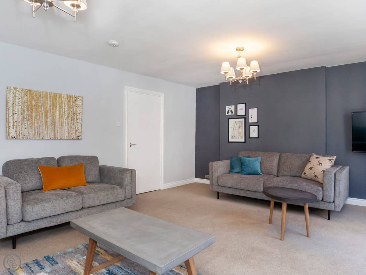 It's got a 4 Star rating. It's been done up nicely. There's a decent sized living room with a smart TV, and a separate kitchen with a table for meals. Two bathrooms, plus a loo downstairs. The main bedroom has a kingsize bed and its own shower room. The second room has two singles and the third has one single.