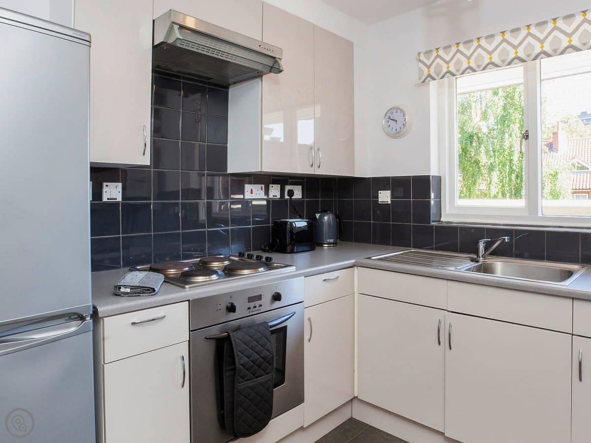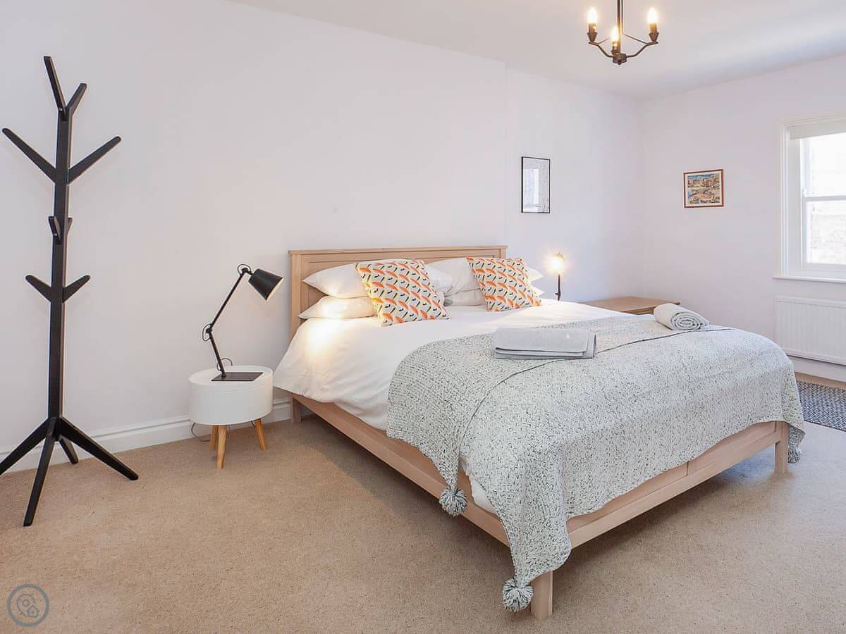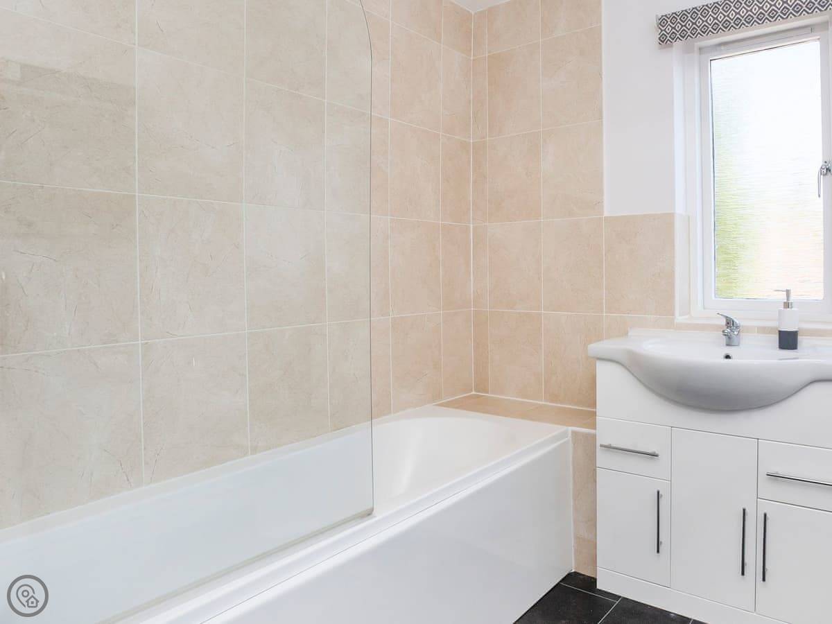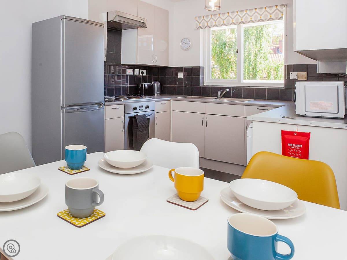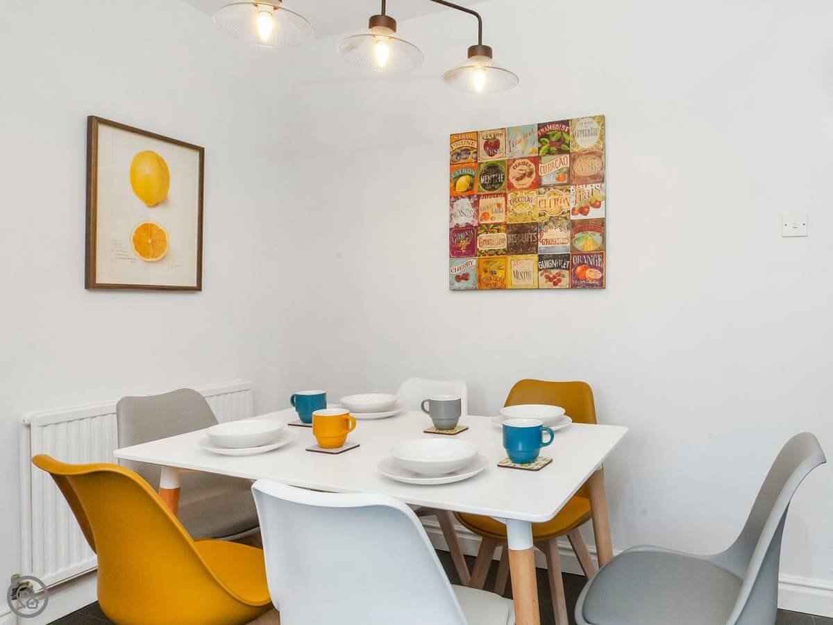 It's got a 4 Star rating. It's been done up nicely. There's a decent sized living room with a smart TV, and a separate kitchen with a table for meals. Two bathrooms, plus a loo downstairs. The main bedroom has a kingsize bed and its own shower room. The second room has two singles and the third has one single.
