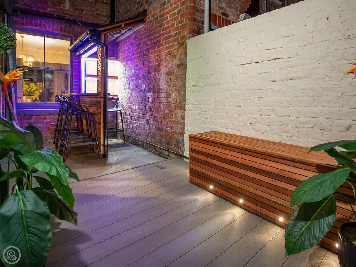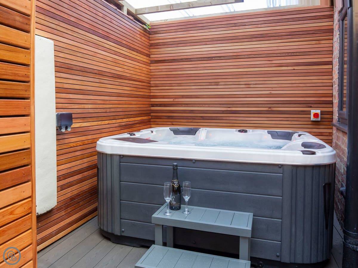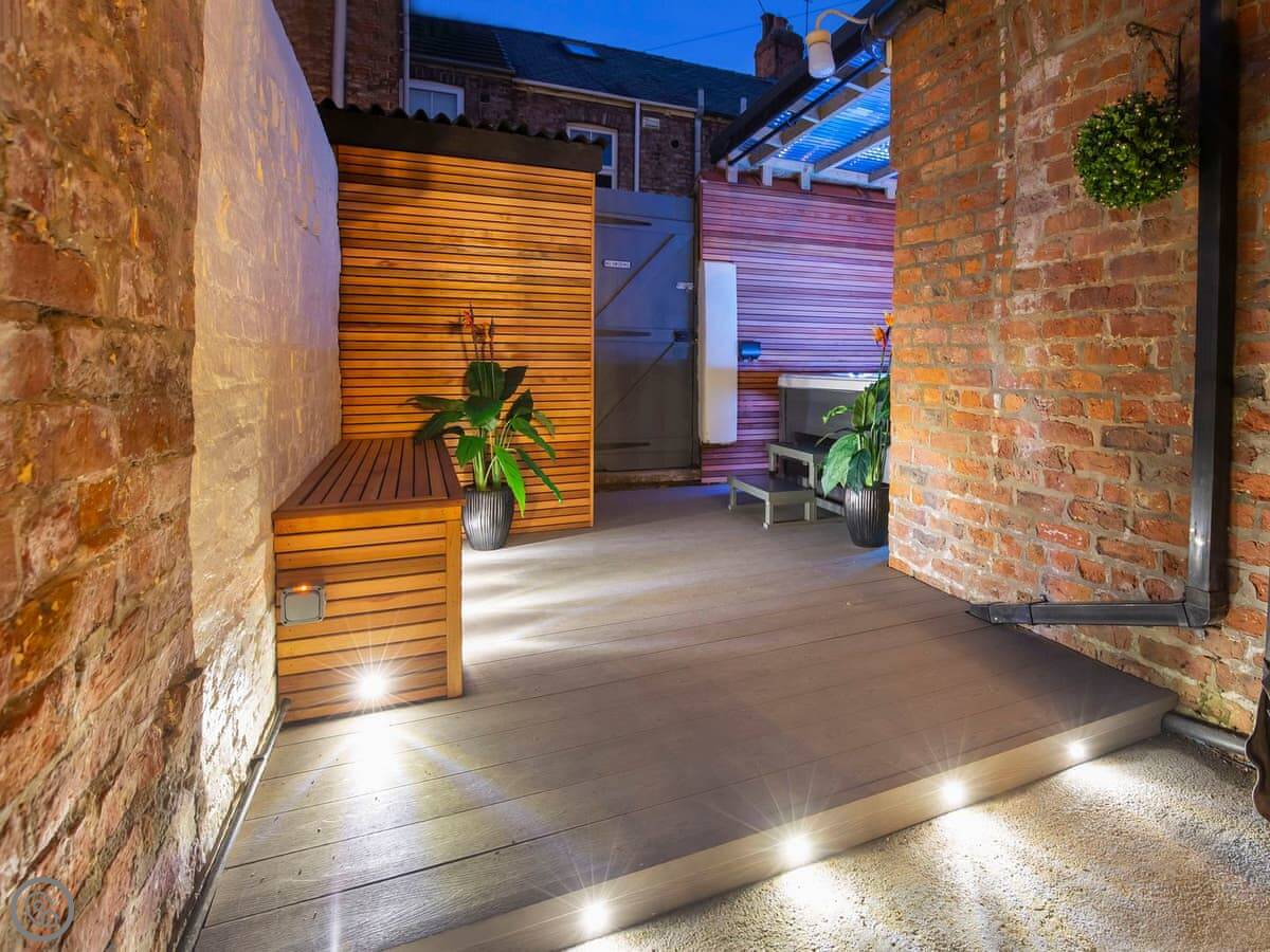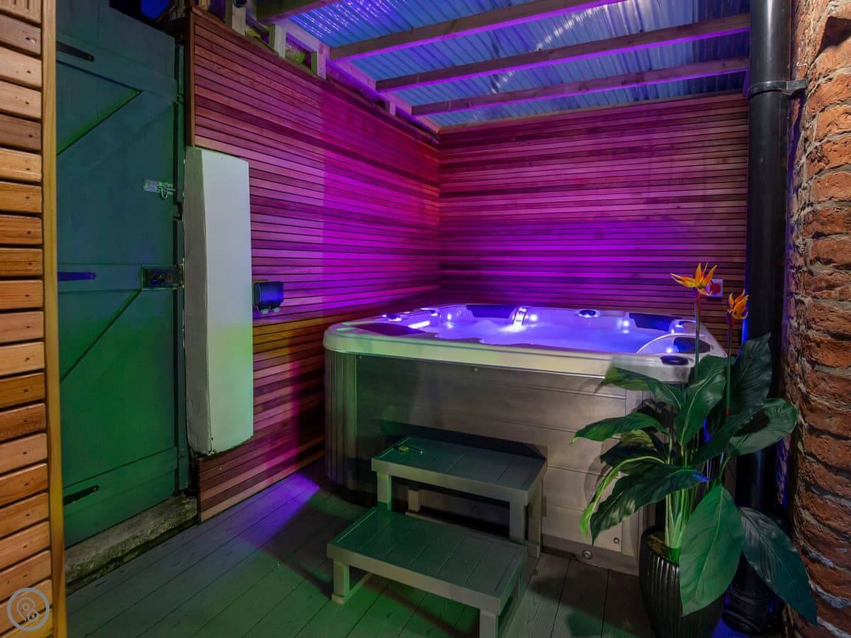 The main thing is the garden. It's fully enclosed and has been done up with an outdoor bar area and a hot tub. There's also an outdoor toilet out there, which is handy. The living room has a large TV and an electric fire.