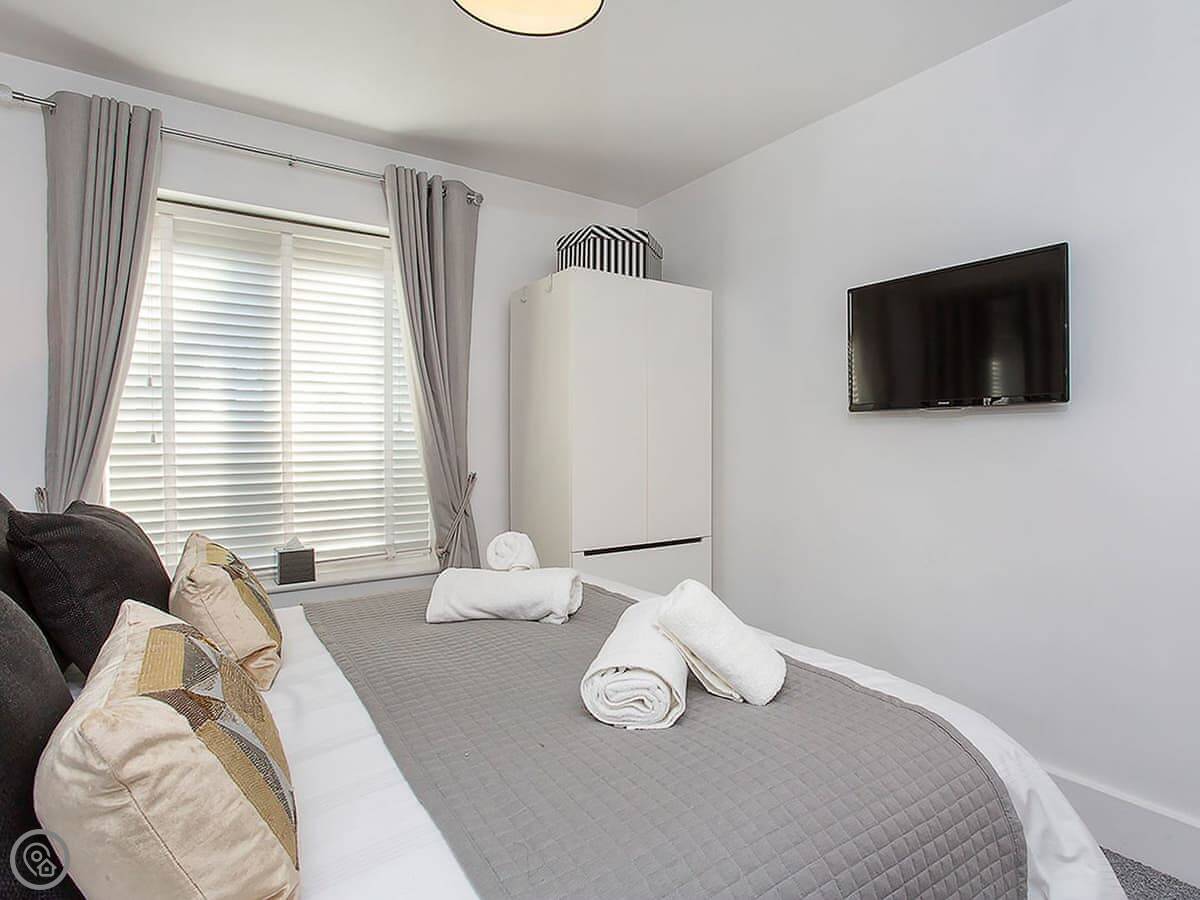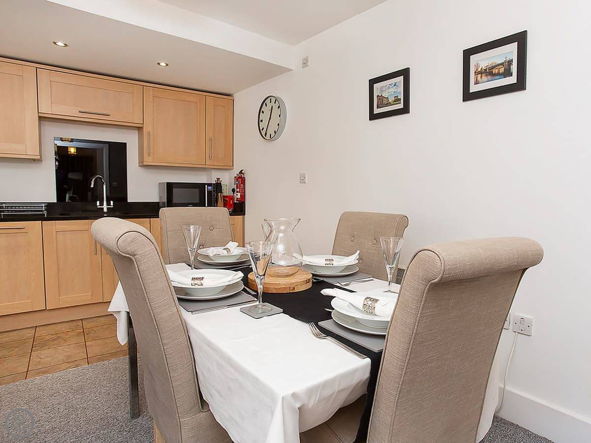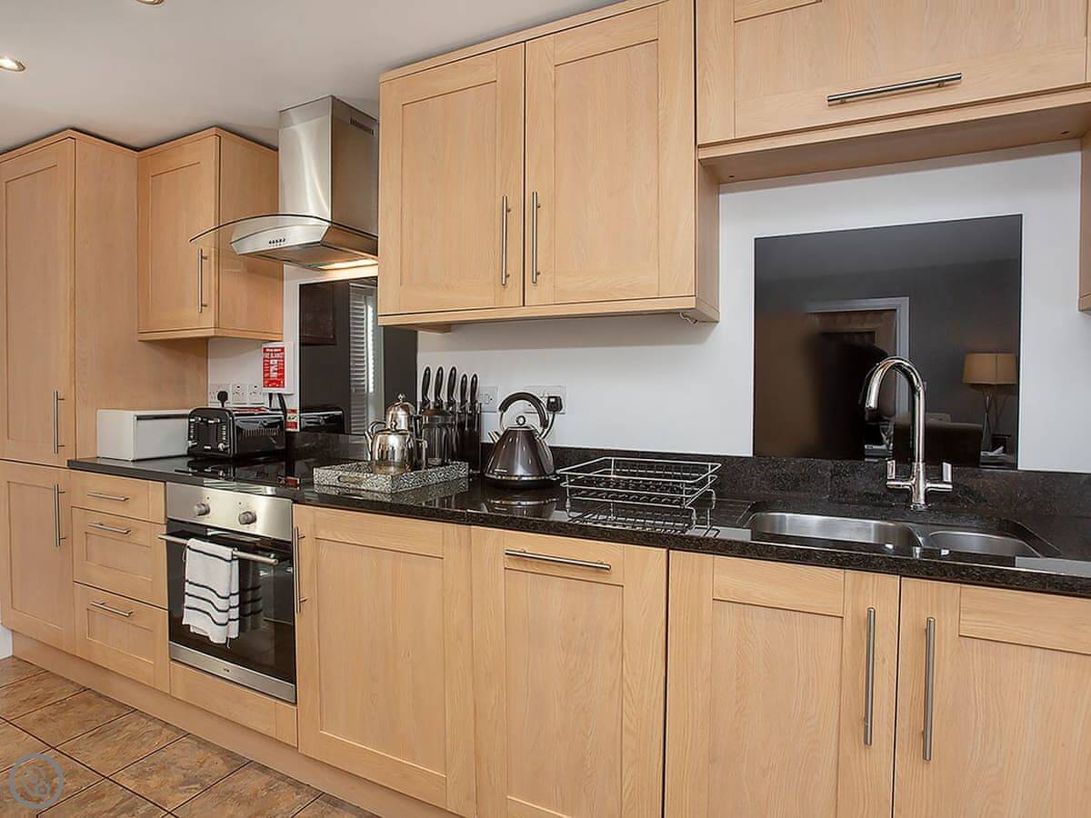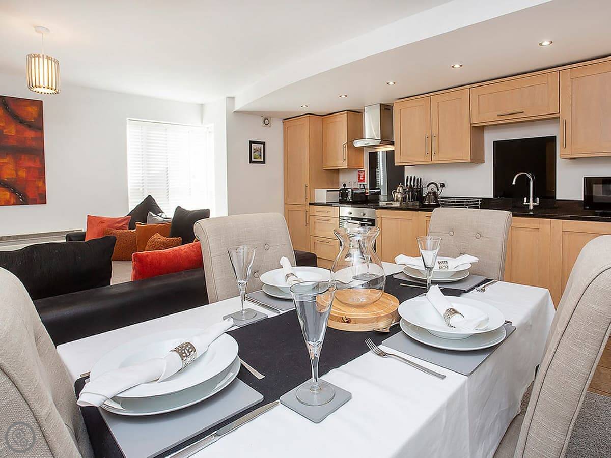 The living space is all open plan. A decent sized kitchen, a dining table for four, and a big corner sofa. It's modern and straightforward. All on one level, so it works if stairs are a problem.