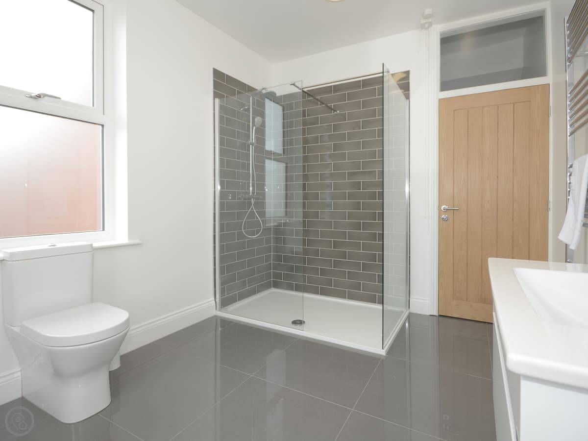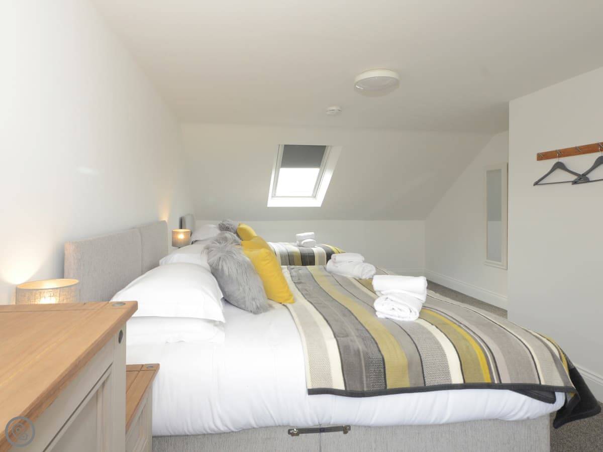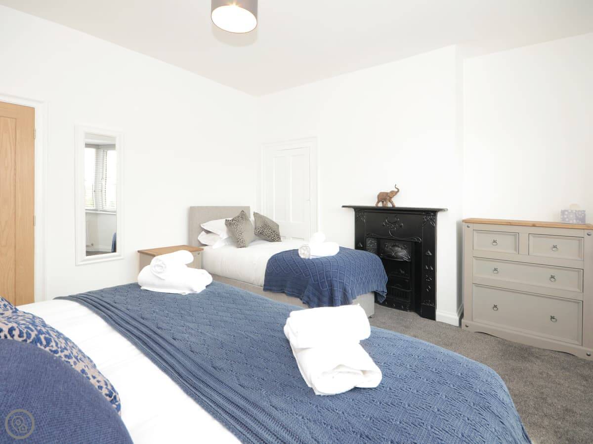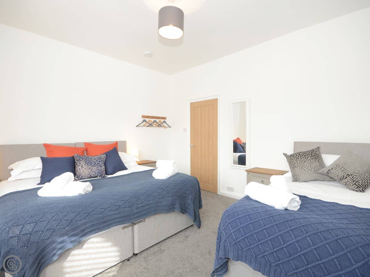 It sleeps seven. There are three bedrooms. Two have super king size beds and one has a king size. One of the super kings can be split into two singles if you need it. There are two bathrooms, one with a walk-in shower and a sunken bath, and an ensuite shower in the top floor bedroom.