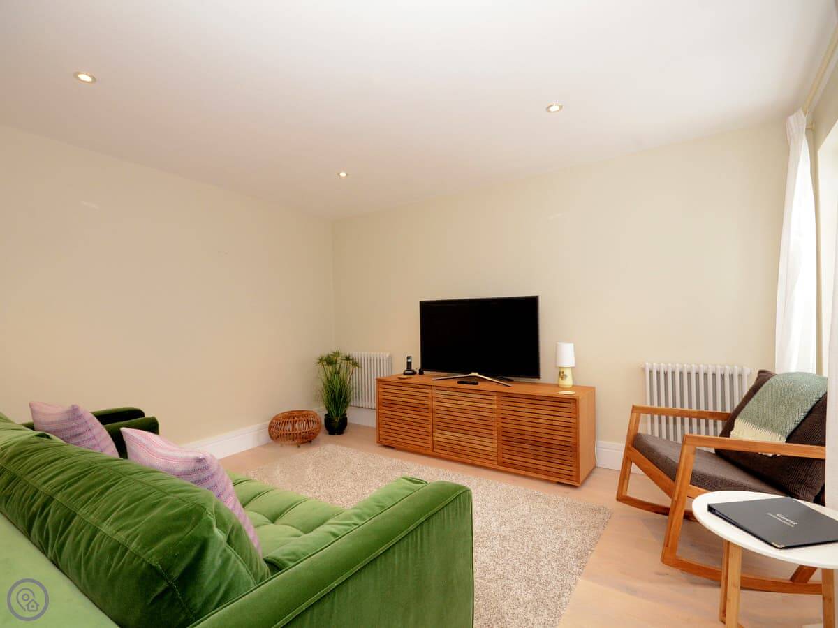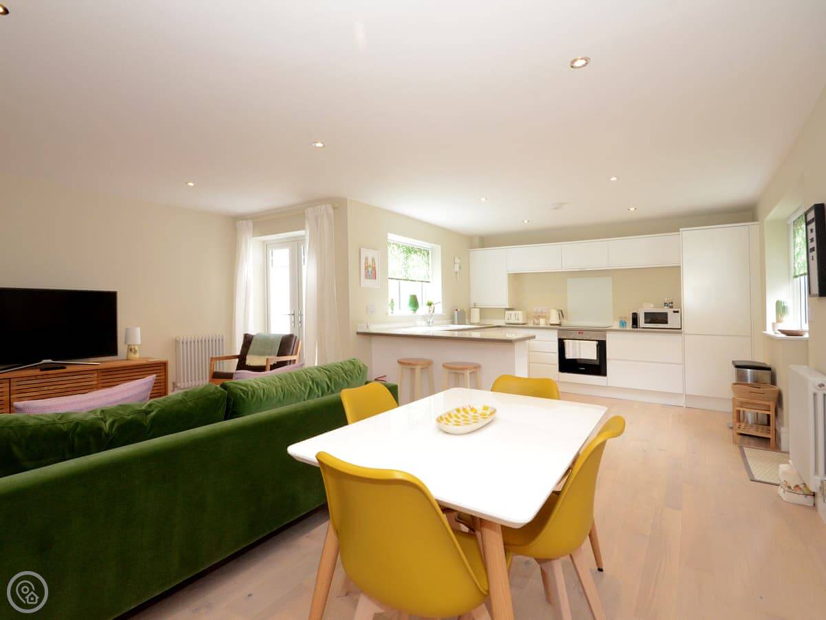 Downstairs is an open plan space. There's a kitchen with a breakfast bar, a dining table, and a sofa area. The French doors open straight onto your parking spot. It feels modern inside. Upstairs, both bedrooms have a TV. There's also a separate cloakroom and a small store room downstairs.