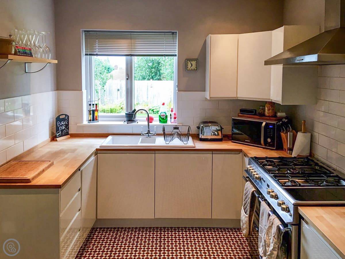 The living room has a smart TV and a large oak dining table. The kitchen is a good size and has what you need. There's a utility area with a washer and dryer.