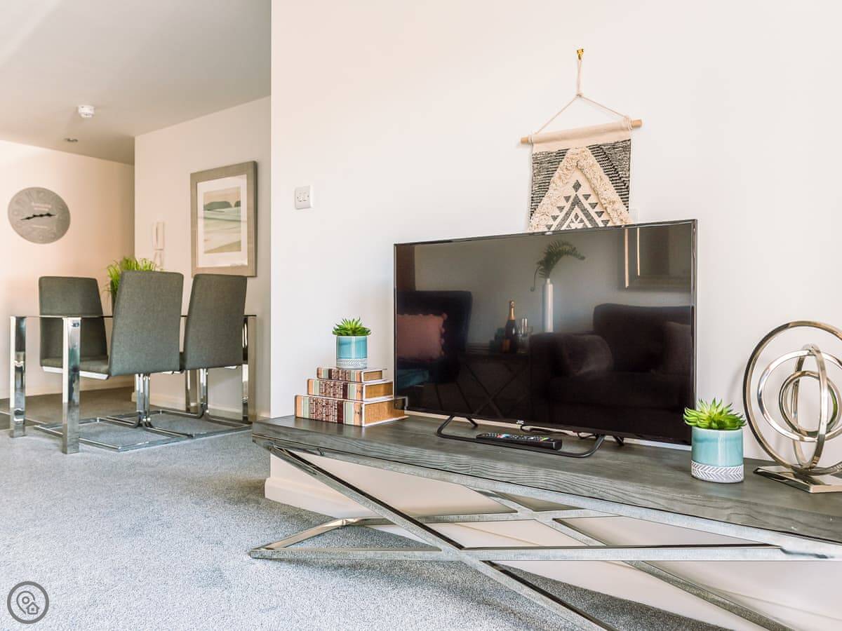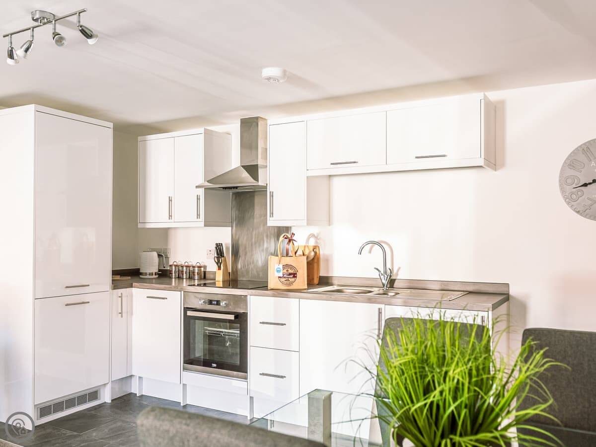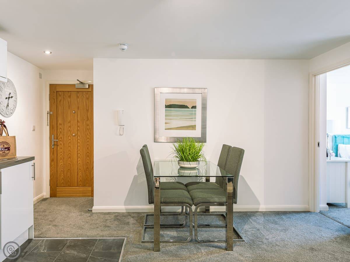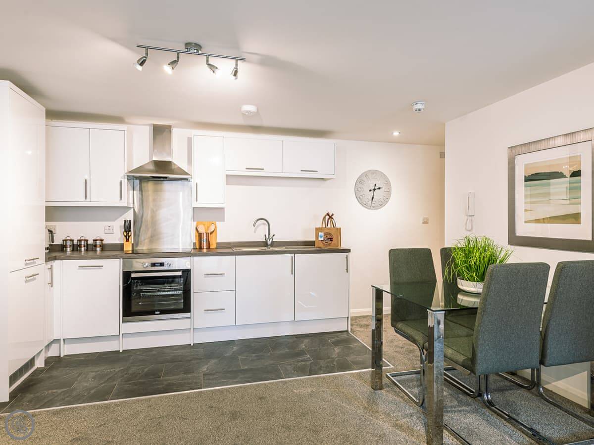 The main room has big windows so it's bright. There's a kitchen with a dishwasher, a table for four, and a comfortable sofa. It's all very clean and straightforward.