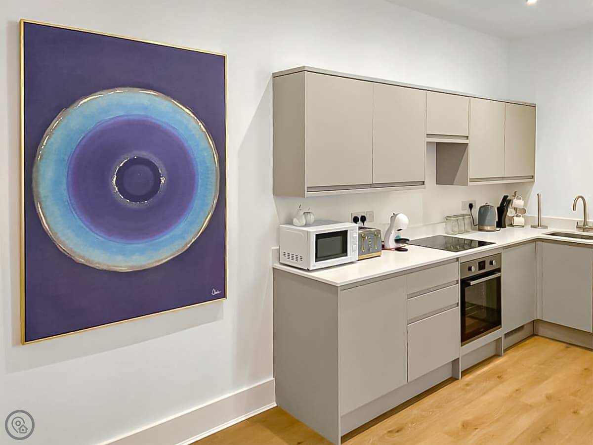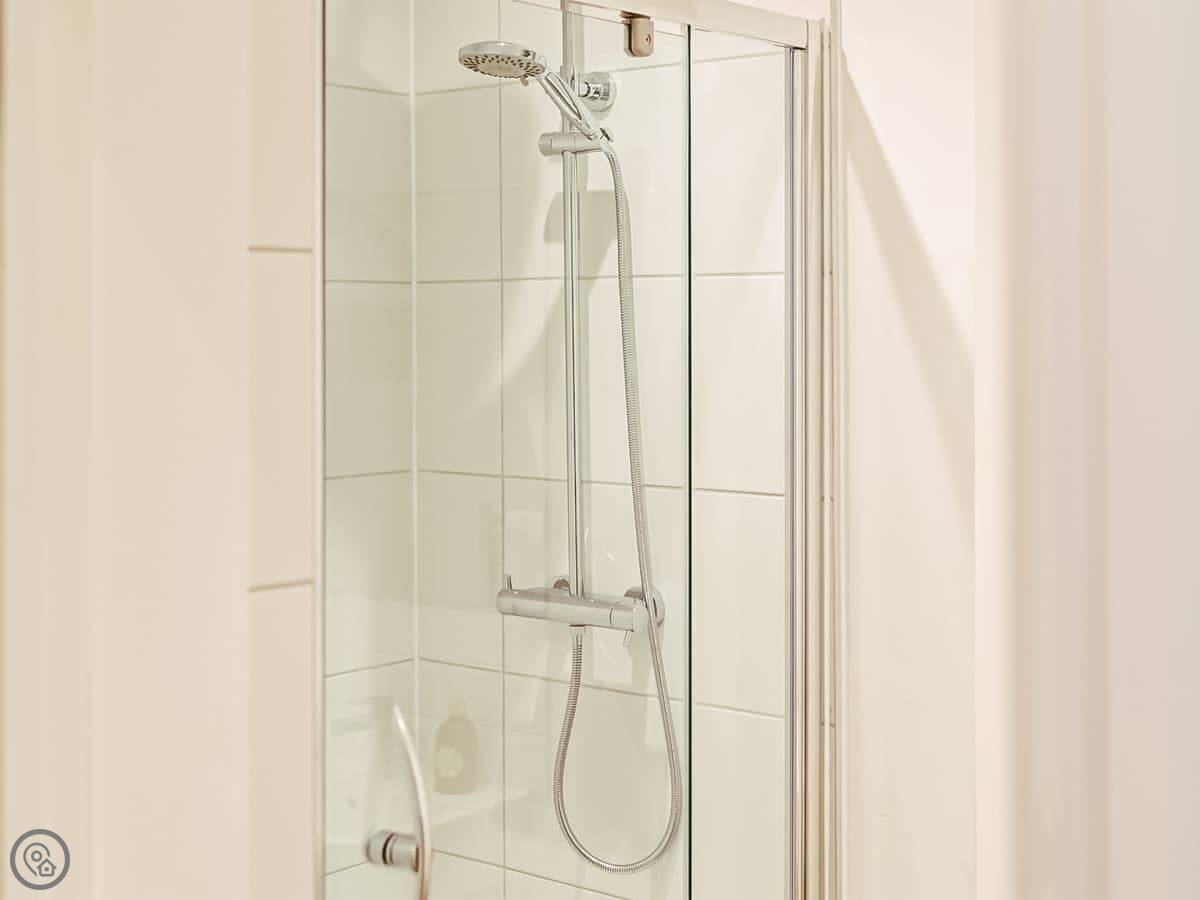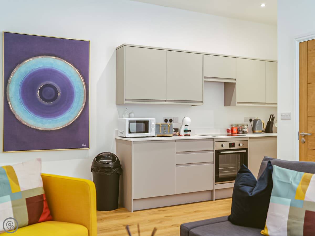 The place is all open plan. You've got the kitchen, dining and living area in one room. The kitchen's got a dishwasher. There's a walk-in shower.