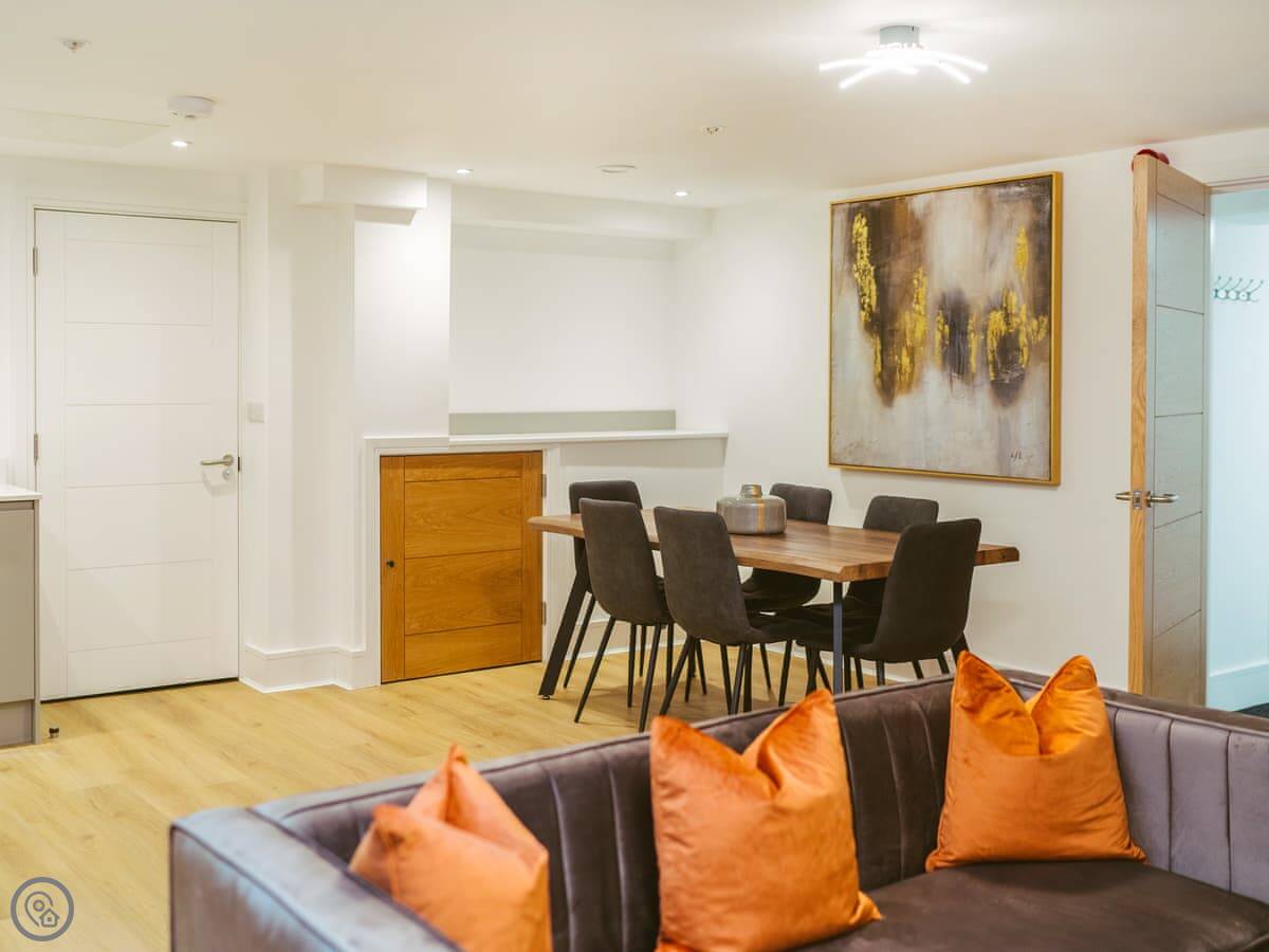 The main room is open plan, with the kitchen, living and dining space all together. The kitchen has what you'd expect: dishwasher, fridge, microwave, that sort of thing. There's Wi-Fi and a TV. Bedding and towels are included.