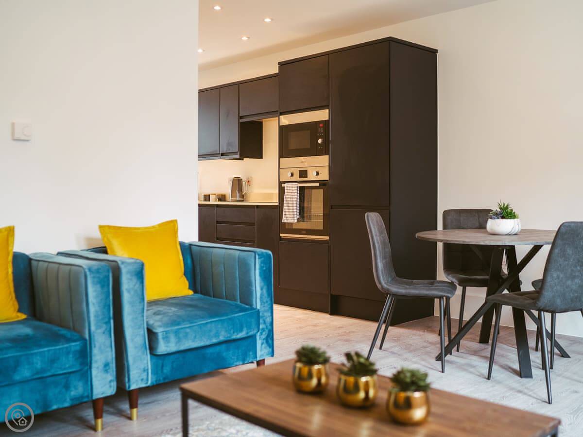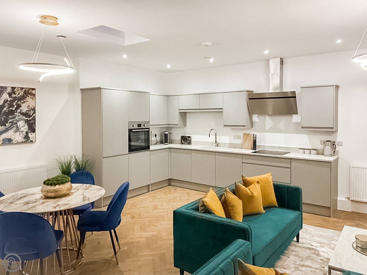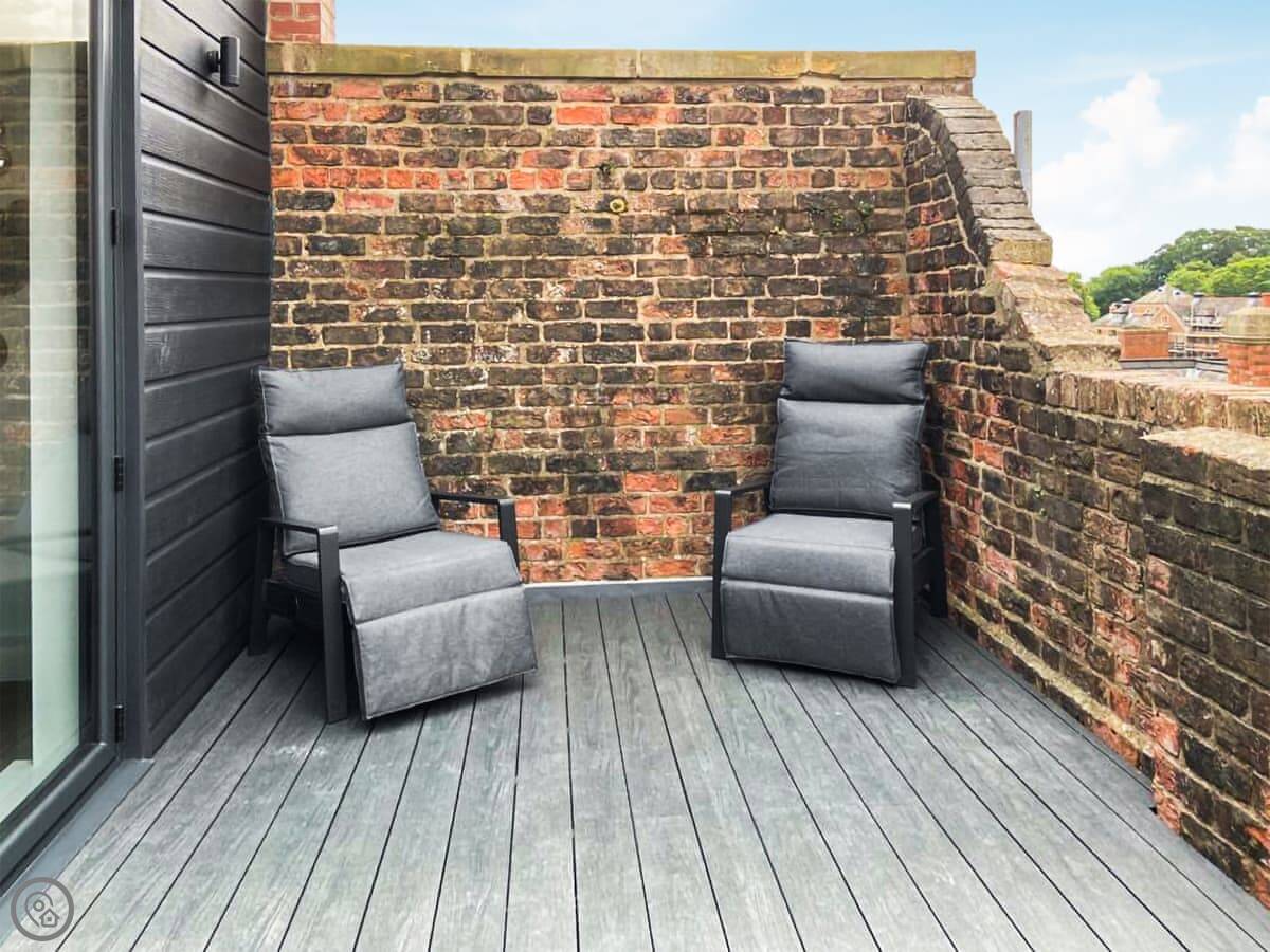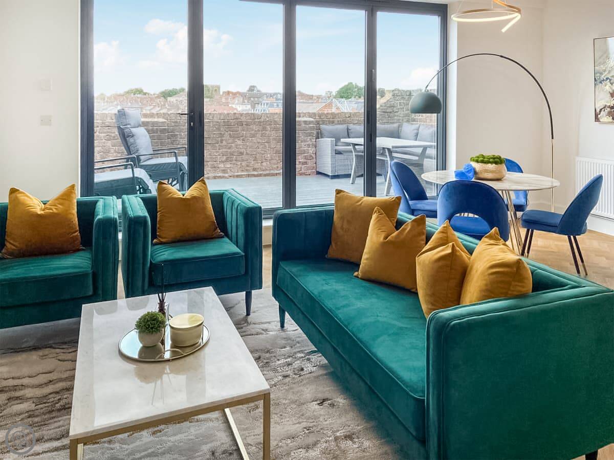 It’s a modern penthouse flat. Two bedrooms, both with kingsize beds, and two bathrooms, so one’s an ensuite. It sleeps four. The rating's 4 Star, which basically means it's comfortable and well looked after. The main room is open-plan, with a kitchen at one end. The doors at the back open onto a small decked area.