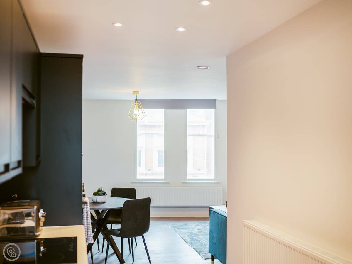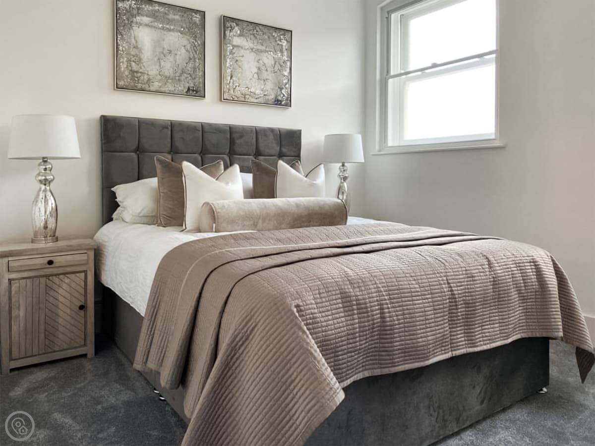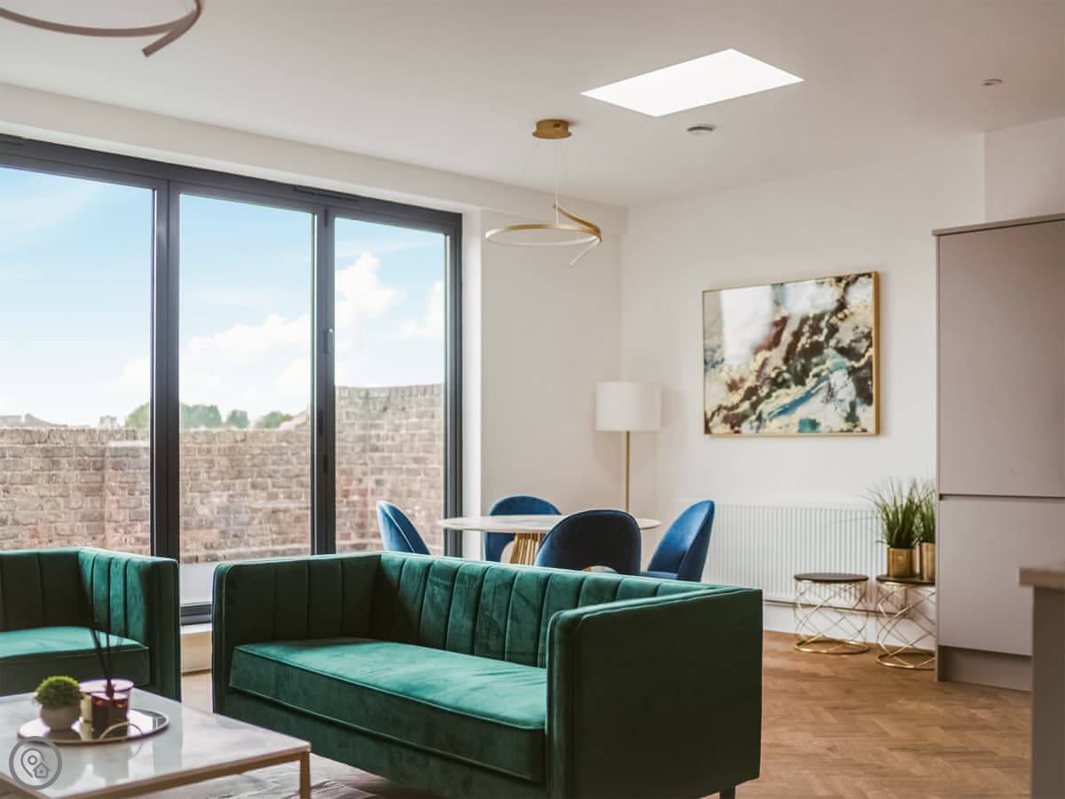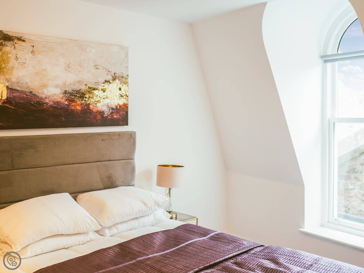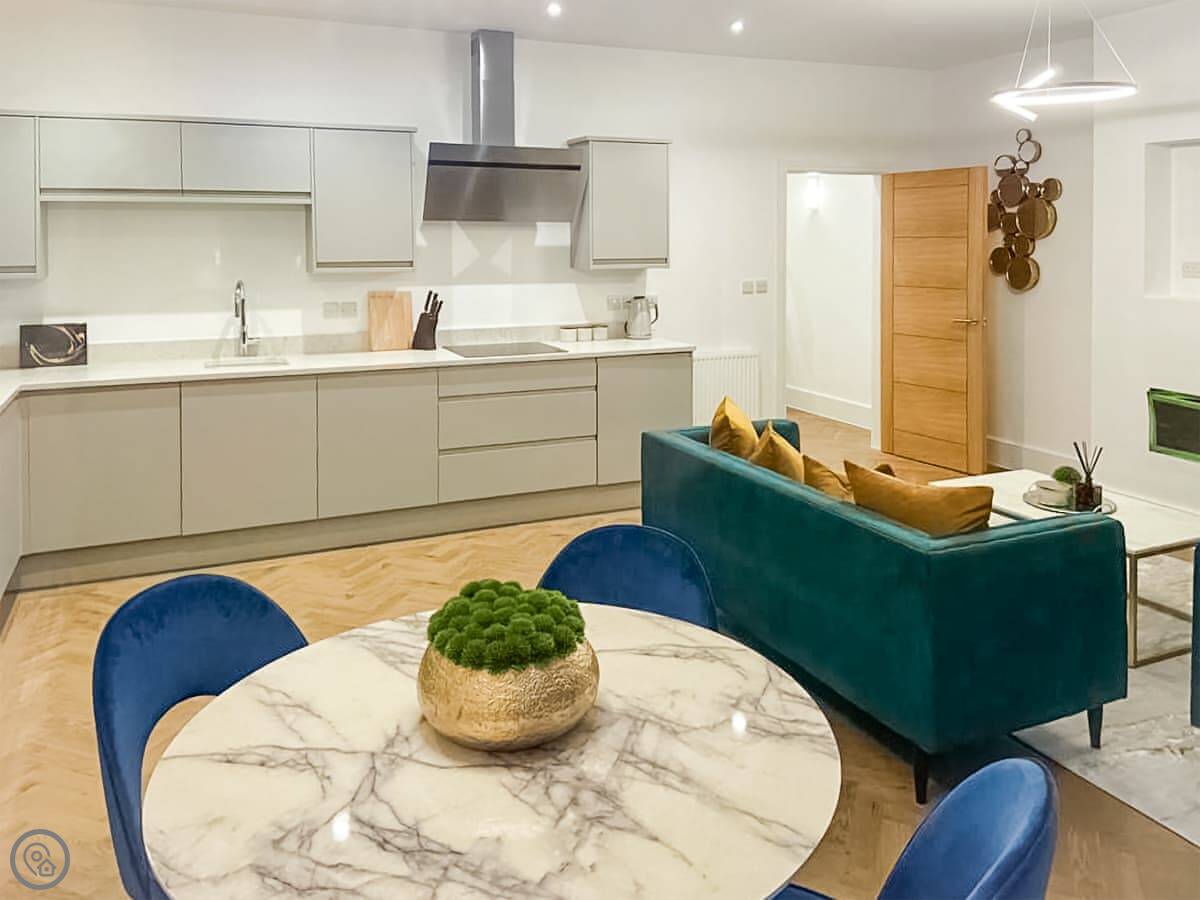 It’s a modern penthouse flat. Two bedrooms, both with kingsize beds, and two bathrooms, so one’s an ensuite. It sleeps four. The rating's 4 Star, which basically means it's comfortable and well looked after. The main room is open-plan, with a kitchen at one end. The doors at the back open onto a small decked area.