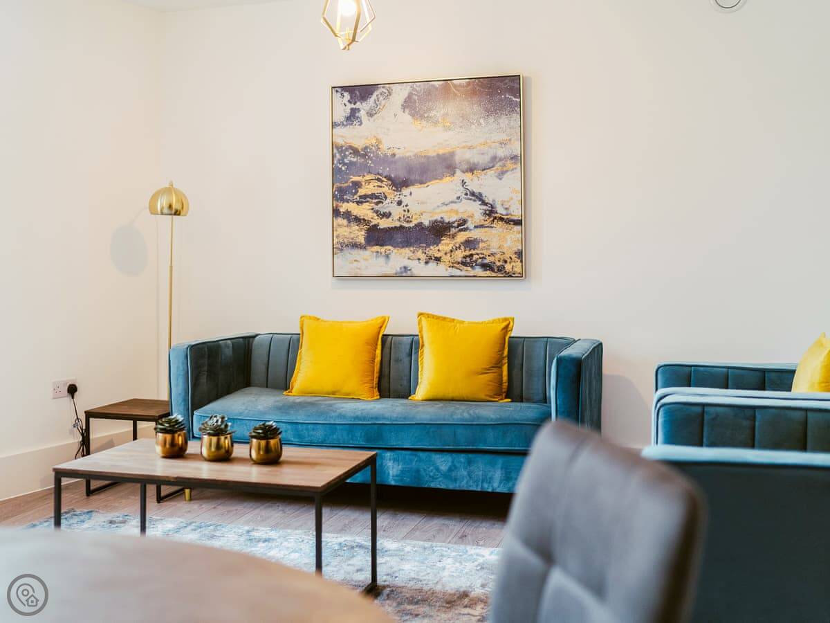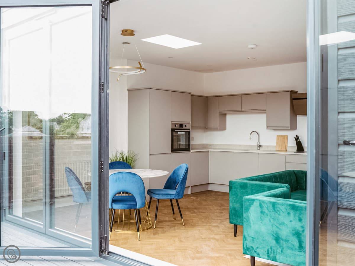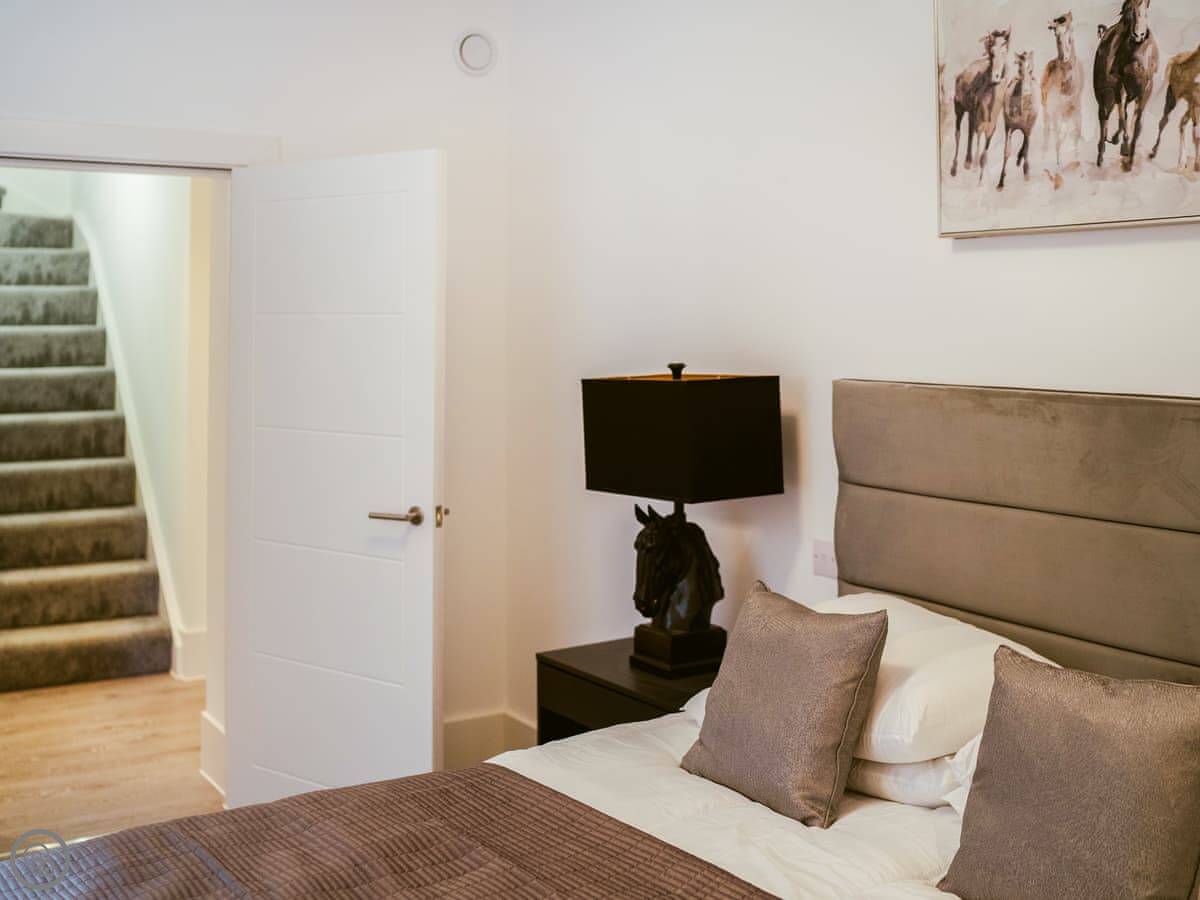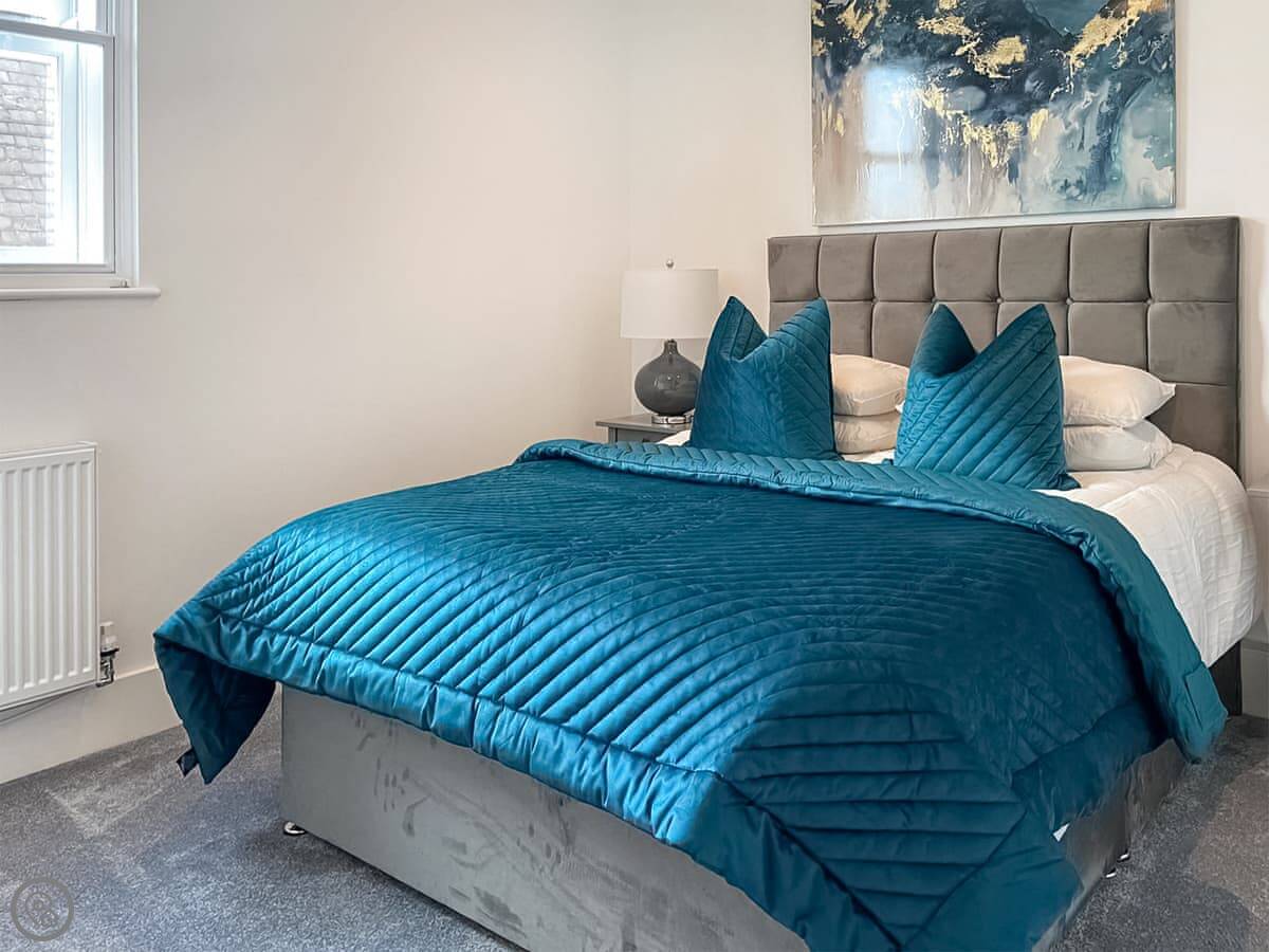 It’s a modern penthouse flat. Two bedrooms, both with kingsize beds, and two bathrooms, so one’s an ensuite. It sleeps four. The rating's 4 Star, which basically means it's comfortable and well looked after. The main room is open-plan, with a kitchen at one end. The doors at the back open onto a small decked area.