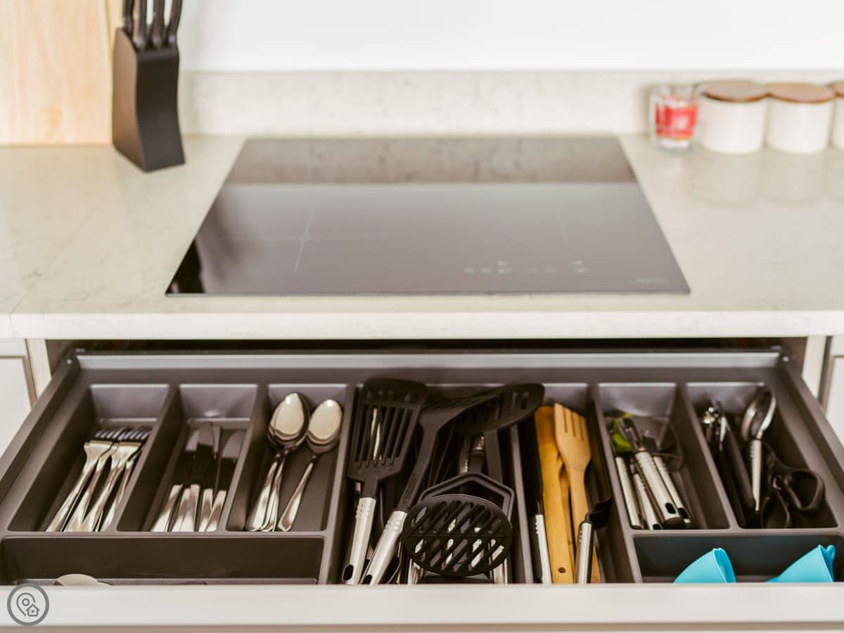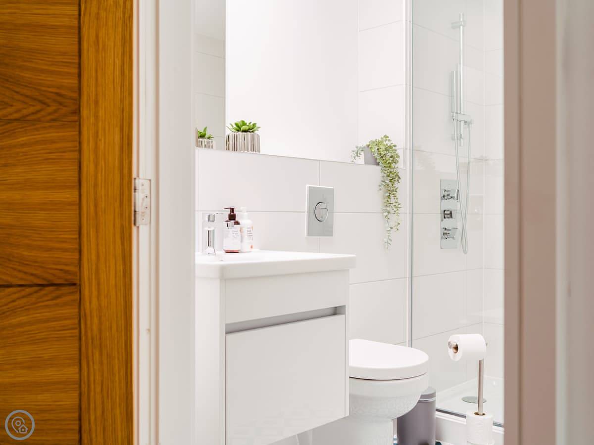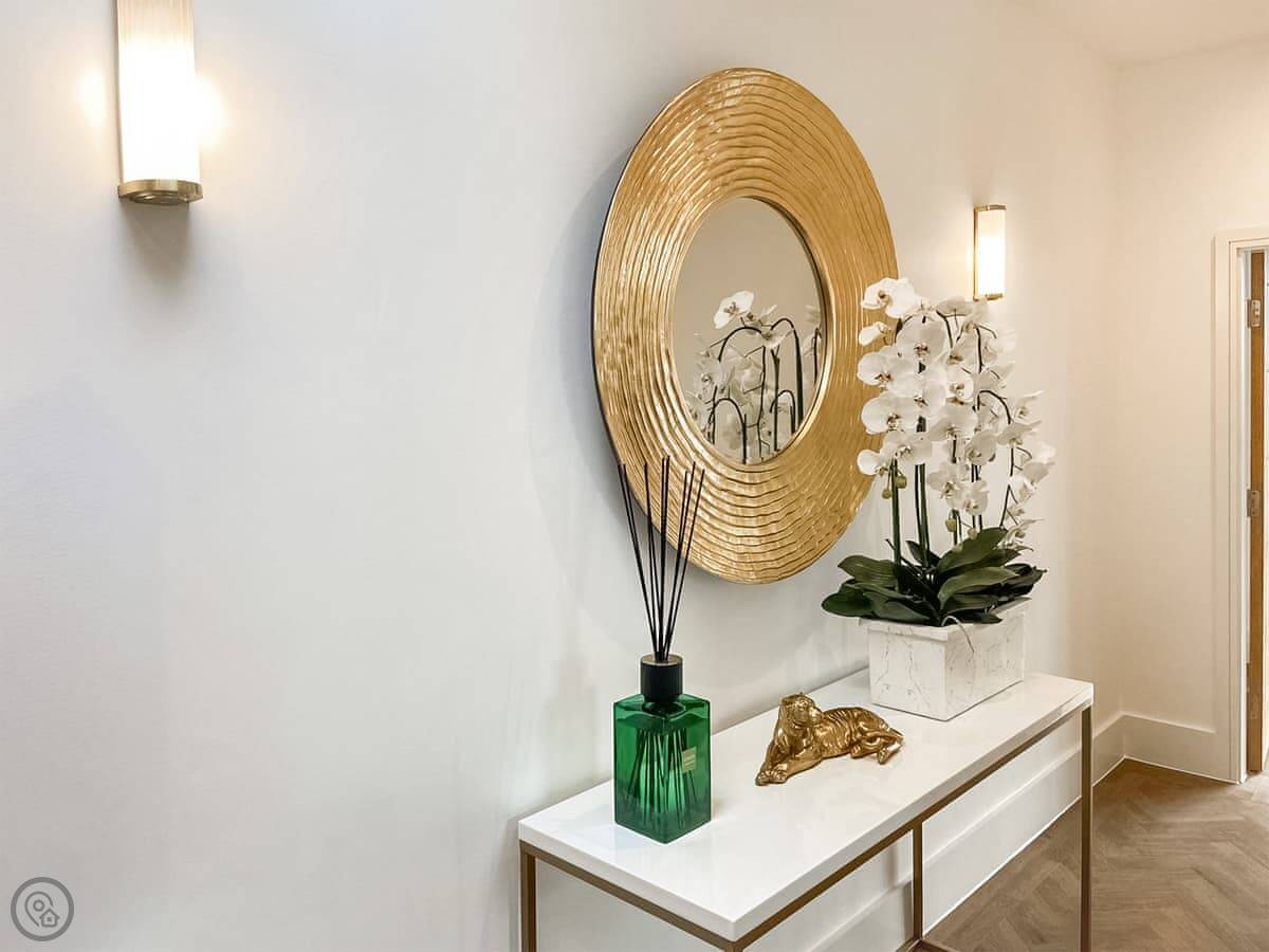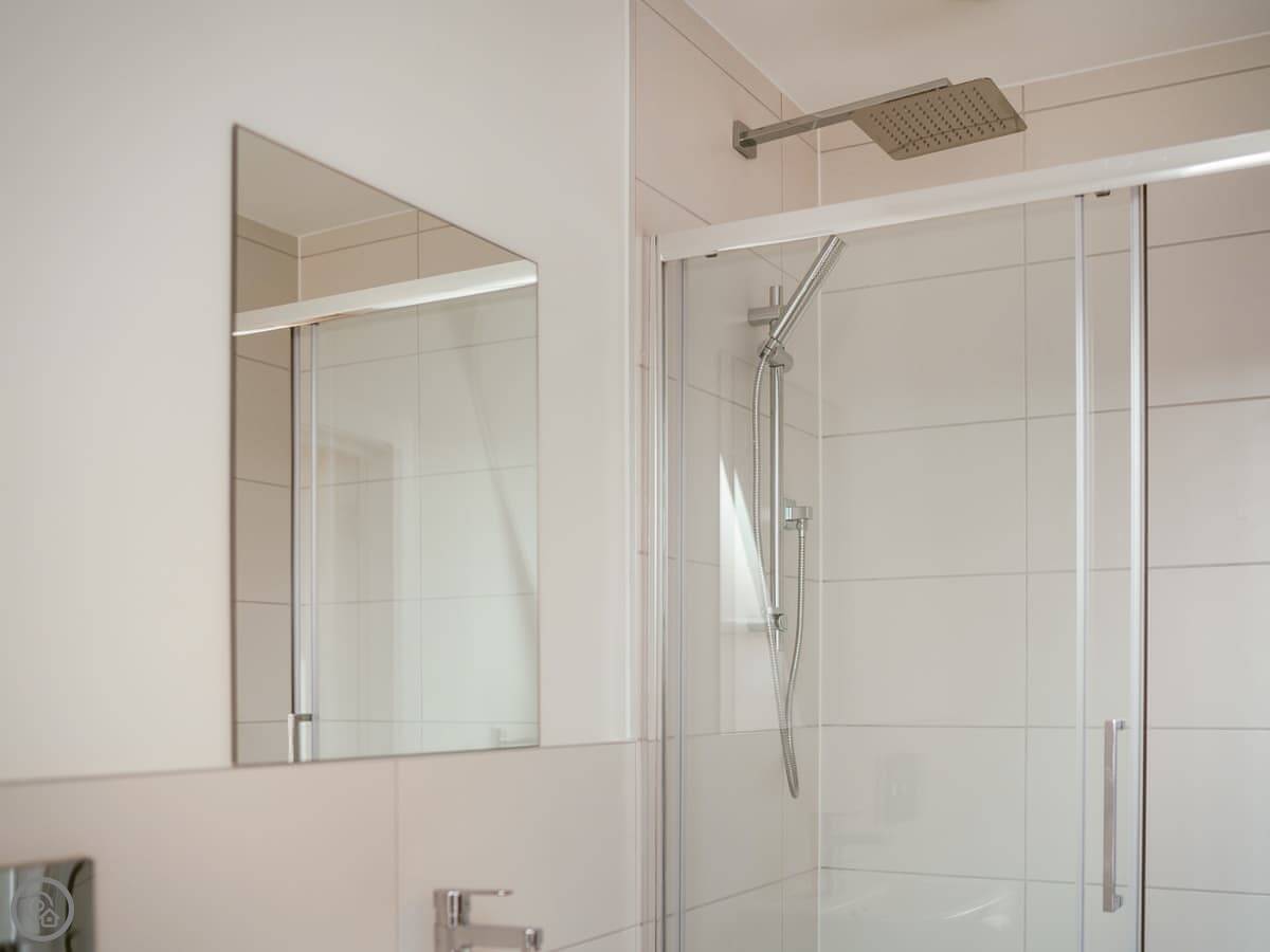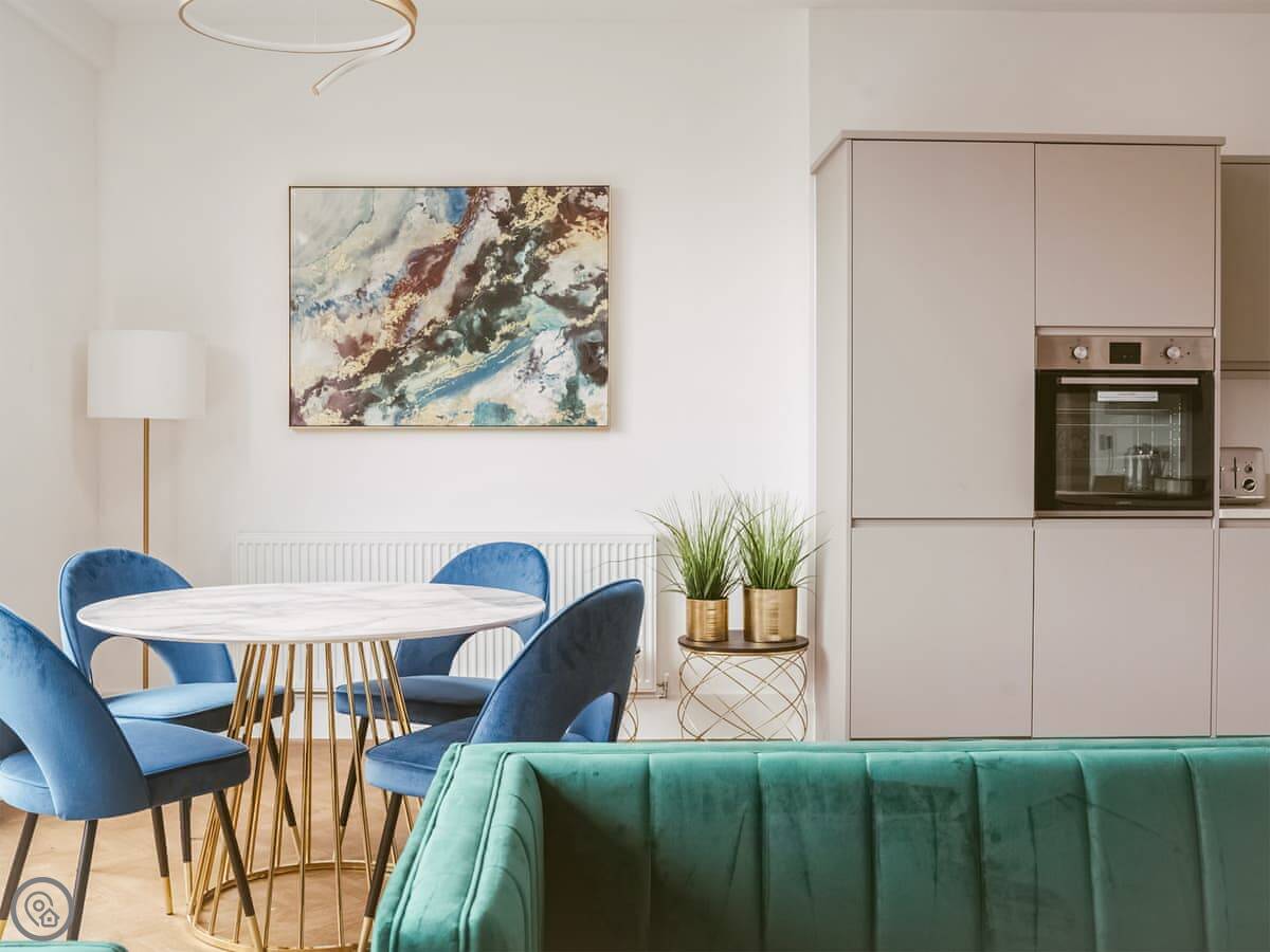 It’s a modern penthouse flat. Two bedrooms, both with kingsize beds, and two bathrooms, so one’s an ensuite. It sleeps four. The rating's 4 Star, which basically means it's comfortable and well looked after. The main room is open-plan, with a kitchen at one end. The doors at the back open onto a small decked area.