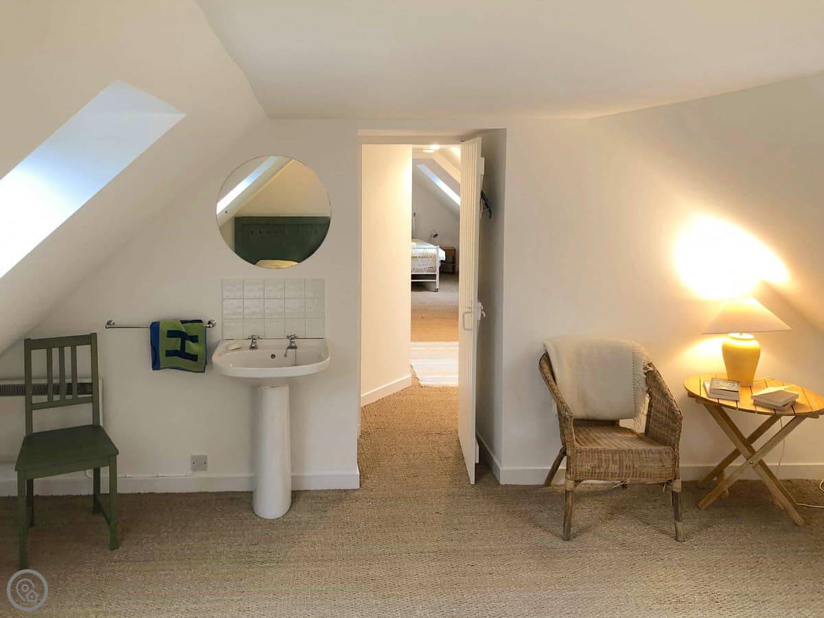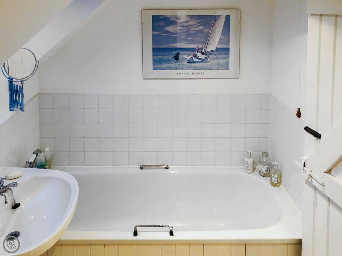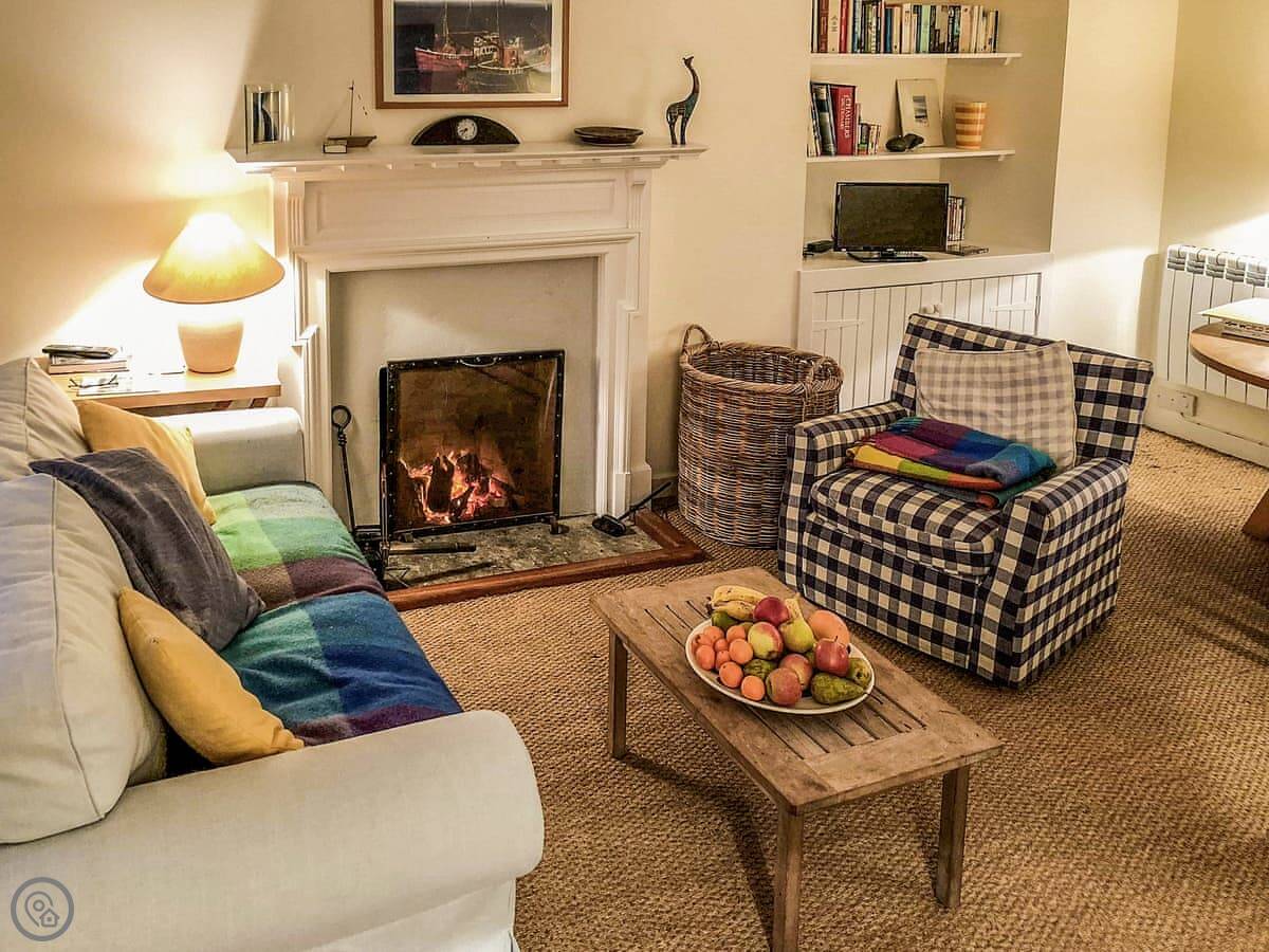 The kitchen is a good size. There's a woodburning stove in the living room. Upstairs, the bedrooms are under the eaves so the ceiling slopes a bit.