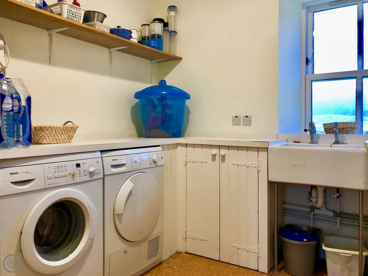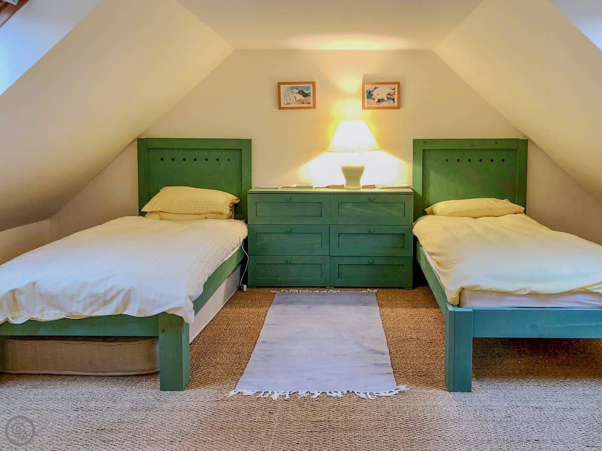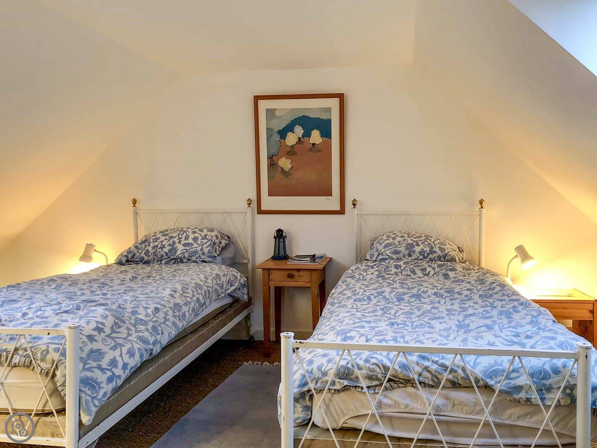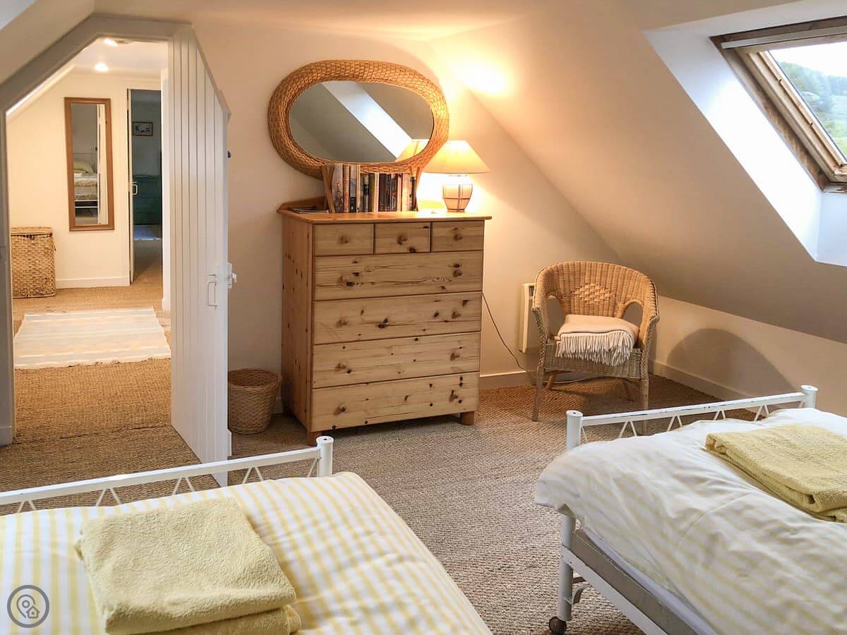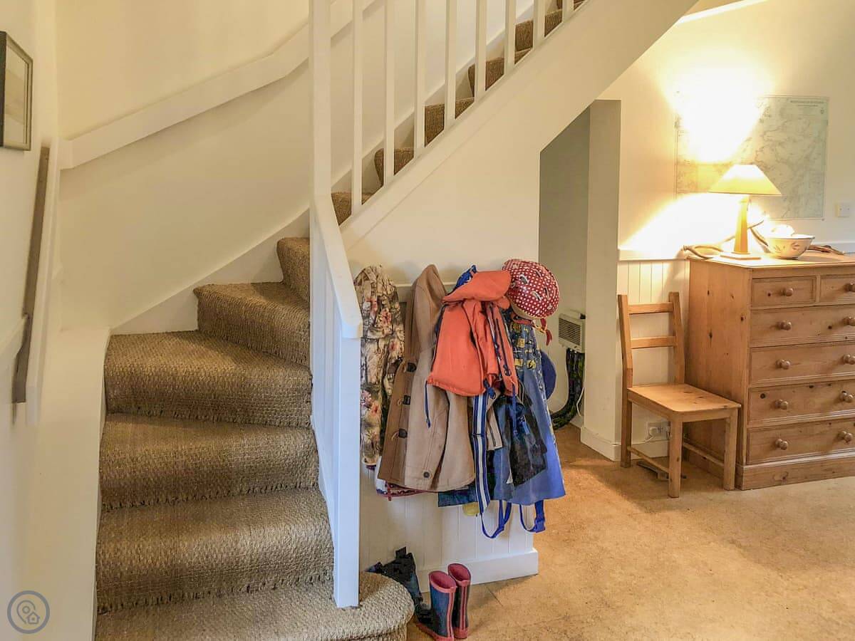 It sleeps five people. There are two bedrooms and two bathrooms. One shower room is downstairs. It's a 4 Star place, so it's comfortable and well-equipped. You can bring up to two dogs.