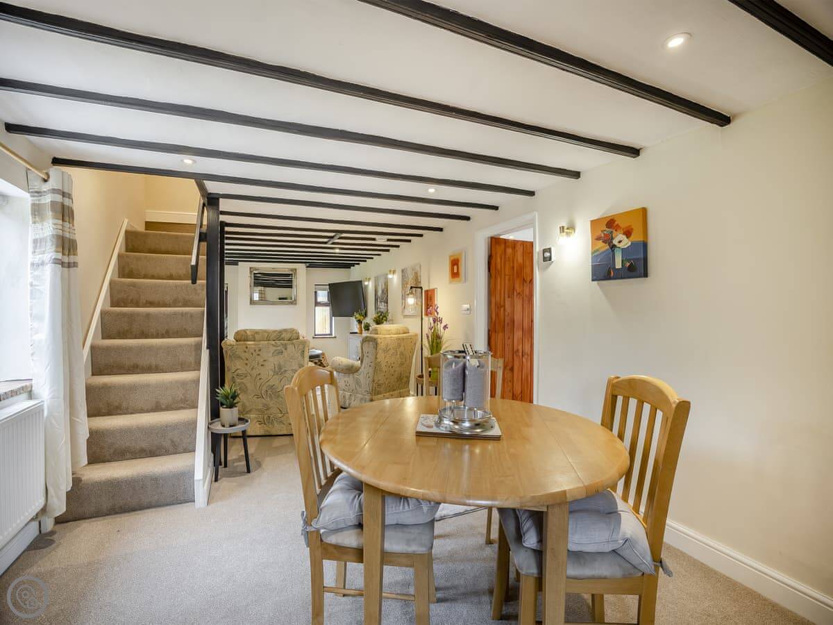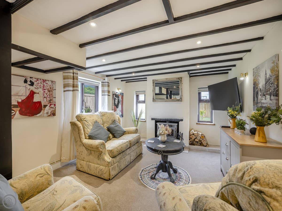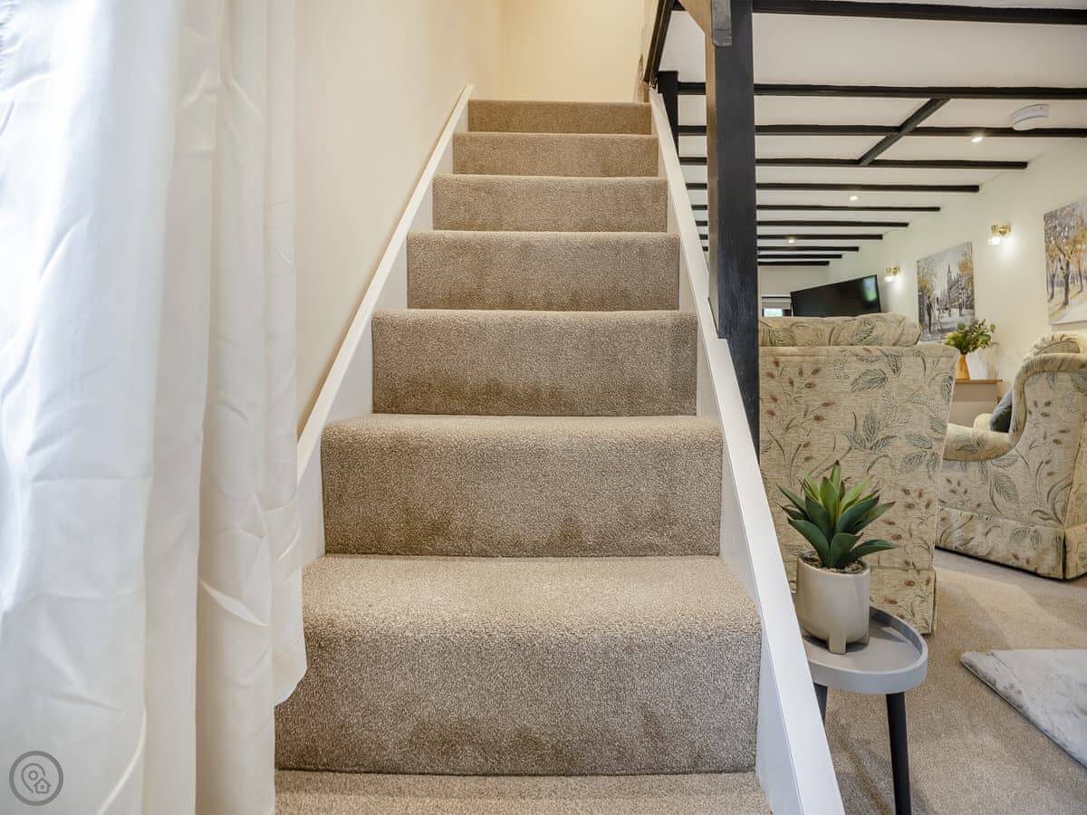 It sleeps four. Two bedrooms upstairs, both doubles. Both have their own bathrooms, one is an en-suite to the main bedroom. There's also a third bathroom downstairs with a bath. It's got a 4 Star rating. We've tried to keep the original feel but make it comfortable, so there's a wood burner in the living room and USB points by the beds. The stairs are the original cottage stairs, so they turn a corner and are a bit steep.