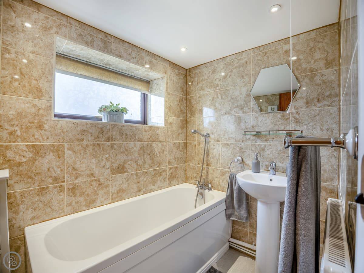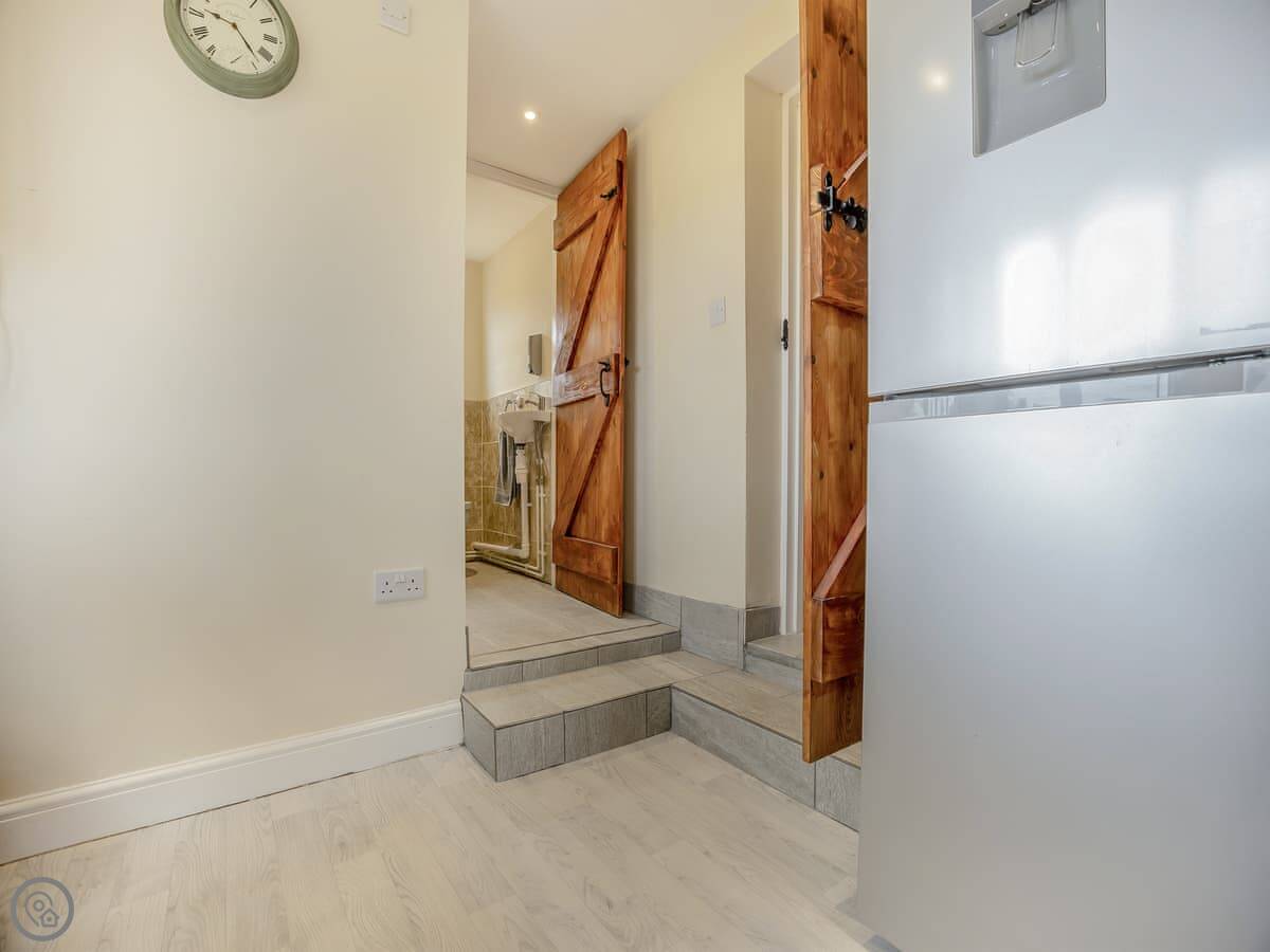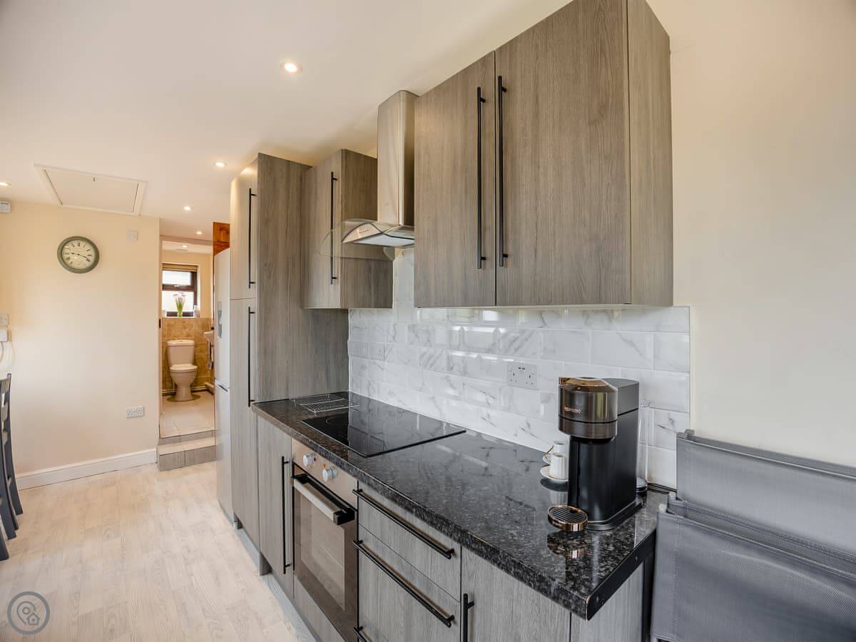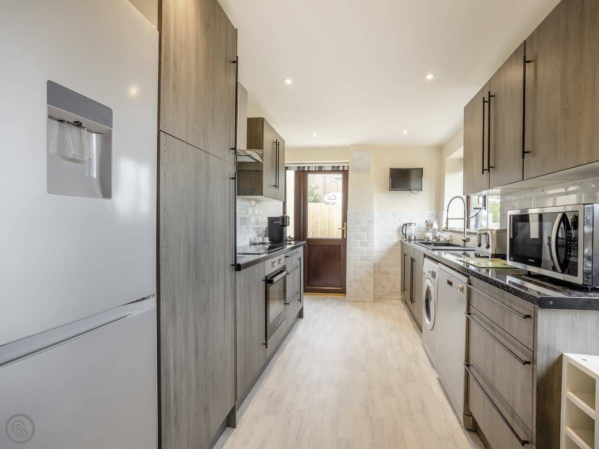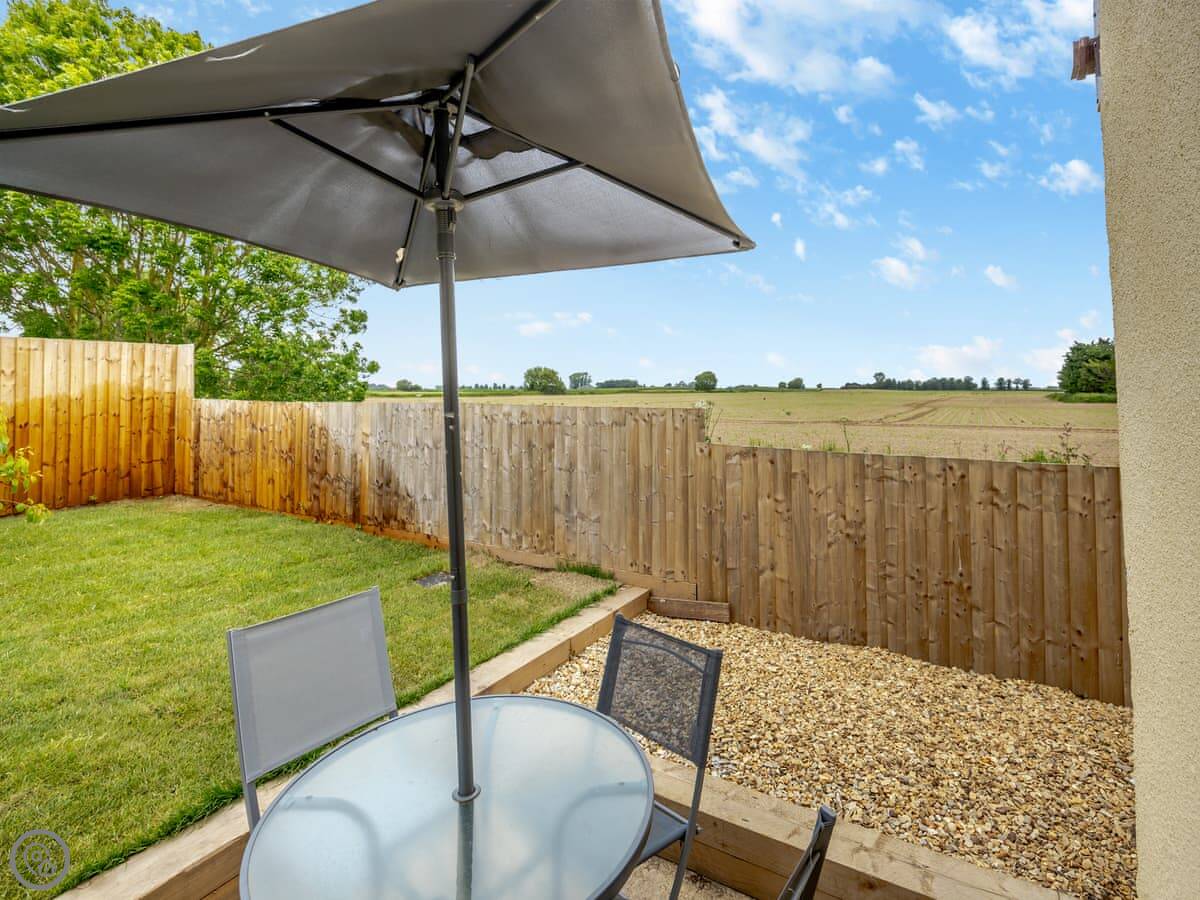 The kitchen is modern and has a dishwasher and washing machine. Doors lead out to the back garden. It's enclosed, with a patio and a bit of lawn. It looks out over the fields. You get good sun in the afternoon.