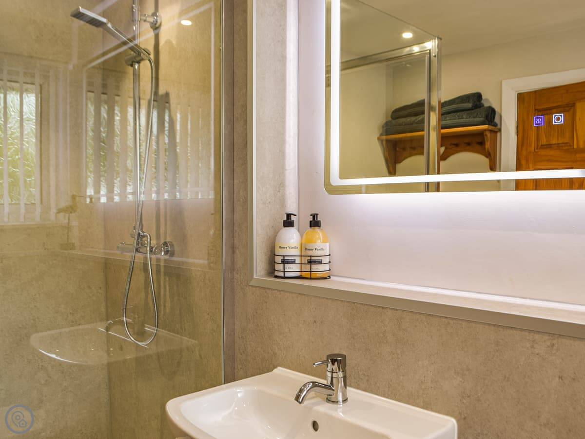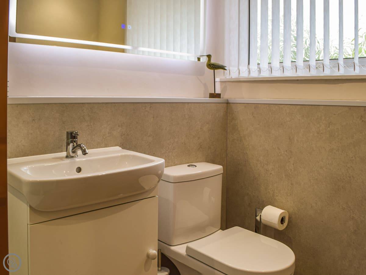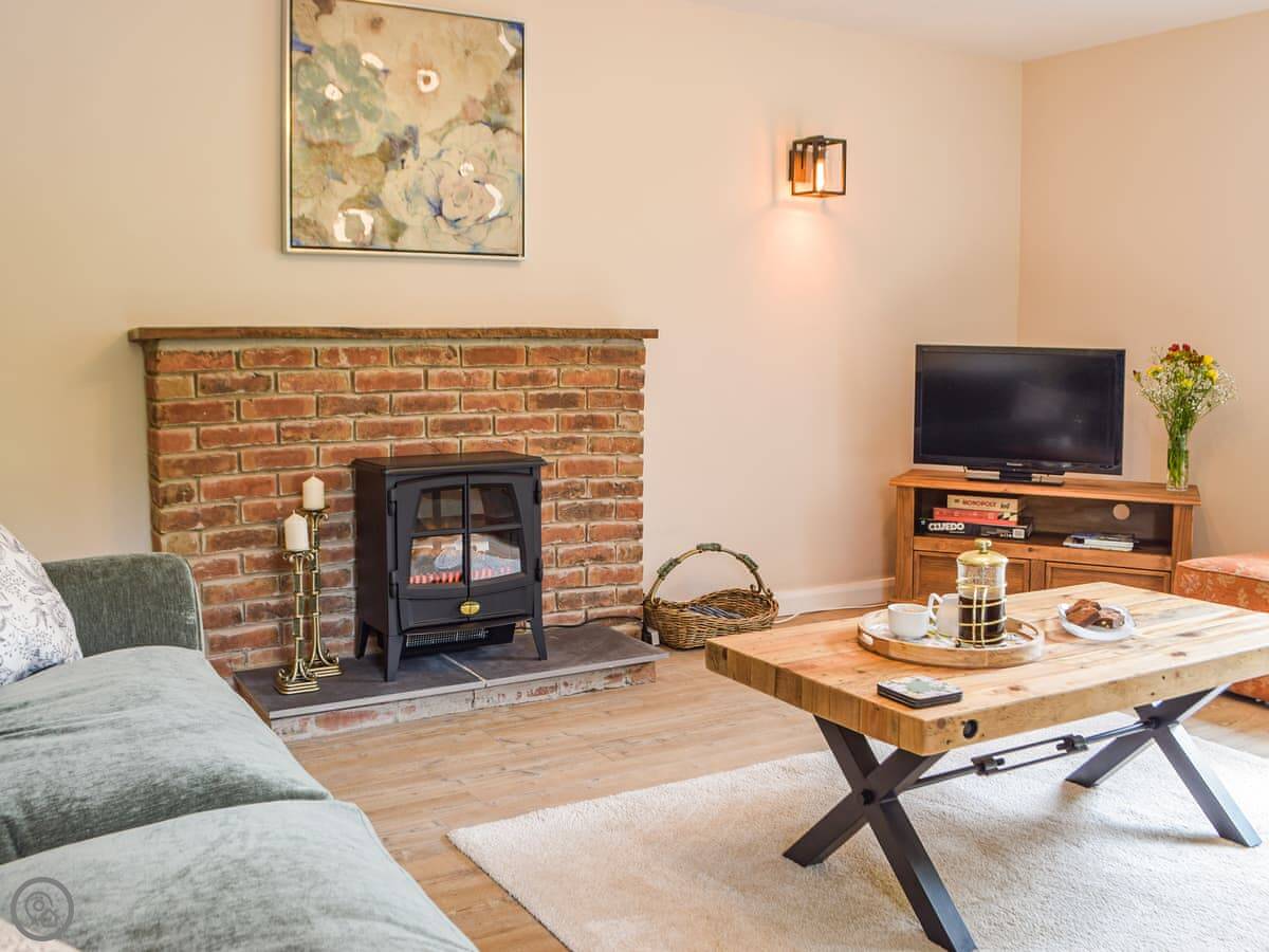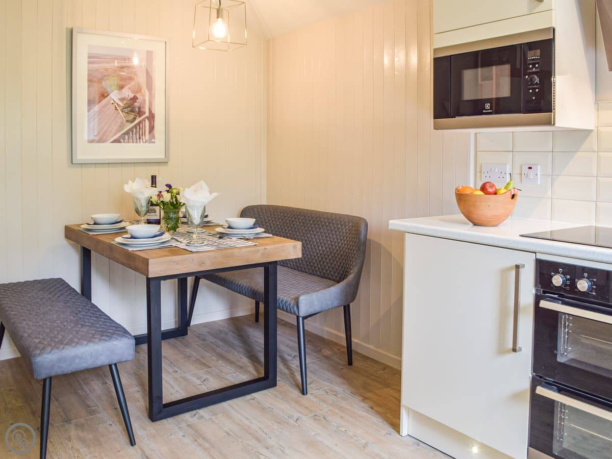 It's got a kitchen with a dishwasher. Open plan with the dining area. There's a wood burner, it's electric. TV has internet so you can use your streaming things. WiFi is included.