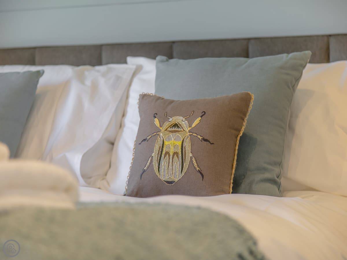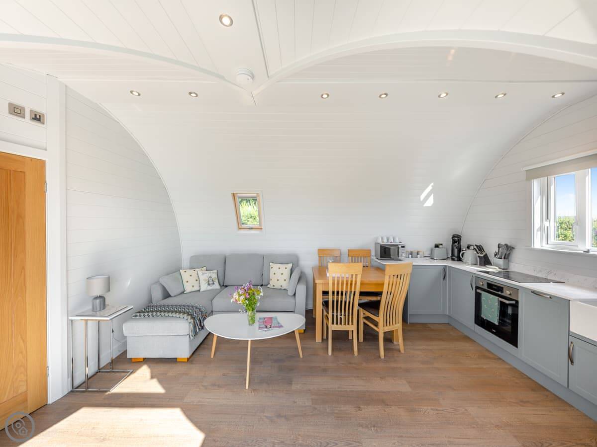It's got a 4 Star rating. It's new and clean, so that's what that means. One bedroom, one shower room. The kitchen's open to the living area. There are big doors so you can see the view from inside. It's got a dishwasher, WiFi, and parking.