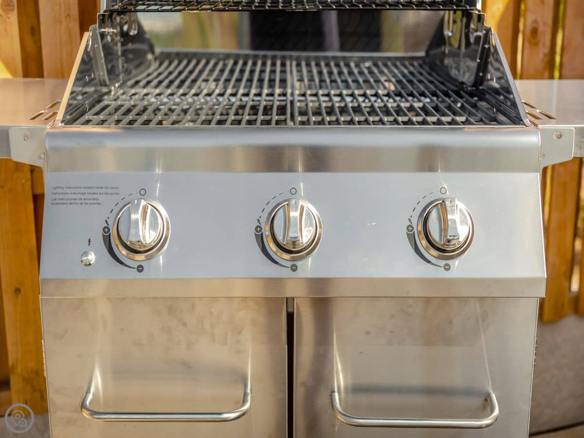 Outside, there's a deck with a table and chairs, a lawn, and a wood-fired hot tub. You can bring one dog.