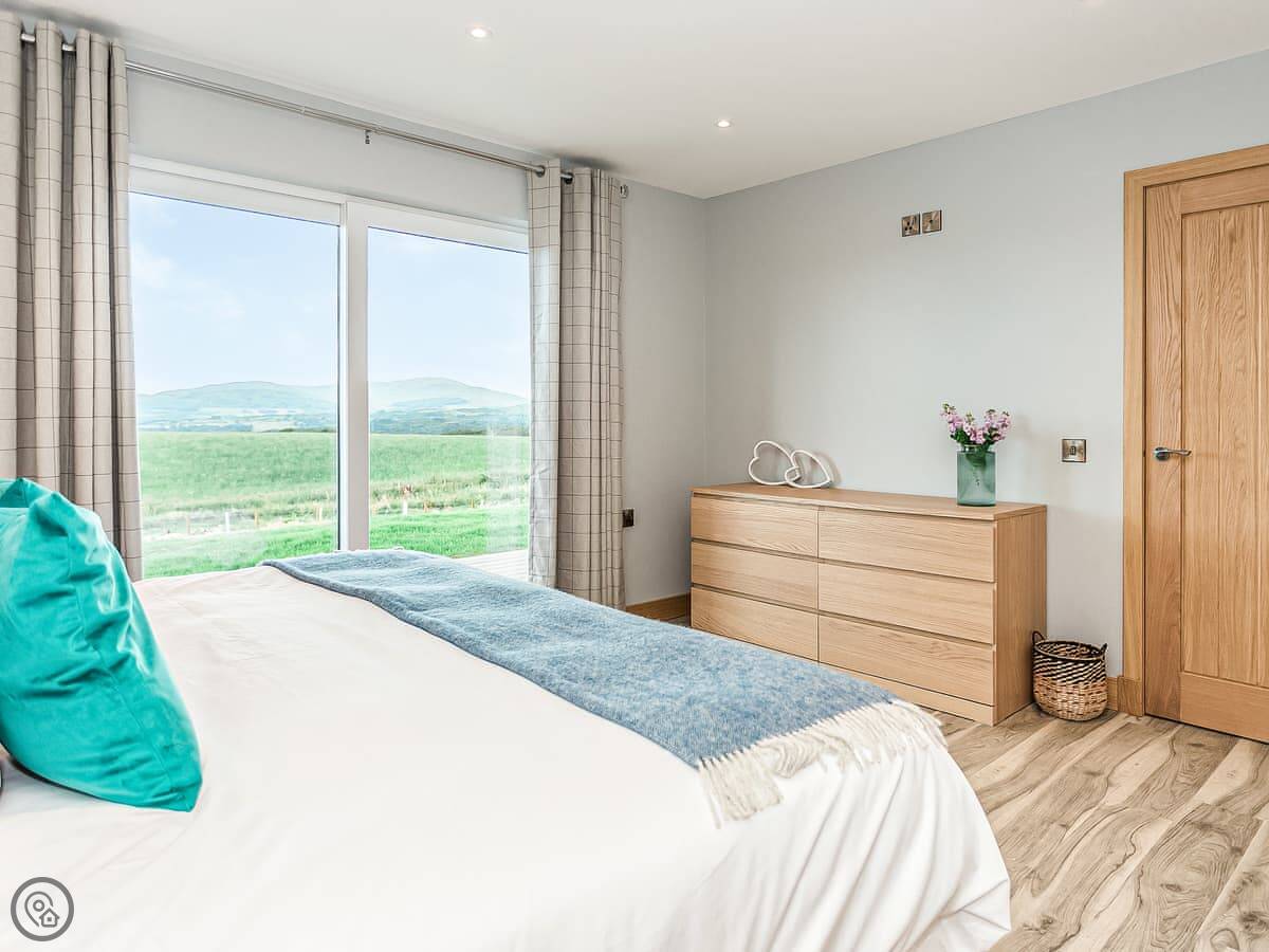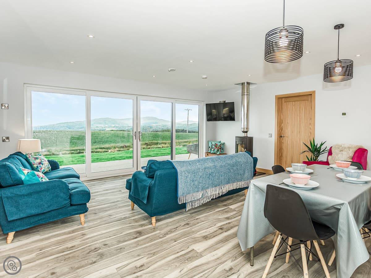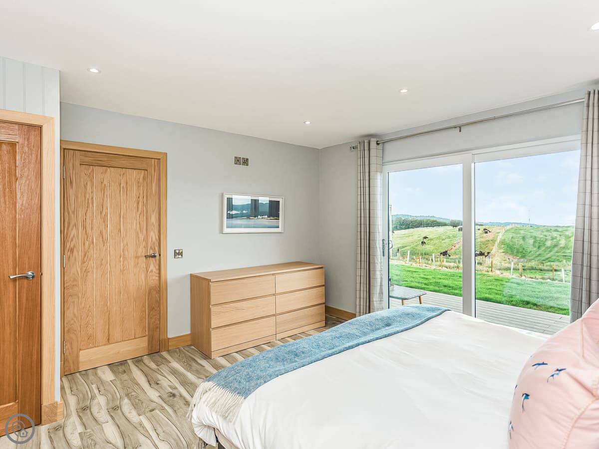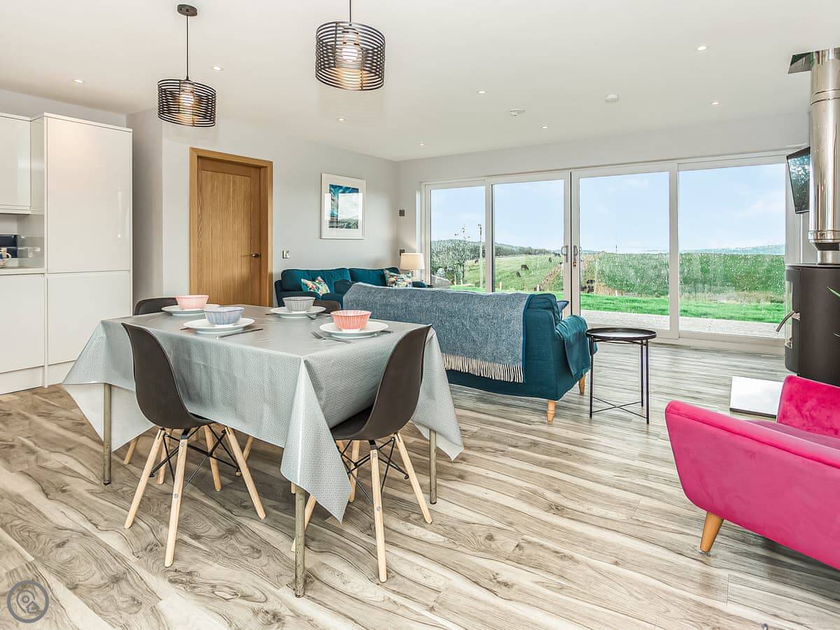 High Tide is a new lodge built in 2023 on our farm. It's detached, so you're on your own. The main thing is the view over Fleet Bay. There are big doors everywhere so you get the full effect, especially when the sun sets.
