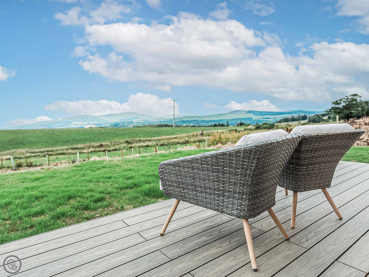 The place is built to a high standard. The beds are very comfortable. It's open plan inside, with a kitchen, dining and sitting area all in one room looking out at the bay. Outside there's a large deck.