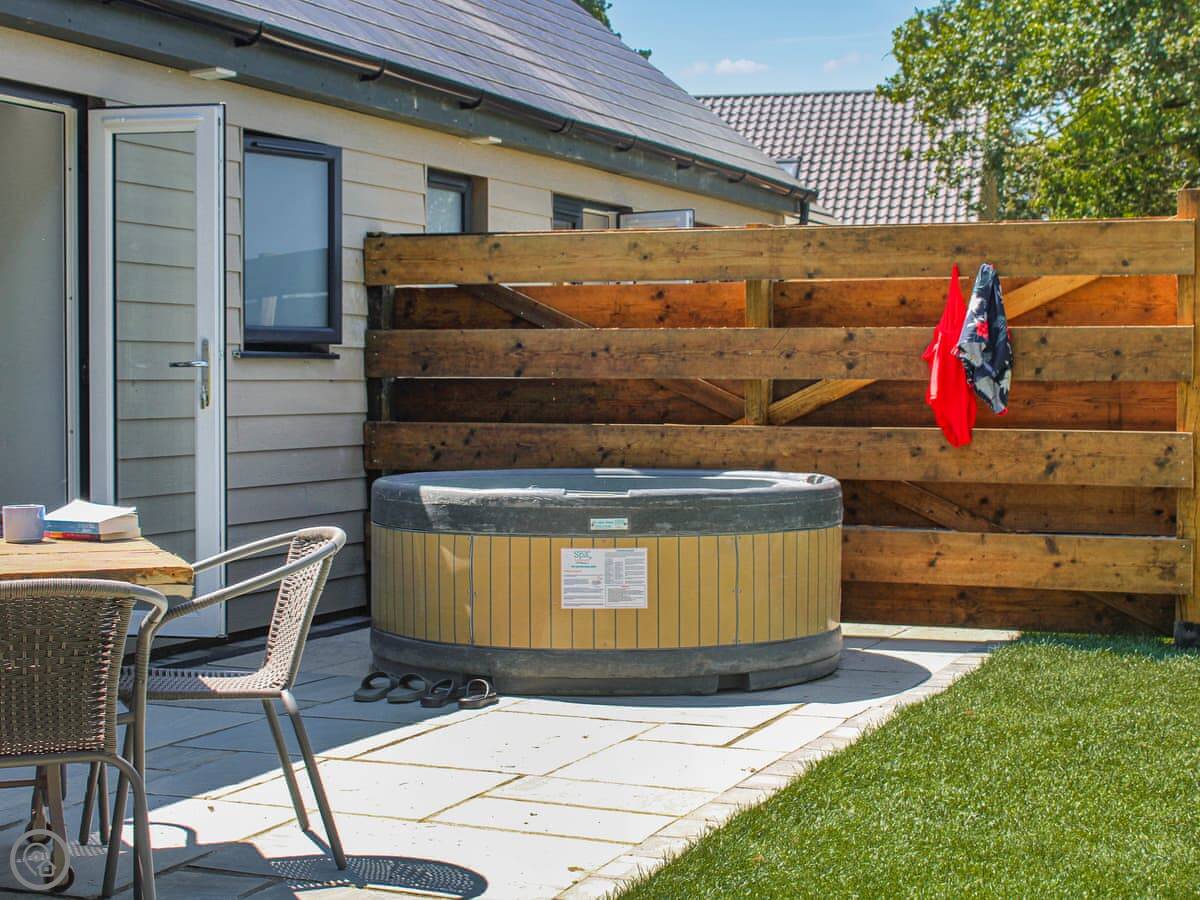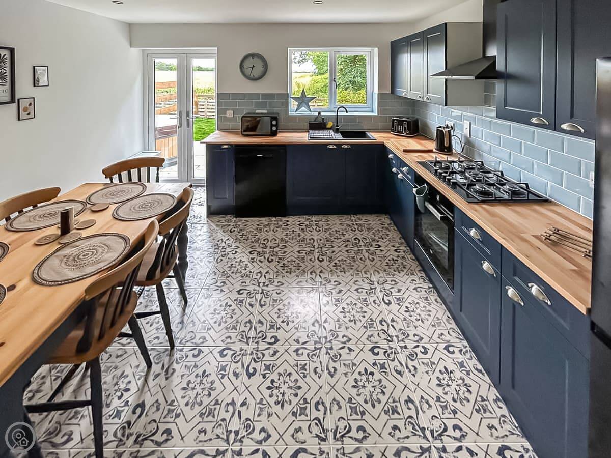 Downstairs is all open plan, kitchen, dining and living area together. It's a good size for a family. The kitchen has a dishwasher and washing machine. There's a hot tub you can hire for your stay, it's in the garden.