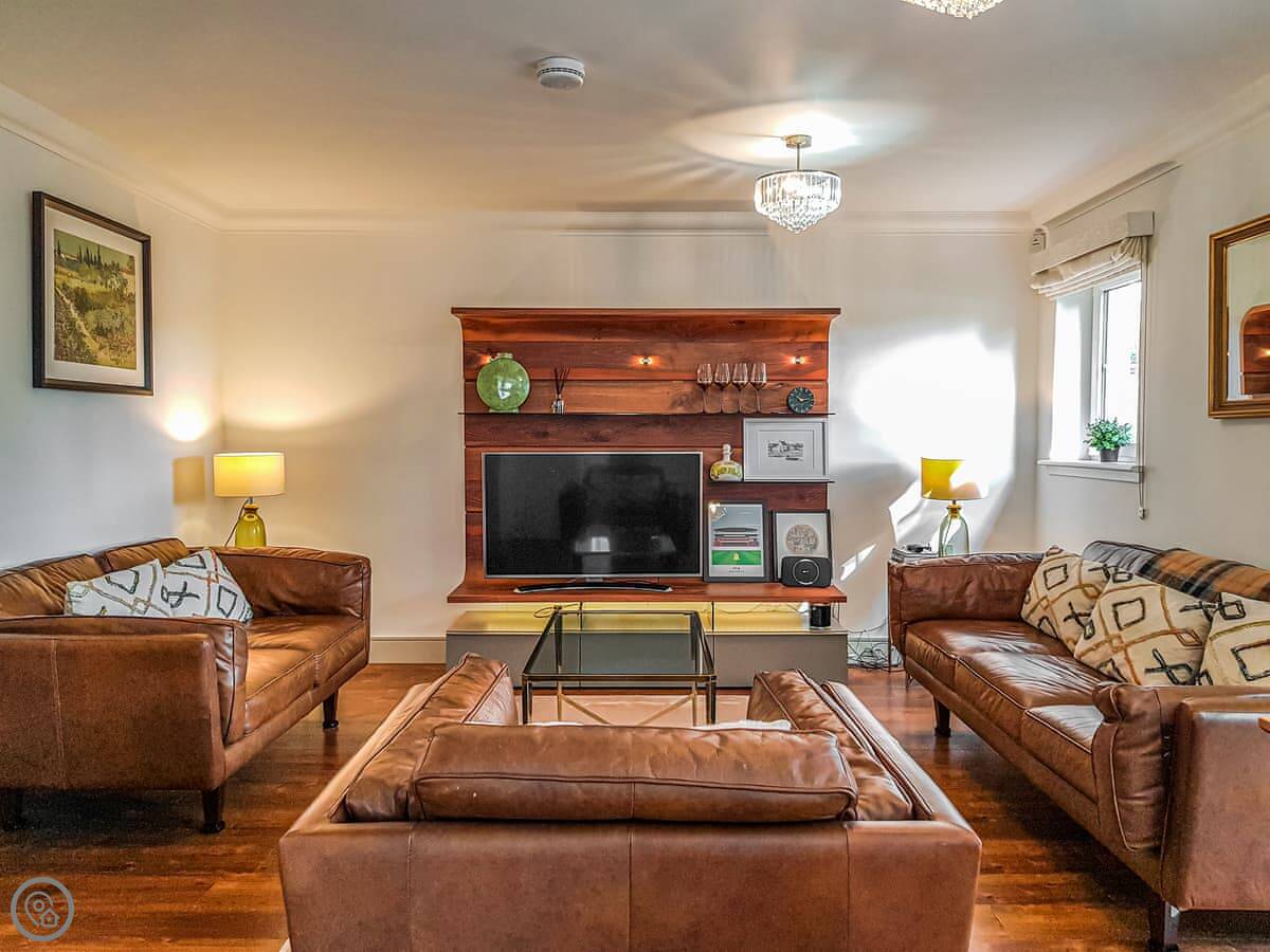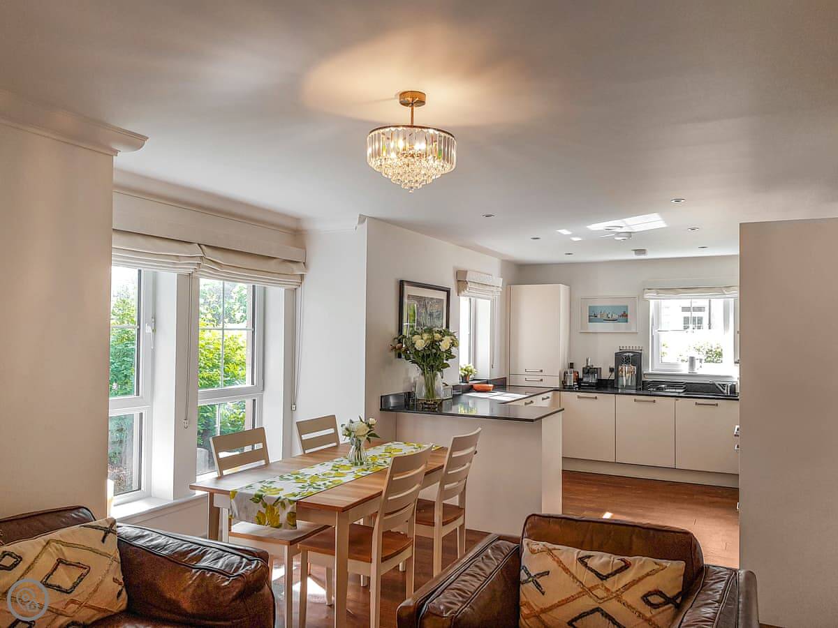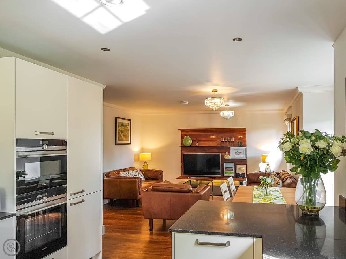 The living area is open plan. It's bright. There's a TV, WiFi, a washing machine, and a dishwasher. All bedding and towels are included.