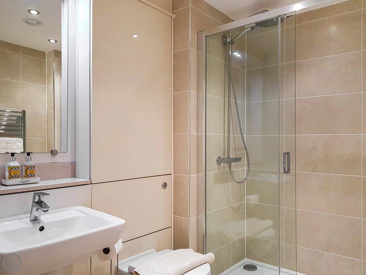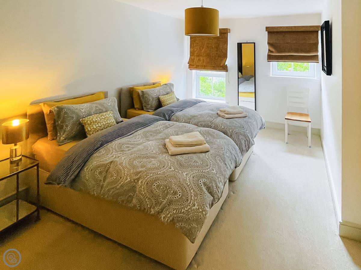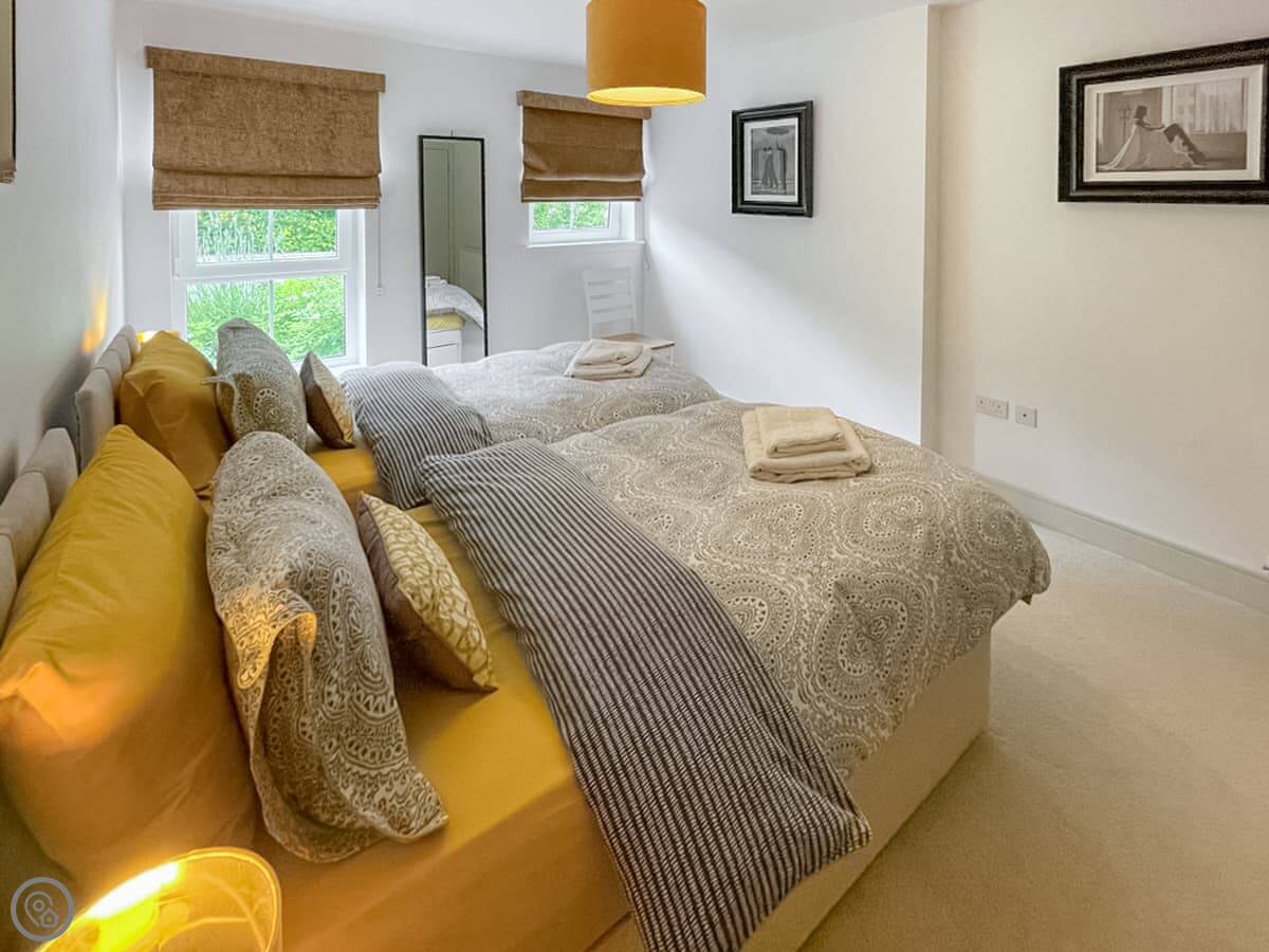It sleeps four. Two bedrooms. One's a double with an en-suite shower room, the other has twin beds. There's a second bathroom with a walk-in shower. Everything's on one level.