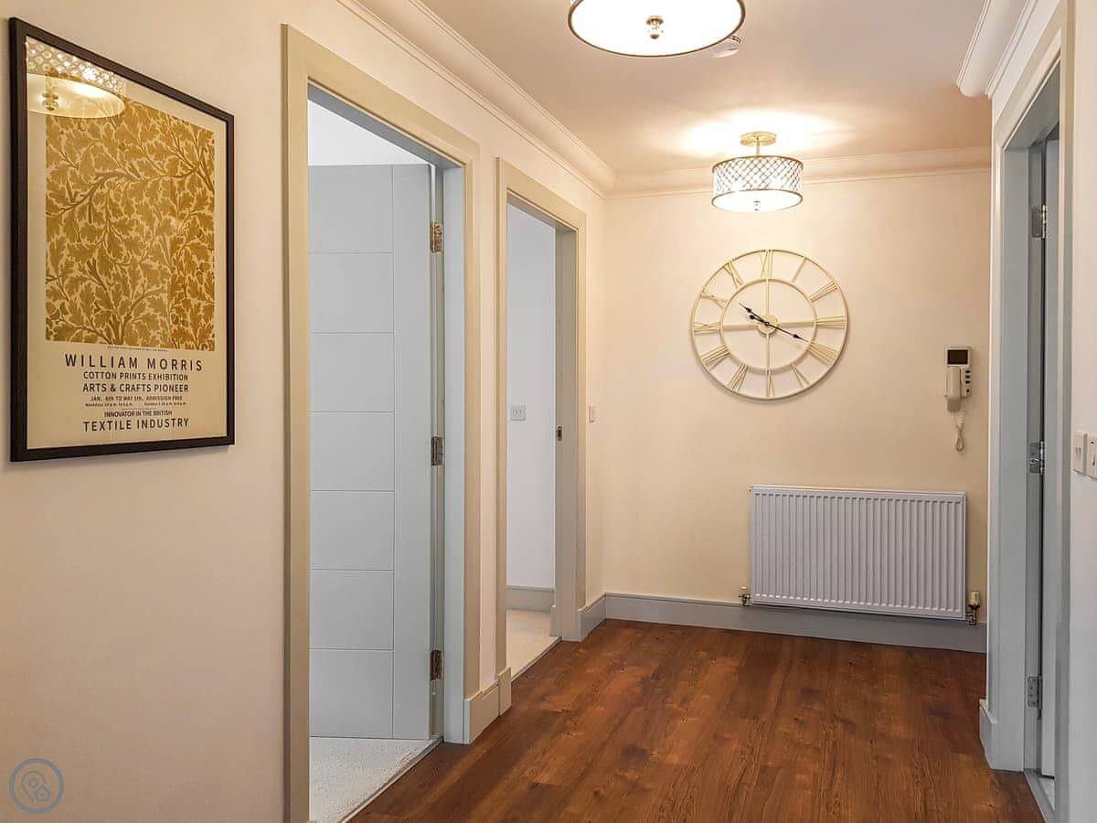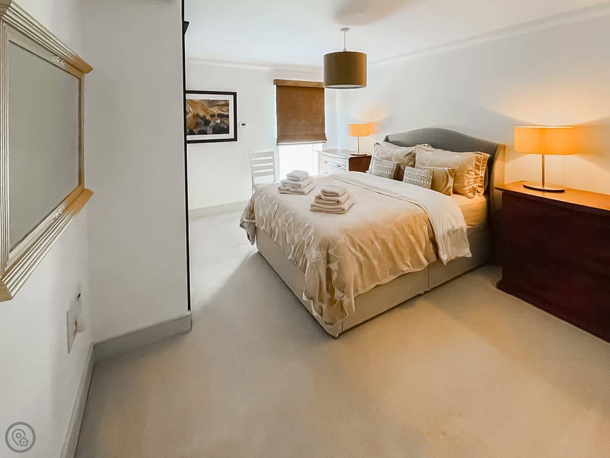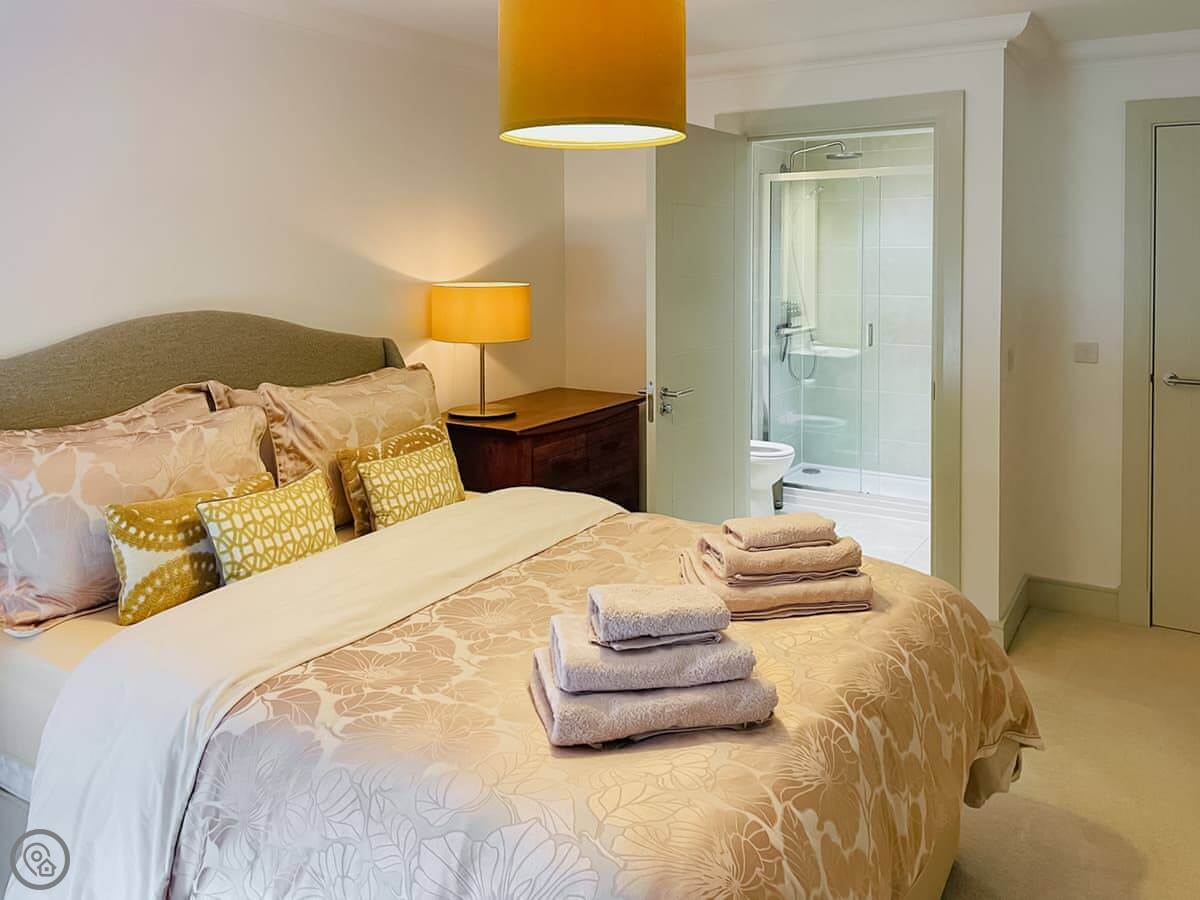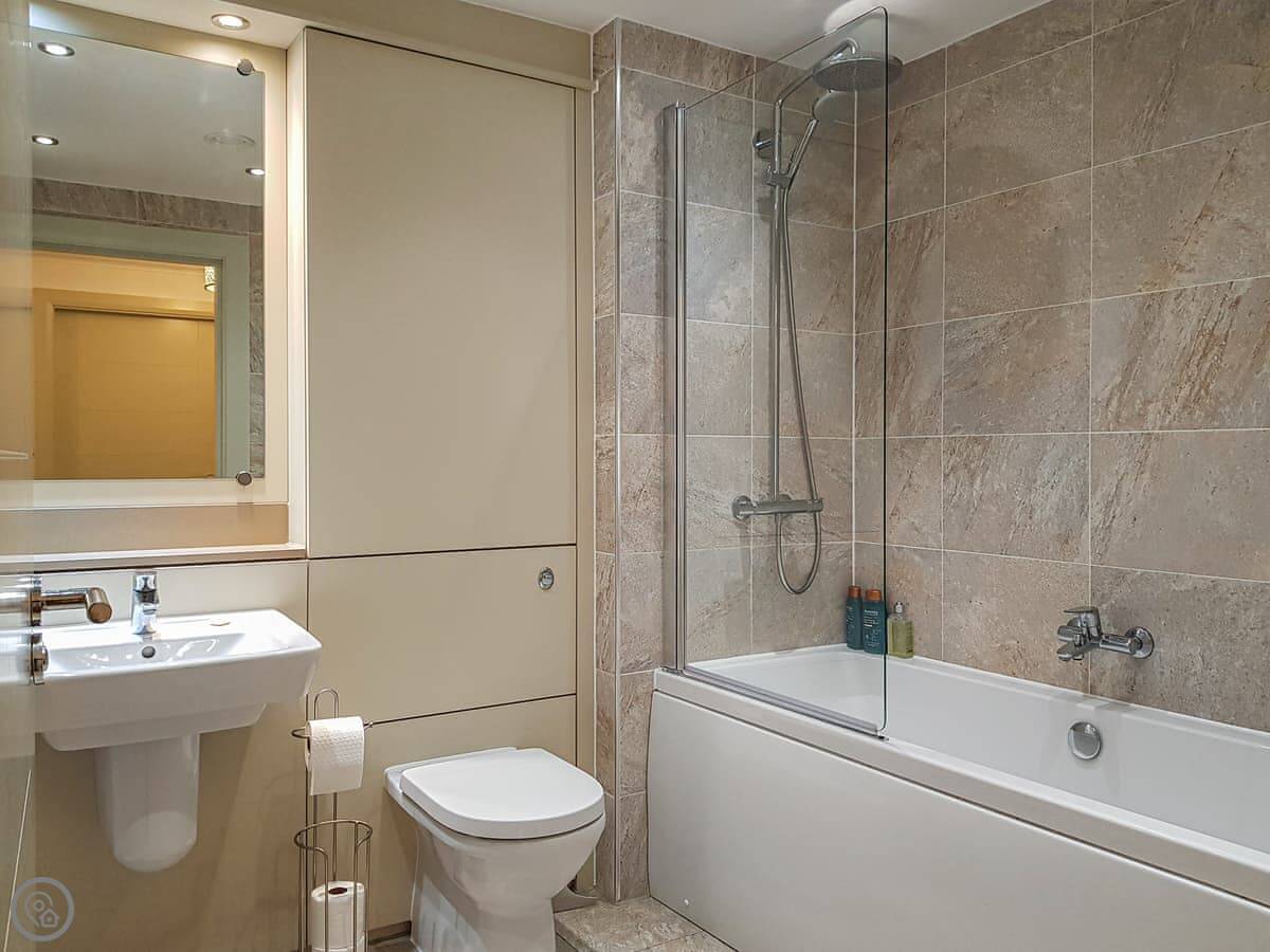 It sleeps four. Two bedrooms. One's a double with an en-suite shower room, the other has twin beds. There's a second bathroom with a walk-in shower. Everything's on one level.