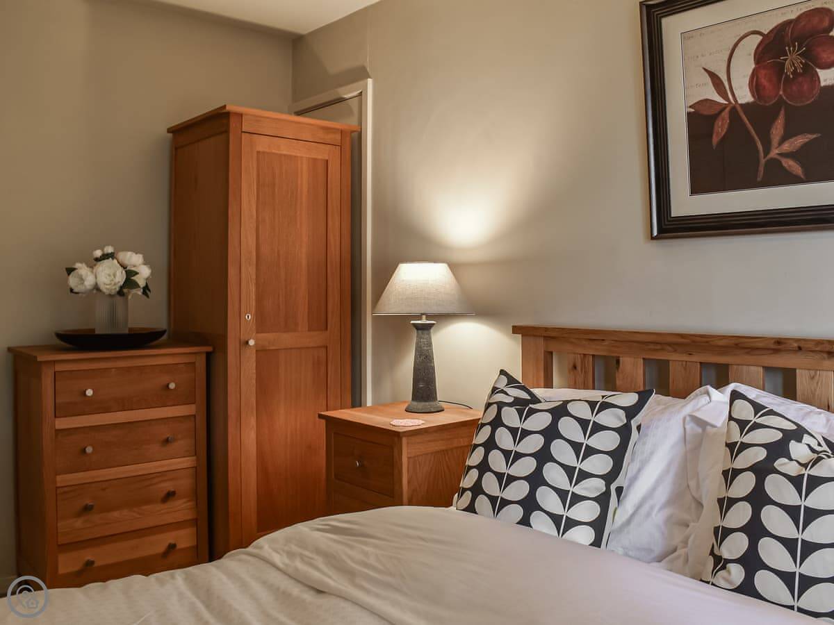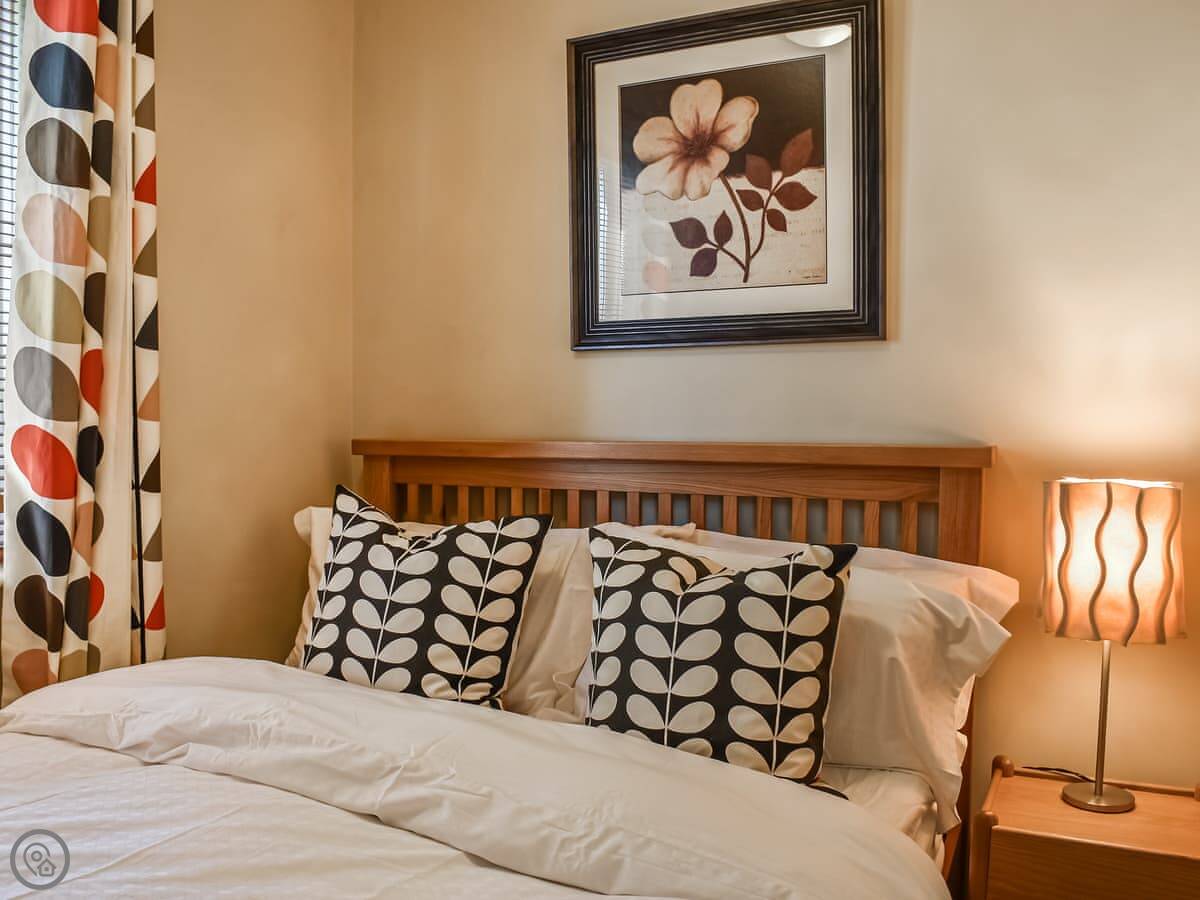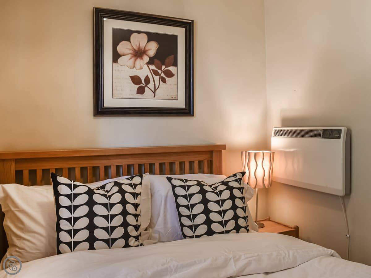 It sleeps four, in two double bedrooms. There's one bathroom with a bath and an electric shower. It's got a 4 Star rating. The place is compact, but it's been done up. The kitchen is new. The living area opens onto a west-facing balcony. You get a view of the lake from there, and it catches the afternoon sun.