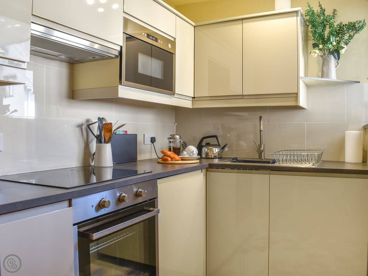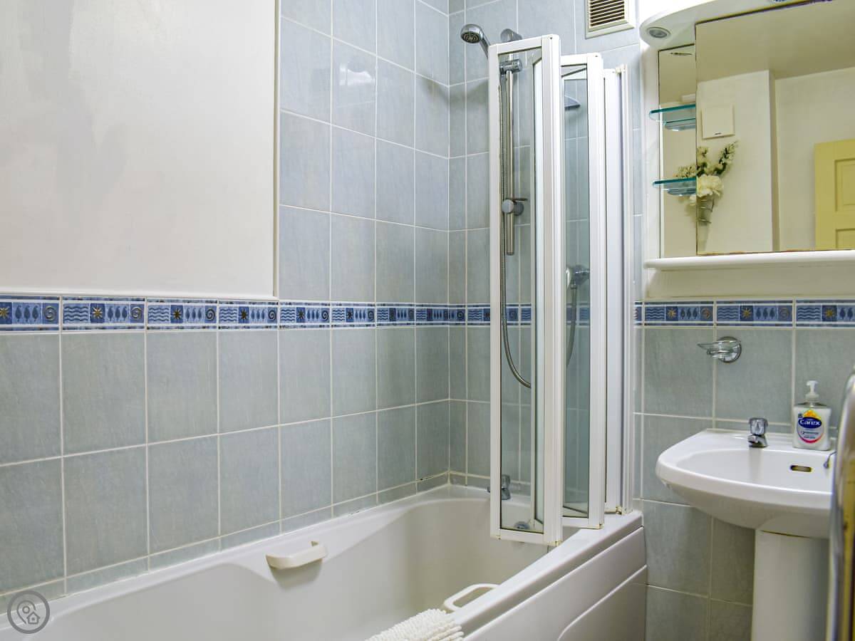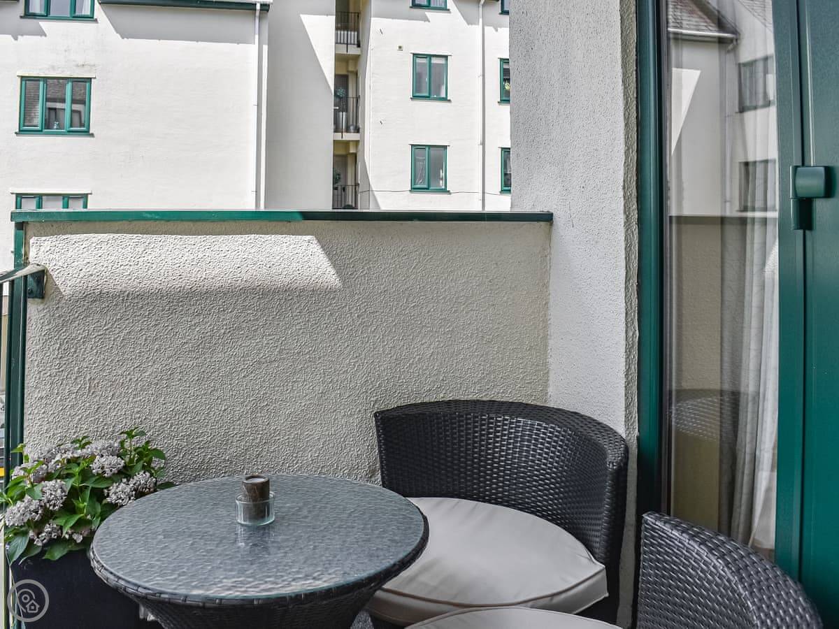 It sleeps four, in two double bedrooms. There's one bathroom with a bath and an electric shower. It's got a 4 Star rating. The place is compact, but it's been done up. The kitchen is new. The living area opens onto a west-facing balcony. You get a view of the lake from there, and it catches the afternoon sun.